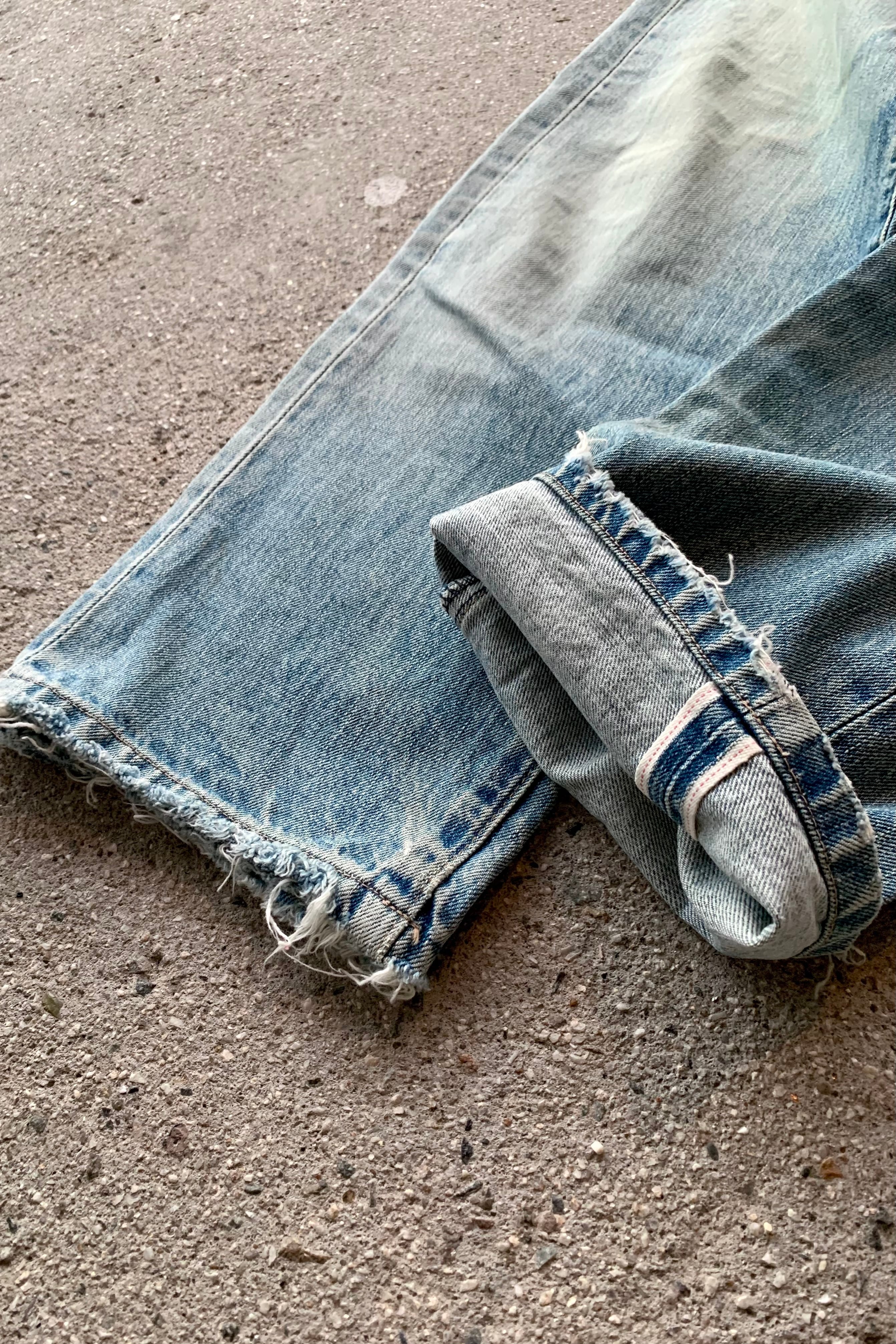 色は激しく落ちたグリーンブルーのハードな色落ち具合の502XX。ヒゲの表情、裾具合、ダメージバランスも良く取れた一本になります。
