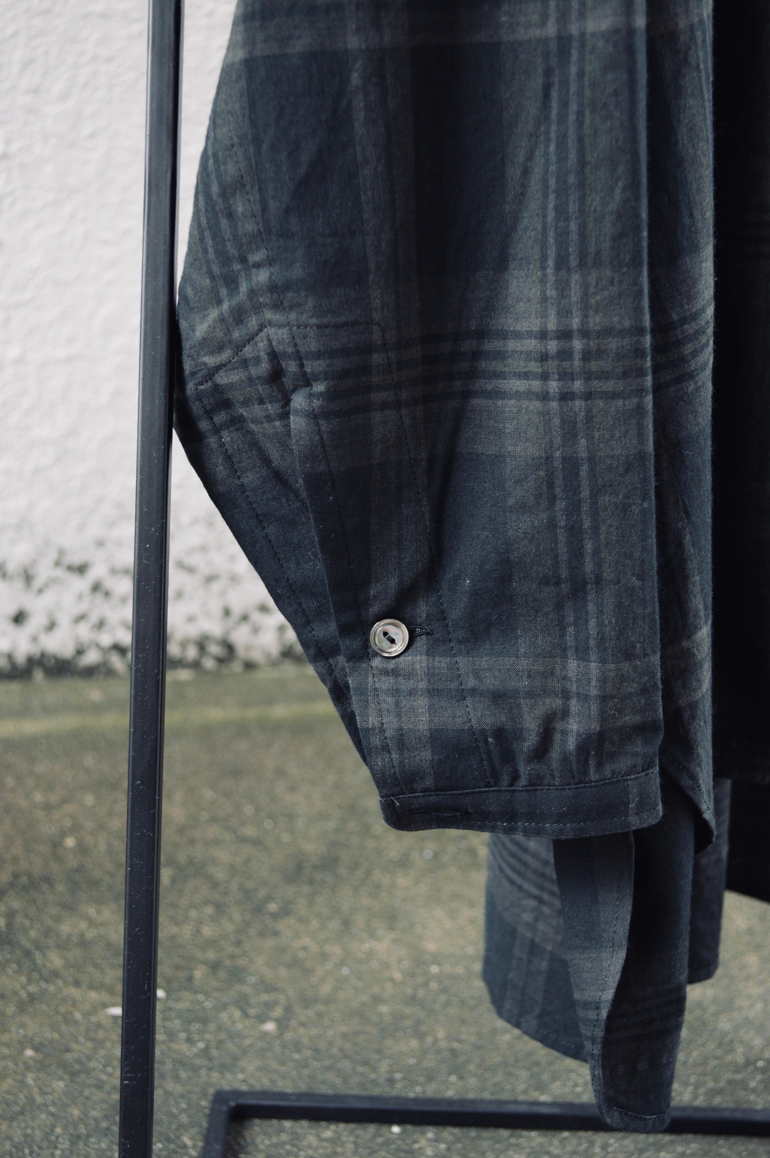 自然体な墨色のブラックグレートーンのマドラスチェックでシンプルなデザインに一工夫ある墨汁染めのシャツです。