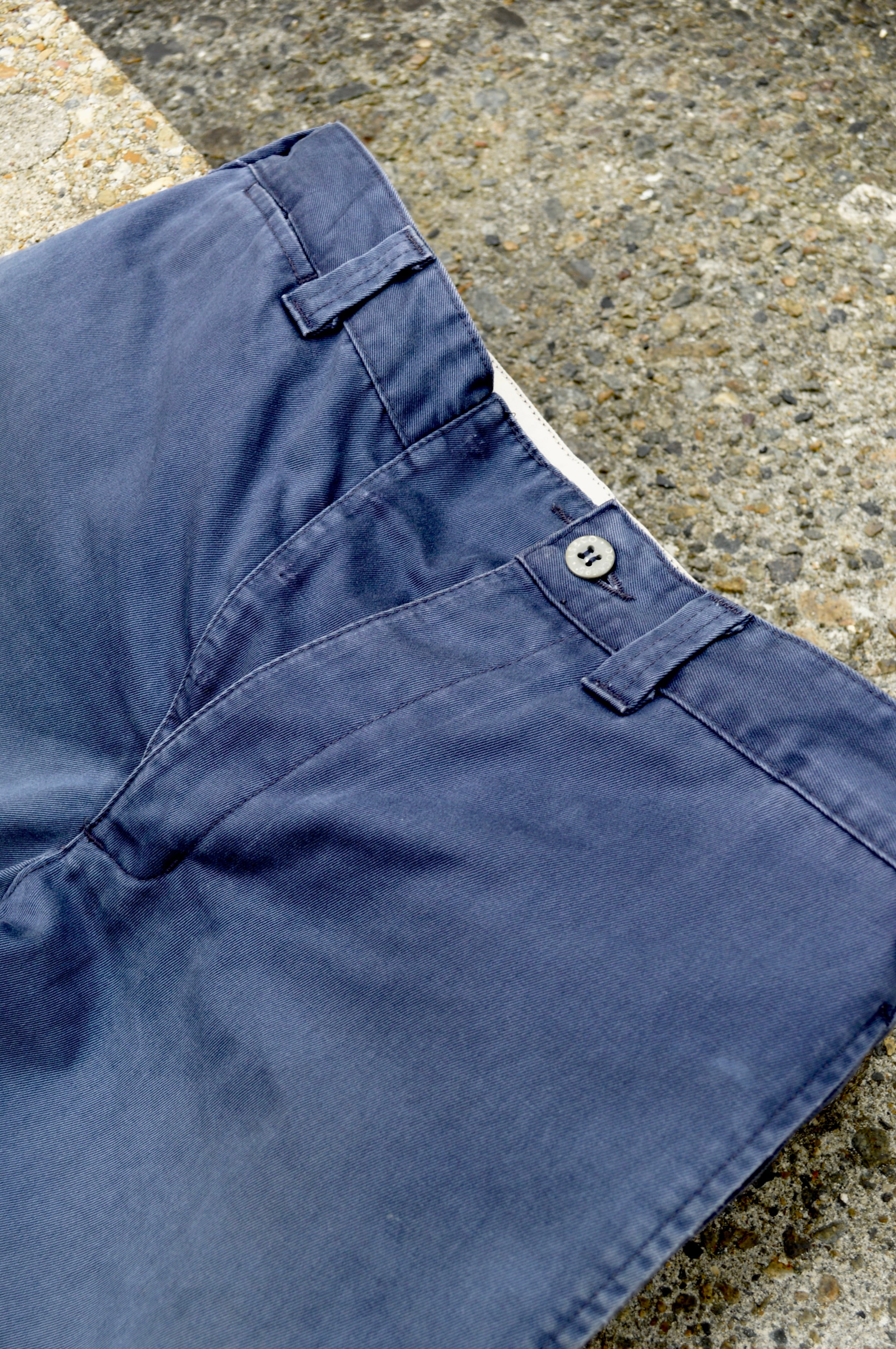 やや色褪せたネイビーの細身なシルエットが珍しいポイント。生地ボディーもタフなミドルチノクロスツイル。