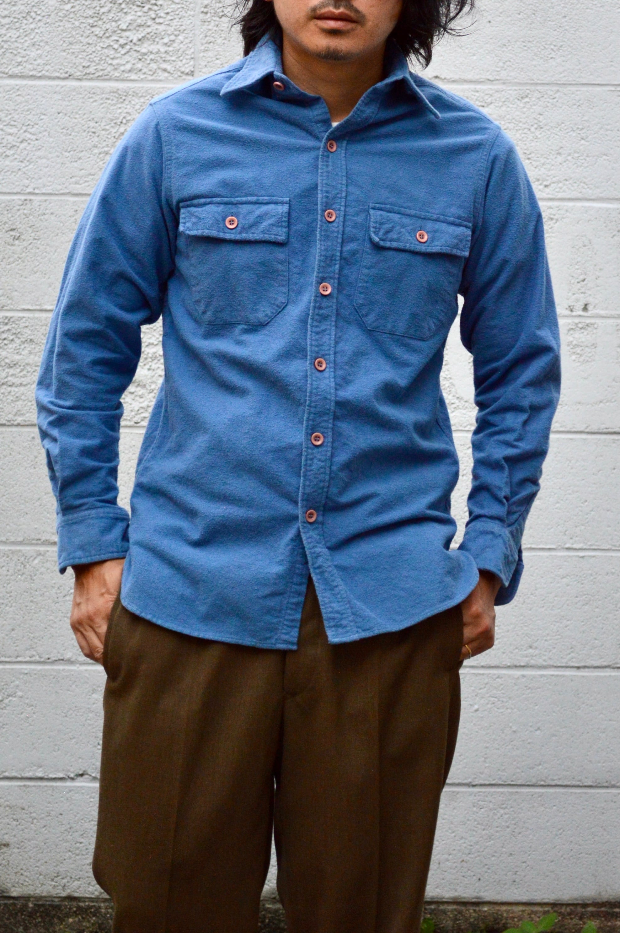 色味もフェード感あるサックスブルーで冬のフランネルワークシャツには珍しいカラーとデザイン。