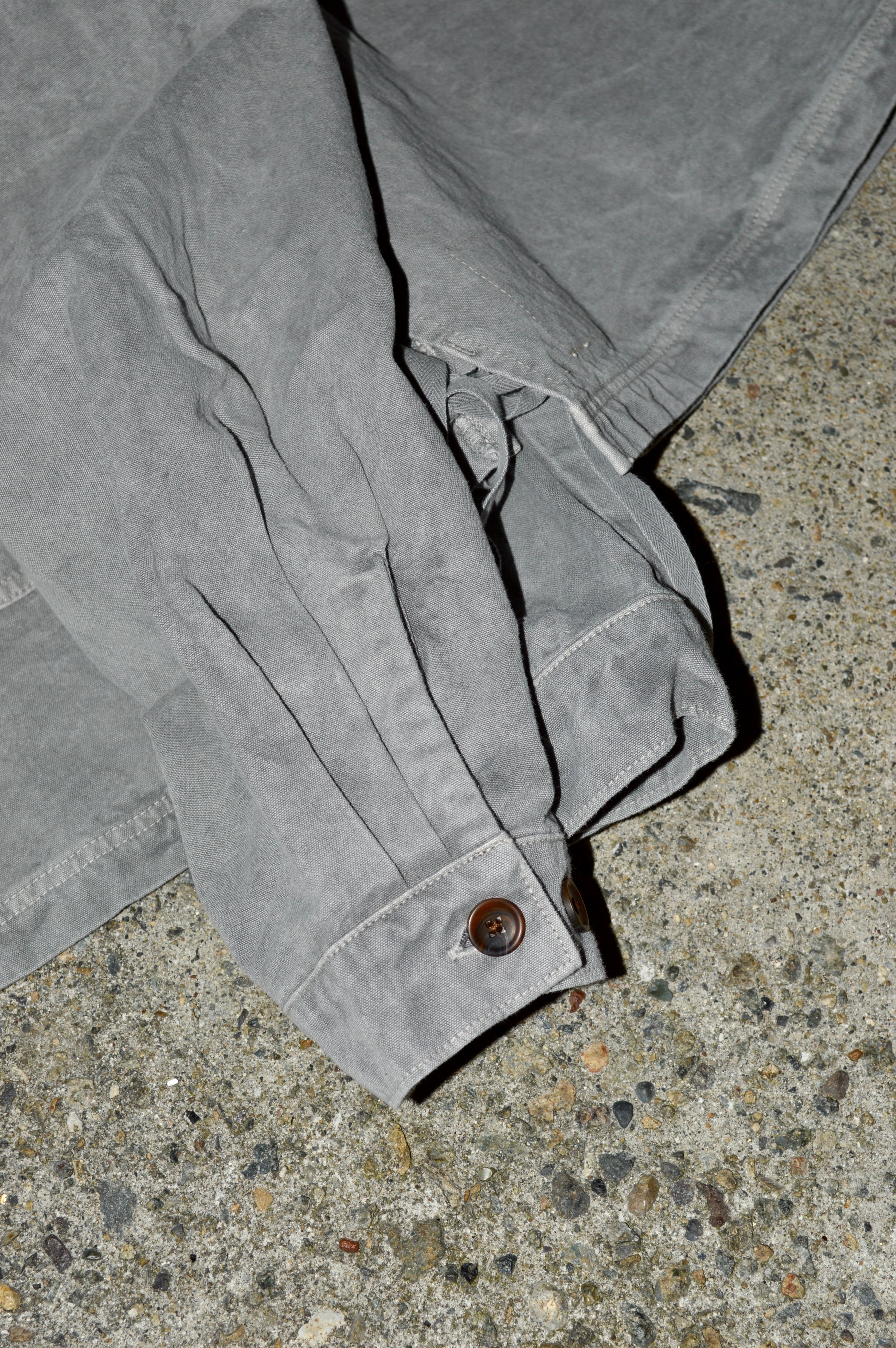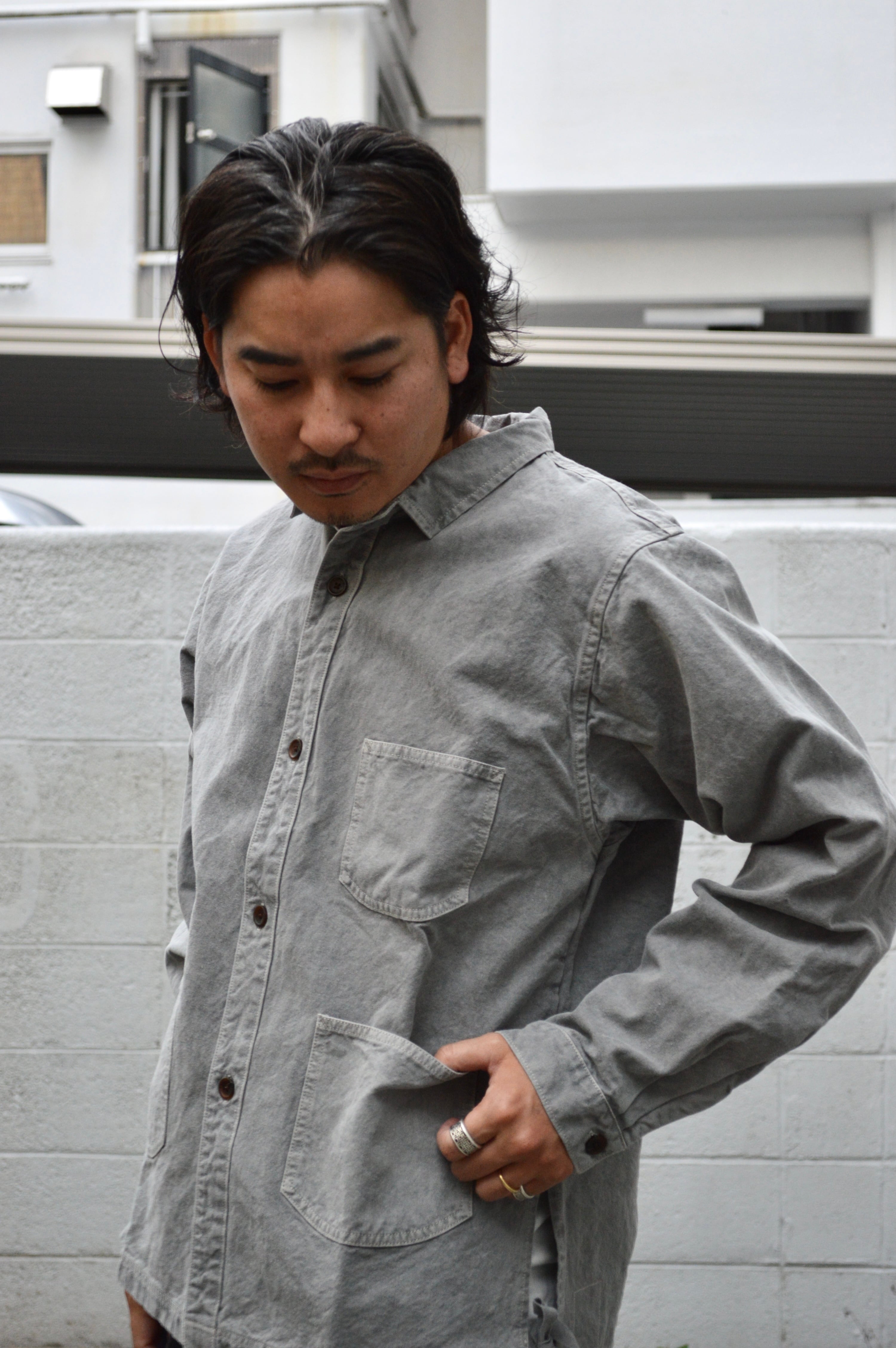 国内帆布の織り表情に独特な染色である炭染めを施すことによって成る、和のテイストがシャツの印象を一新させる質感と風合いが一番の特徴です。
