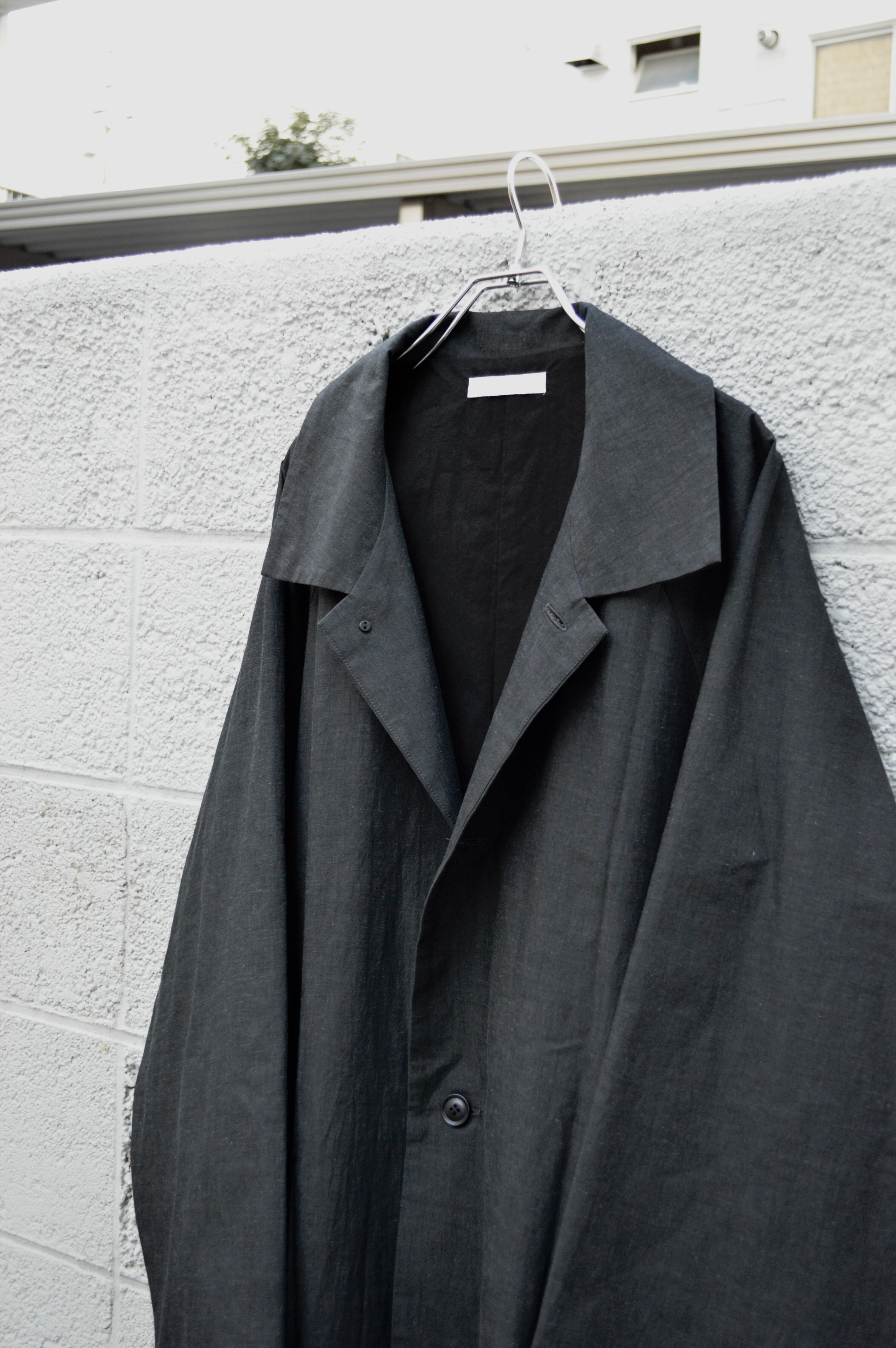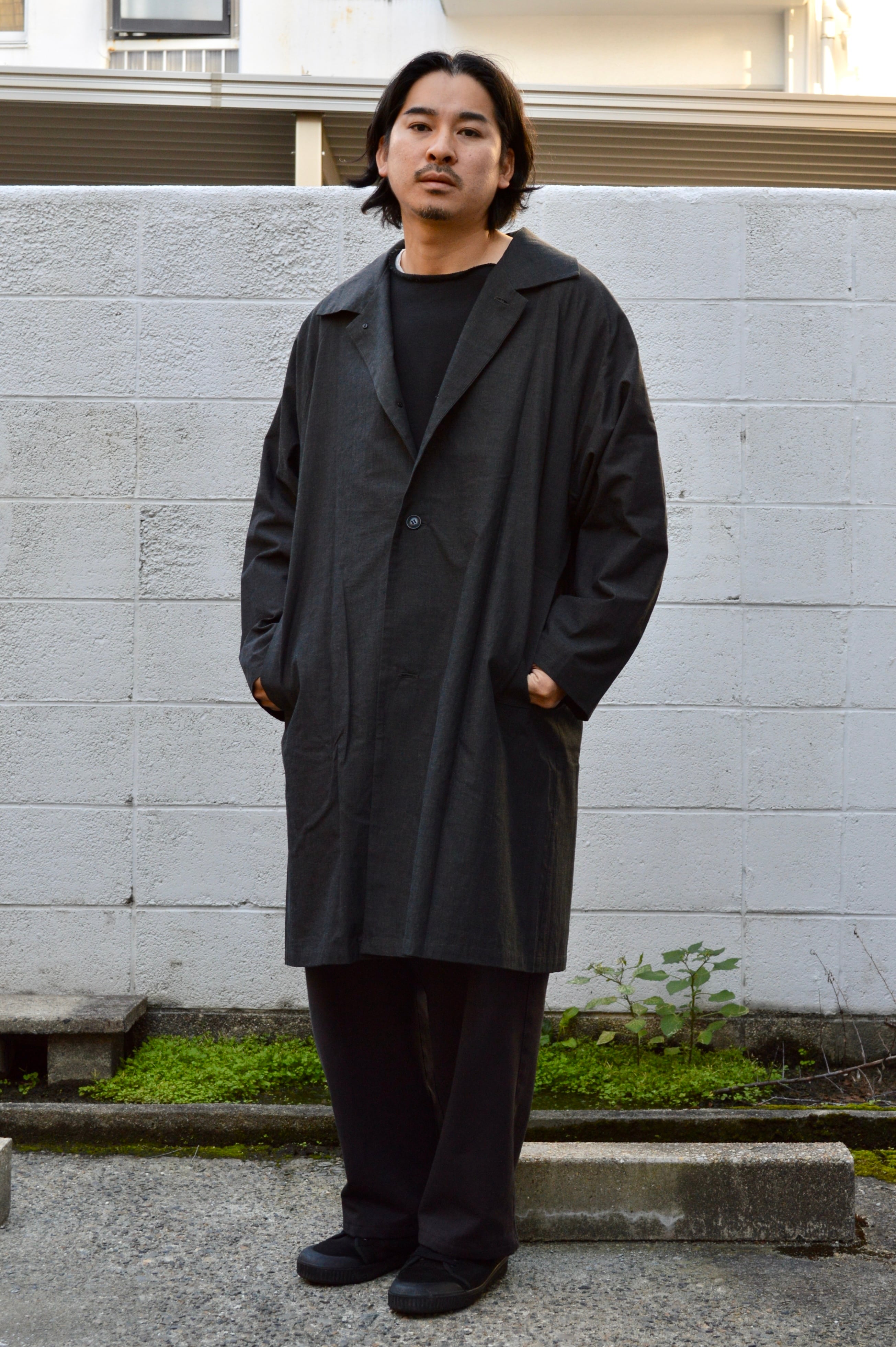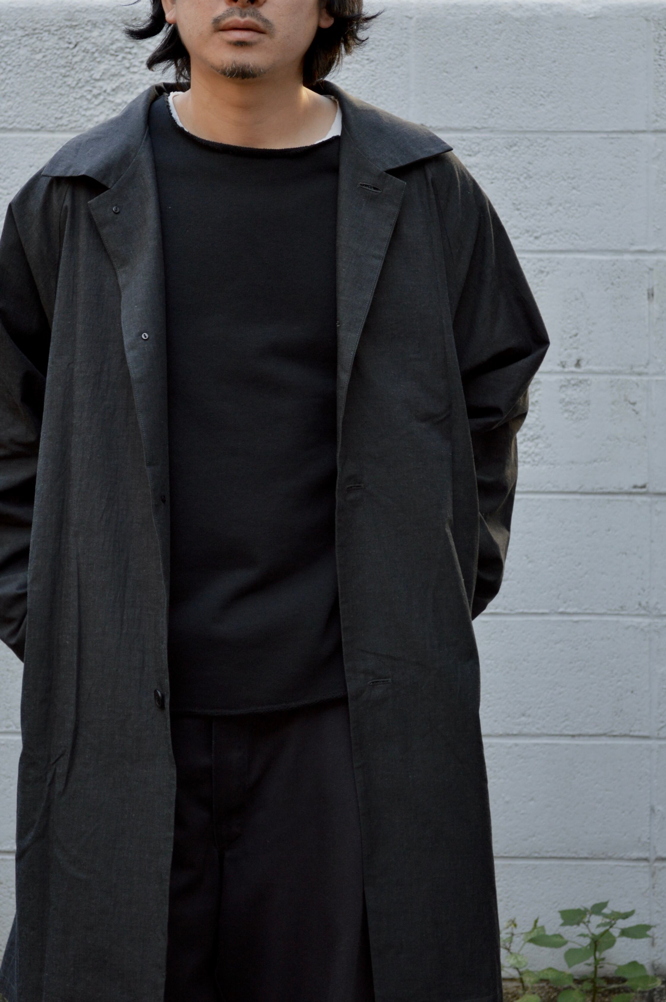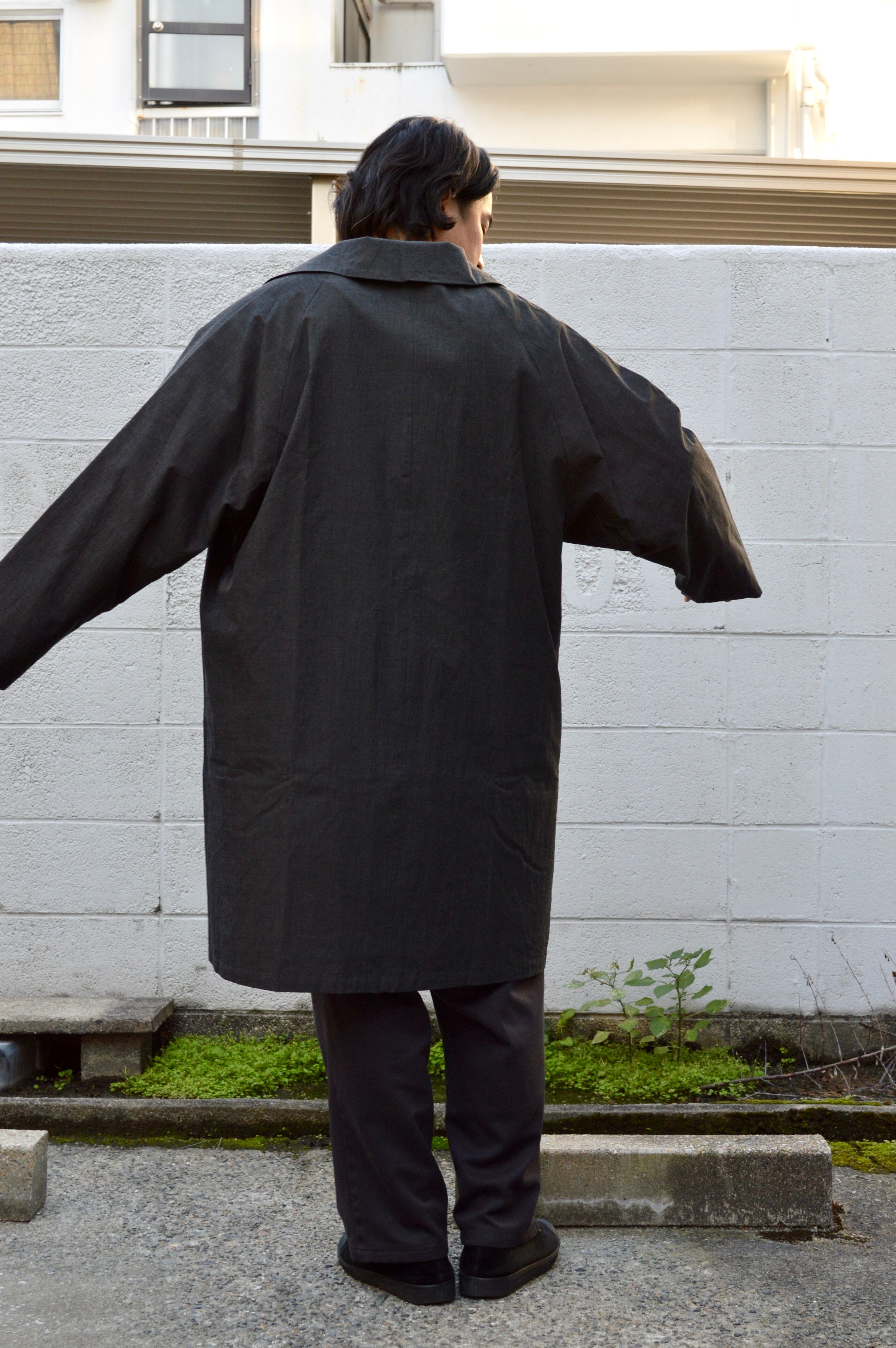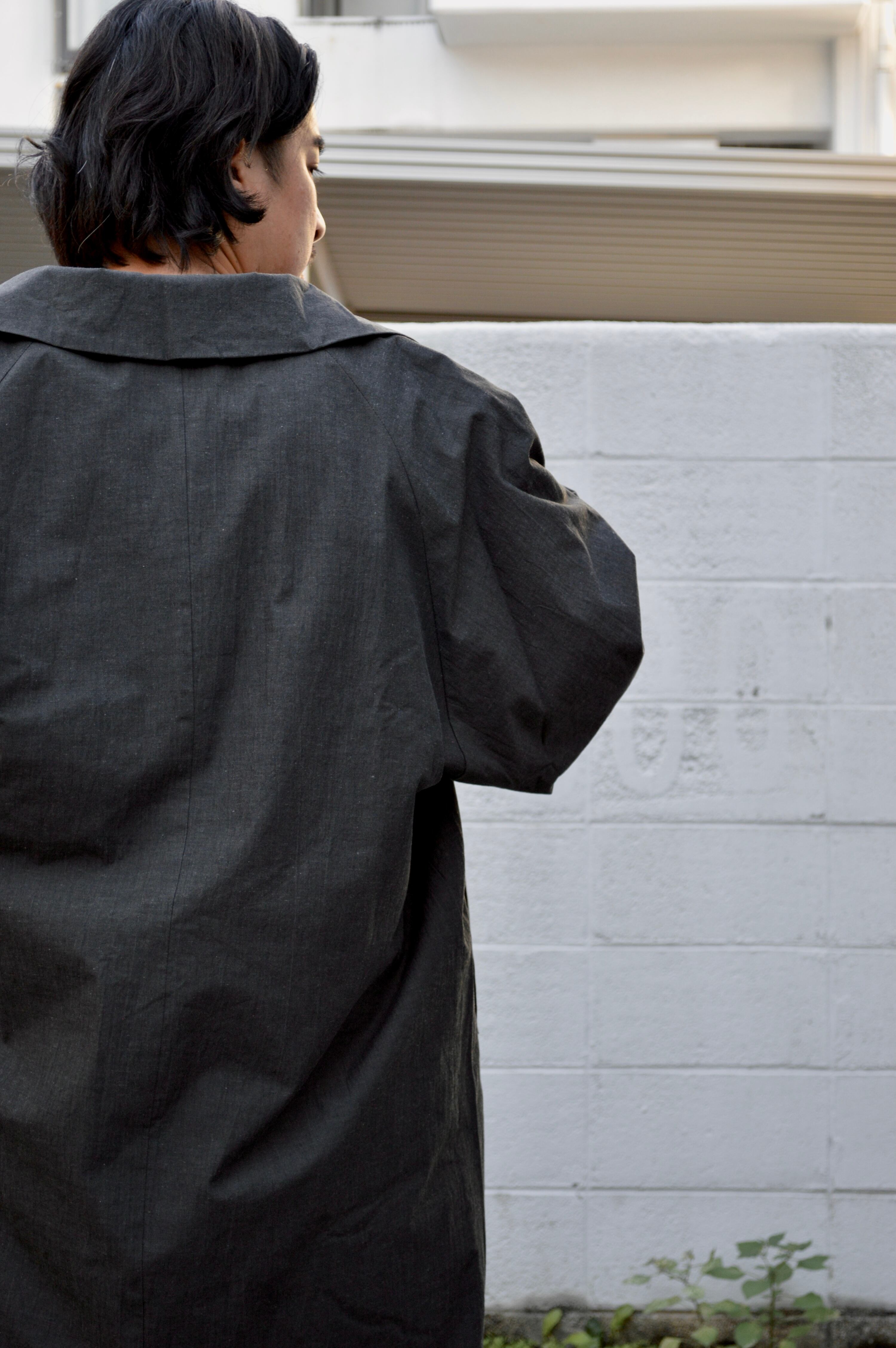 繊維にはコットンのみならず、風合いや日常着としての通気性、強度を保つ意味でも天然素材のリネンとラミーが混合された着物と接点のある質感に仕立てられたシーズンレスロングコートとなります。
