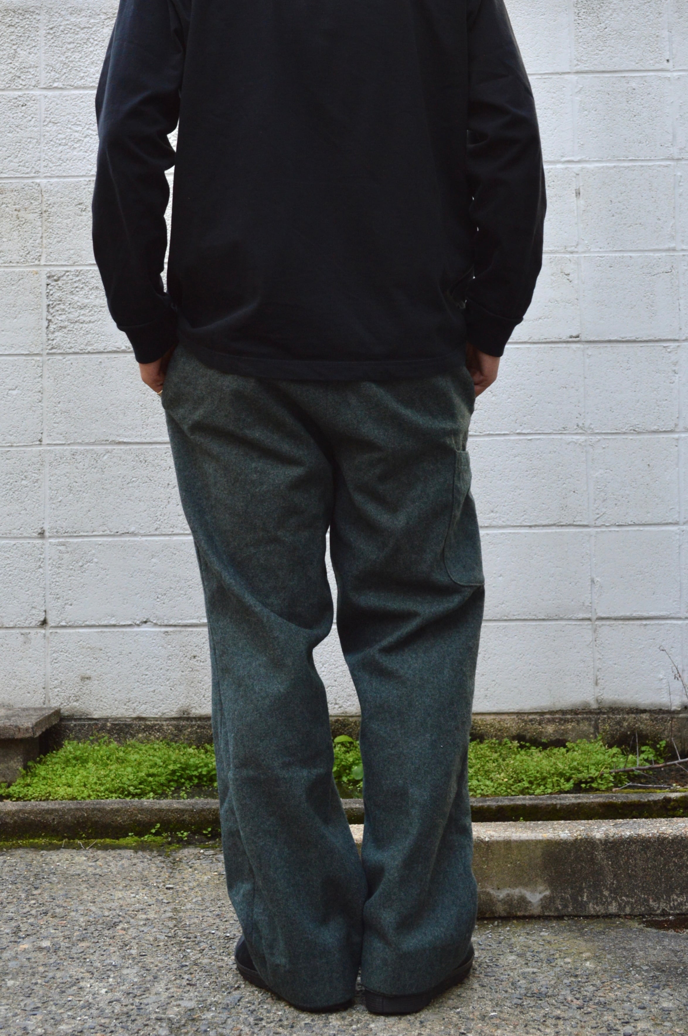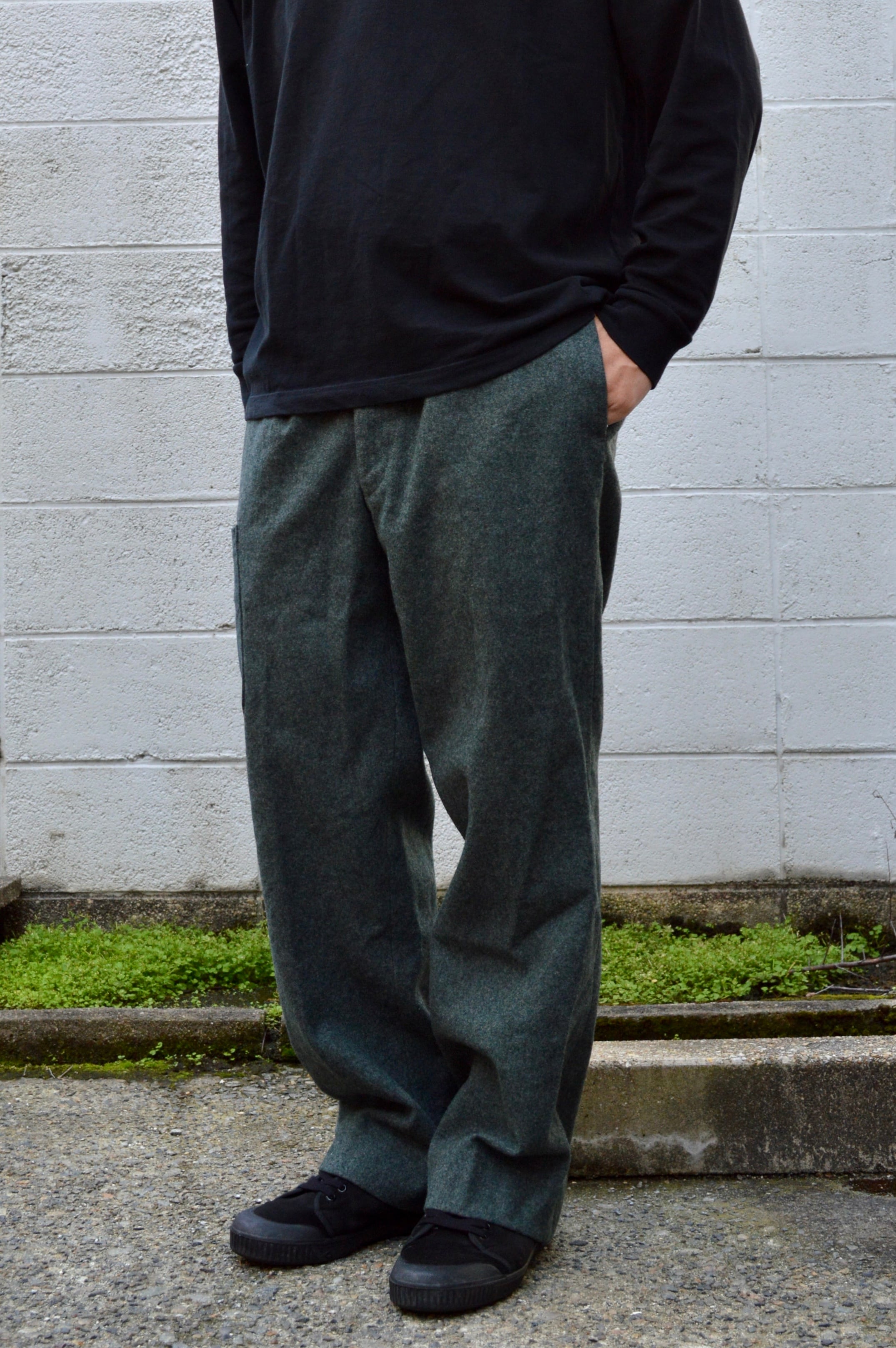 深みのあるグリーングレーで落ち着いた印象を与えつつ、メルトンスラックス特有の質感は高級感と冬のスタイリングを際立たせます。
