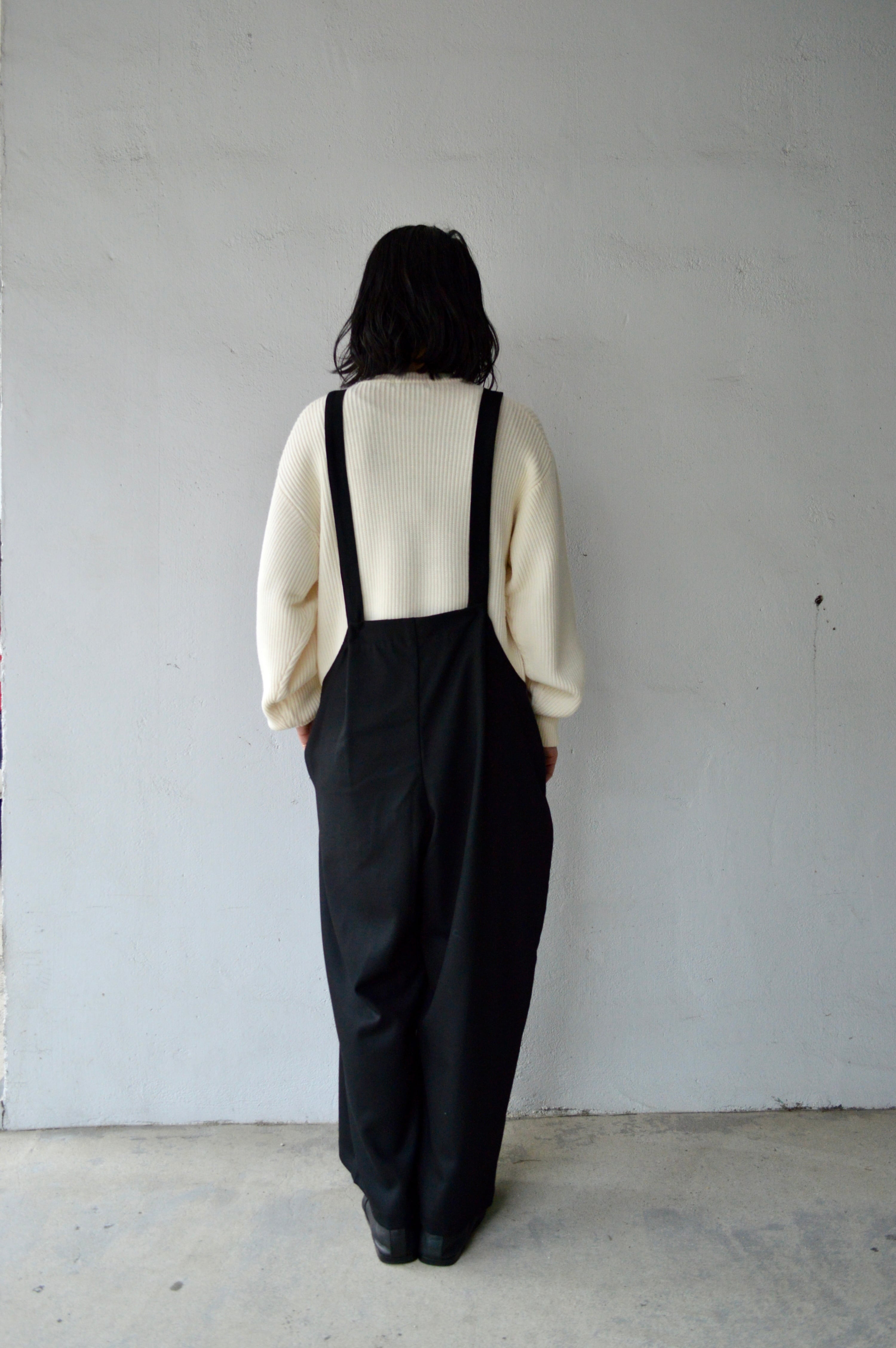 股上が深く取られたサロペットで裾に向かってストレートに落ちるシルエット。フラノウールの質感を活かしたドレープ感が際立つアイテムであり、細やかな仕様にも注目。