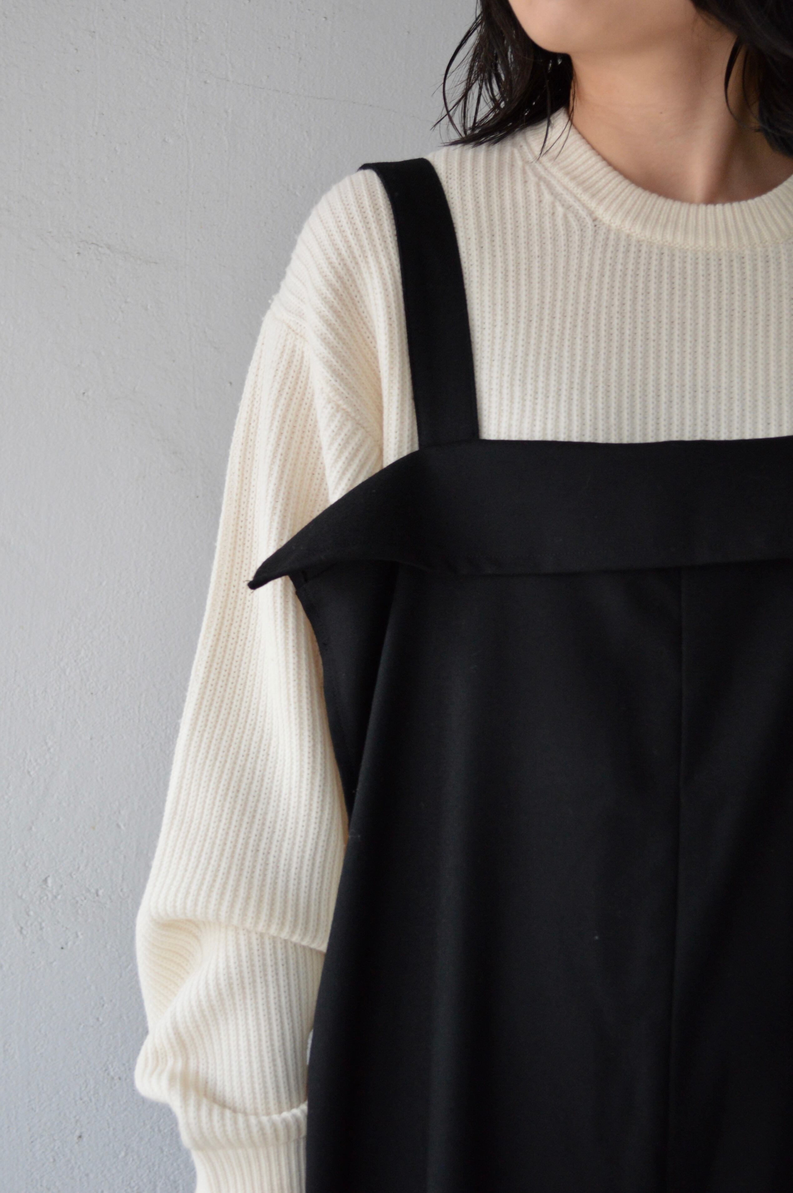 シンプルでありながらもデザイン性が目に留まる尾州産の上質なフラノウールサロペットです。