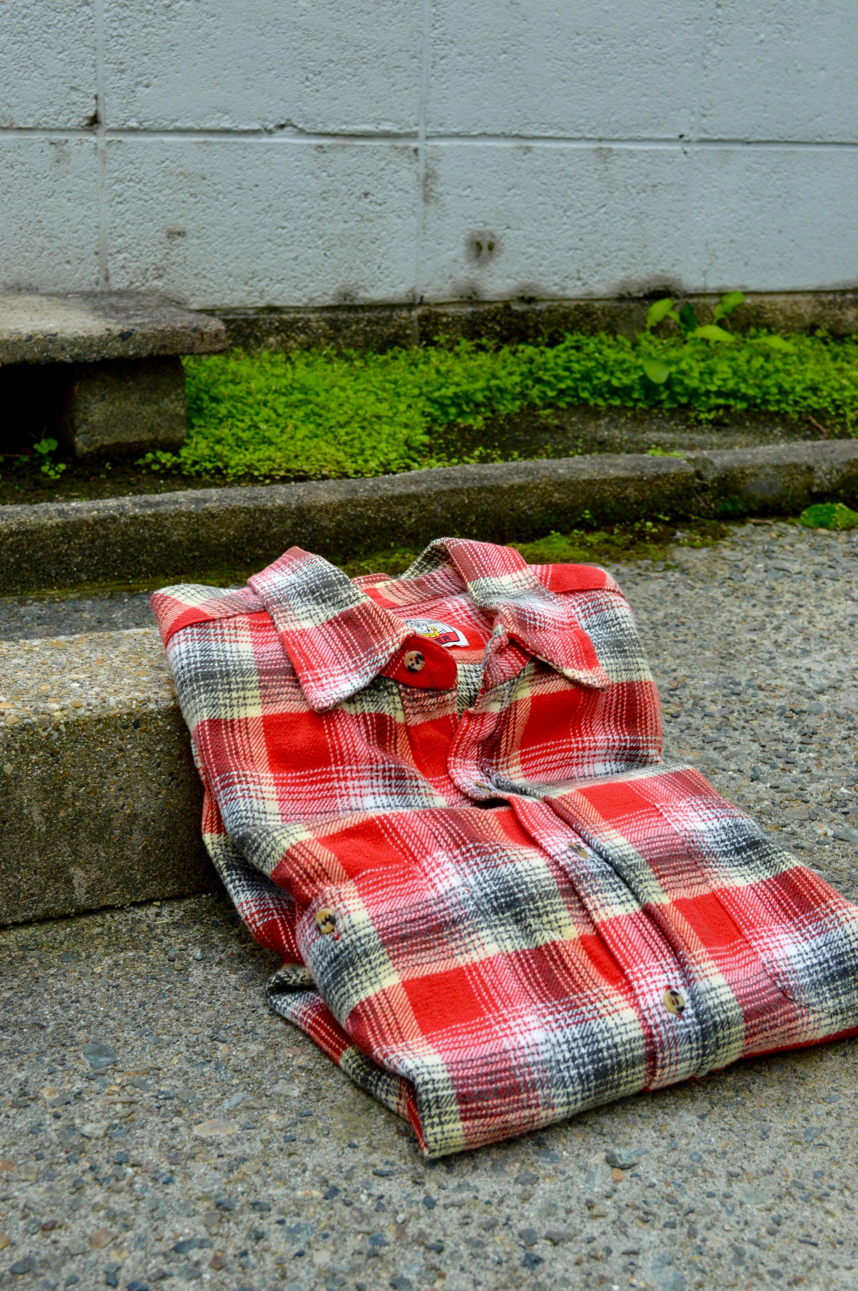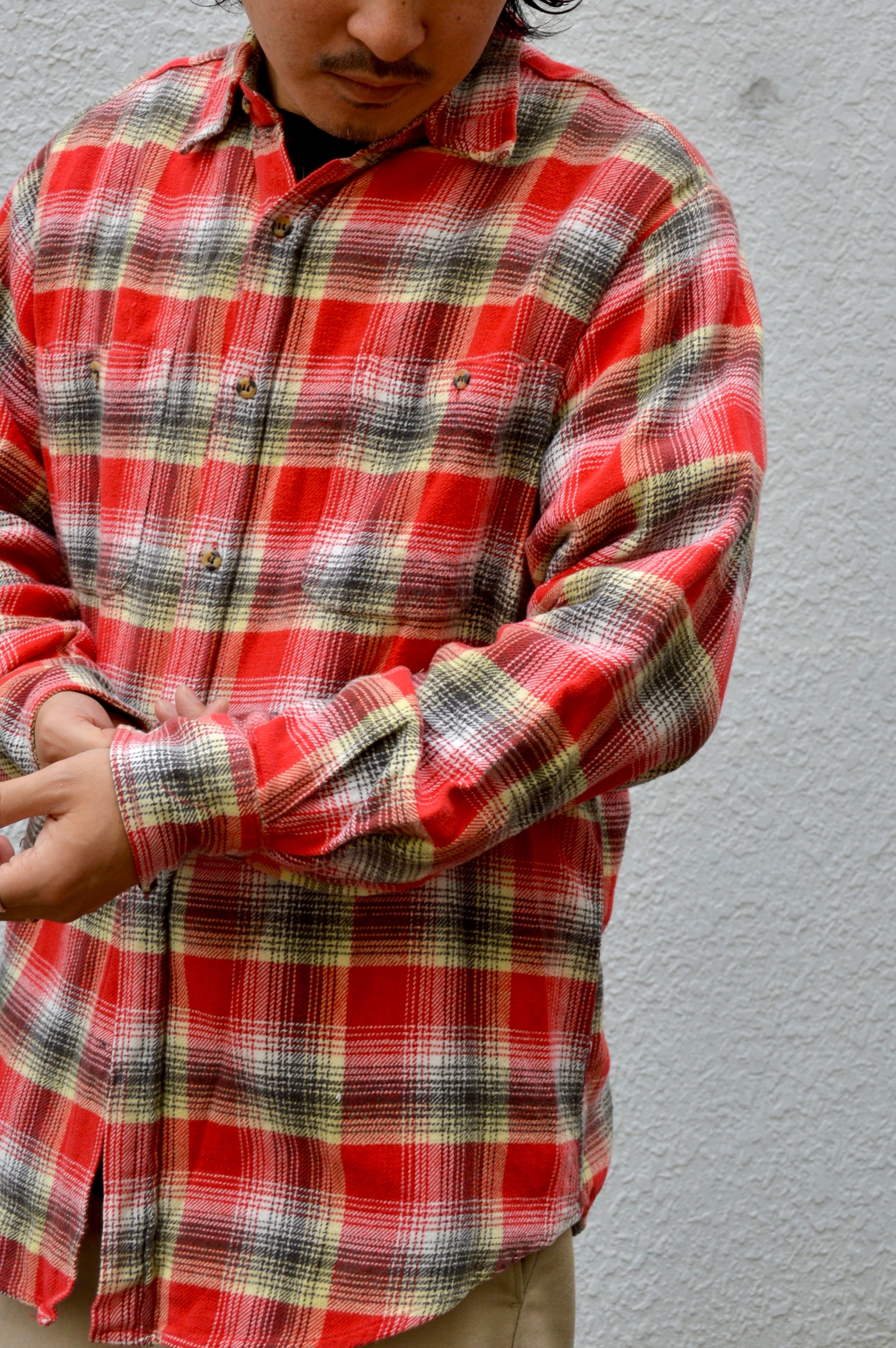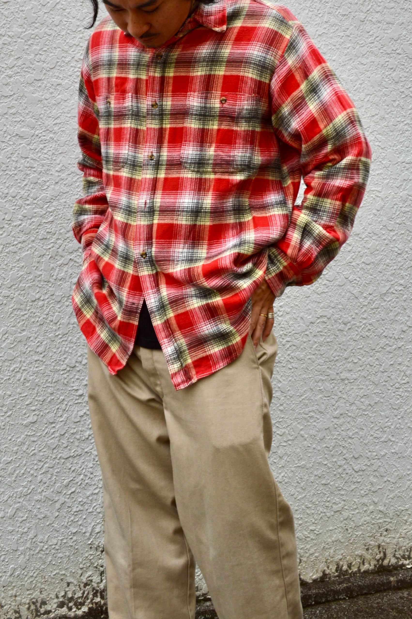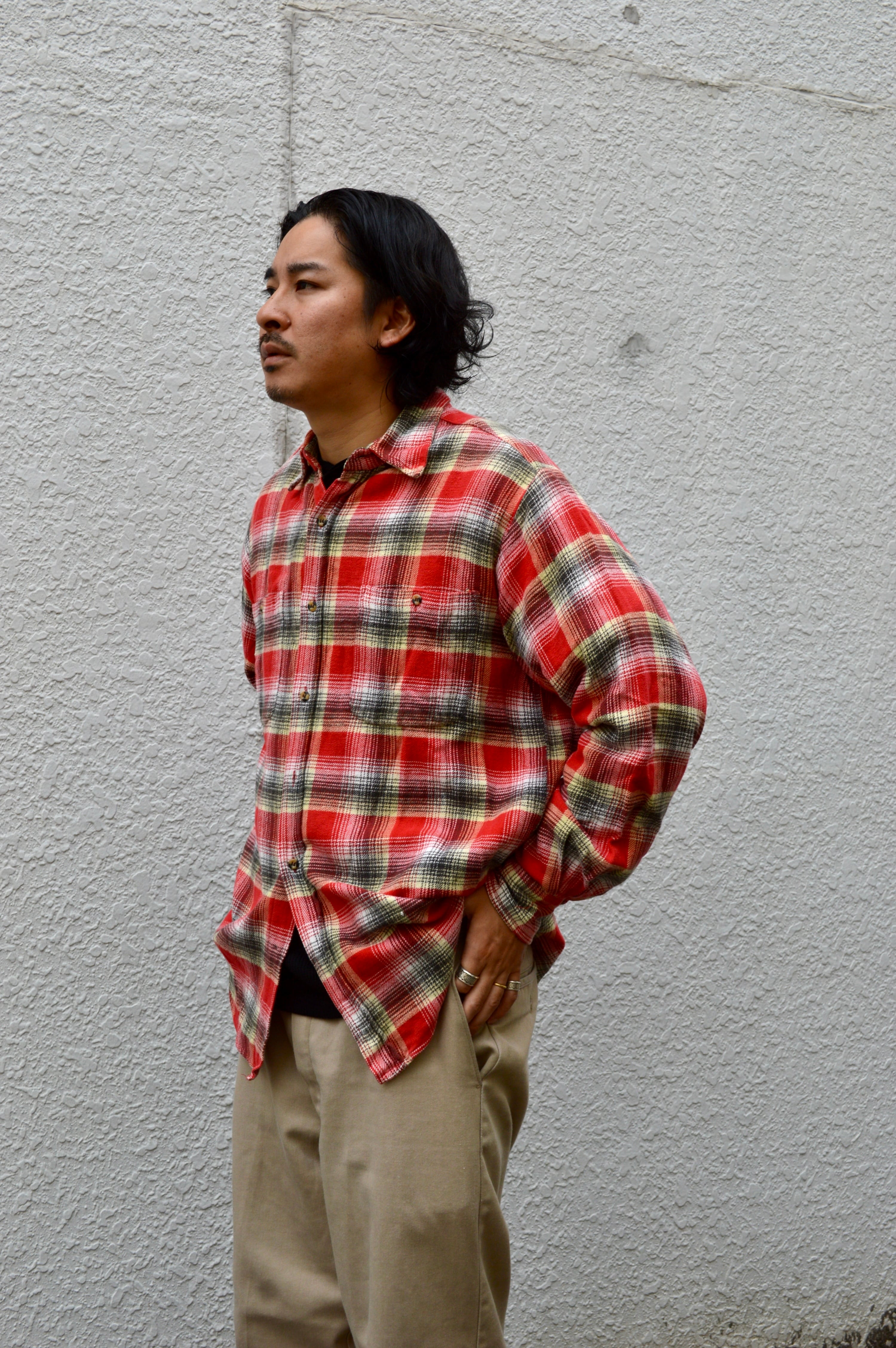 珍しいオールドネルシャツで当時レギュラーなサイズフィットが多い中、ルーズなサイズ感でできたライトフランネルシャツ。赤を基調としたブラック、ホワイト、ベージュの配色でボタンは鼈甲カラーで統一され、都内のいちショップながらにアメリカのワークウェアーをしっかり作り込んだネルシャツとなっております。