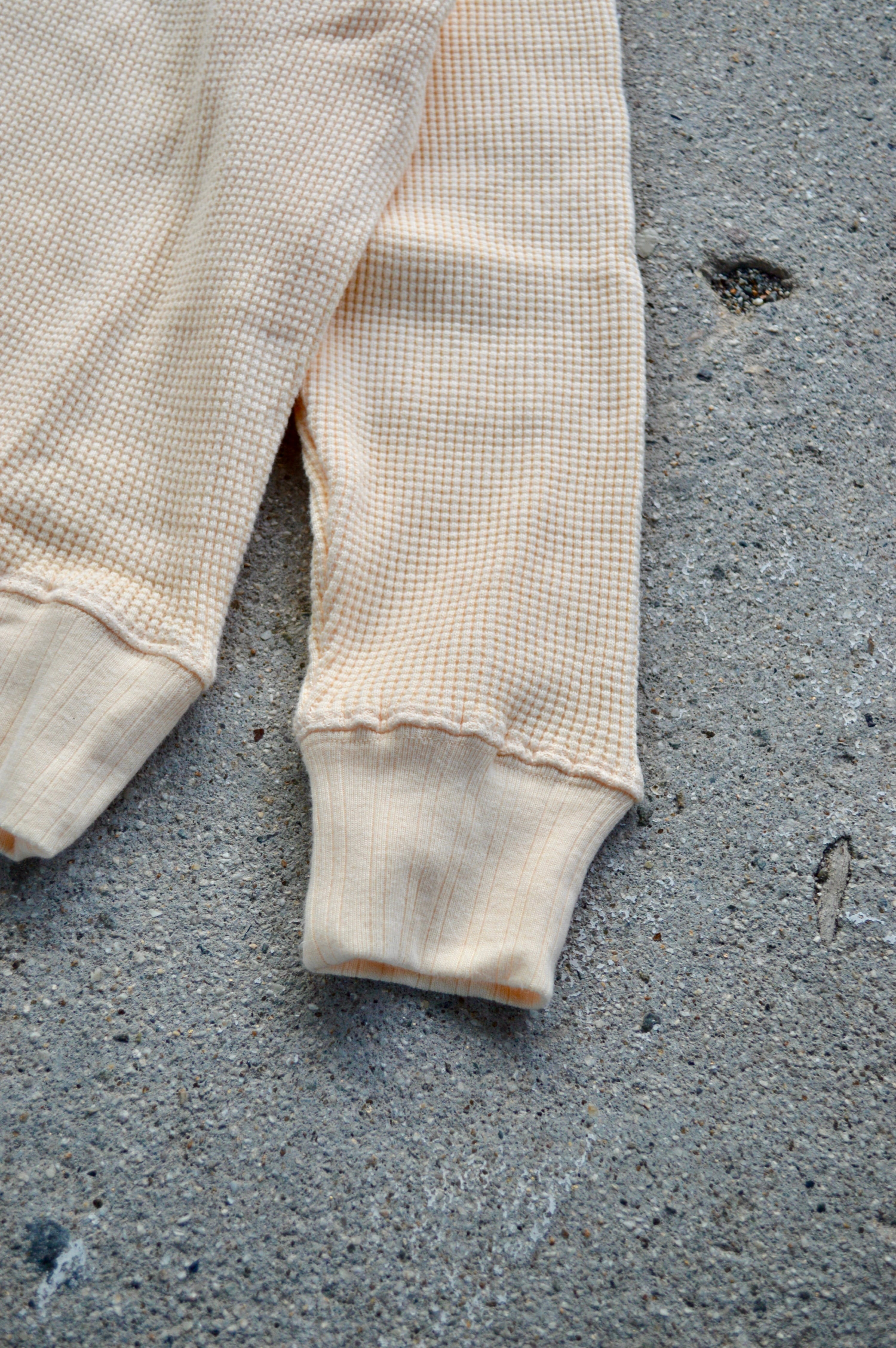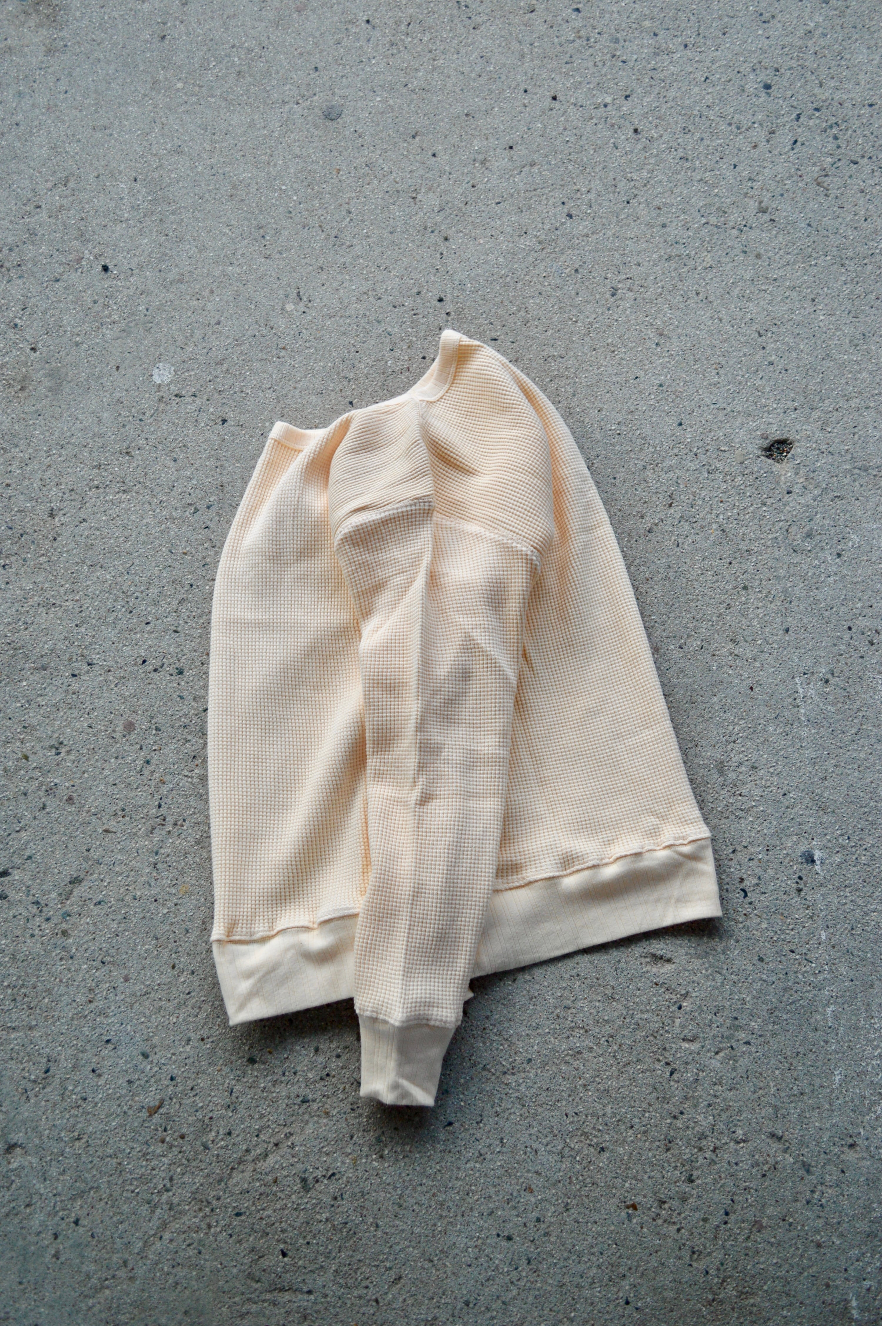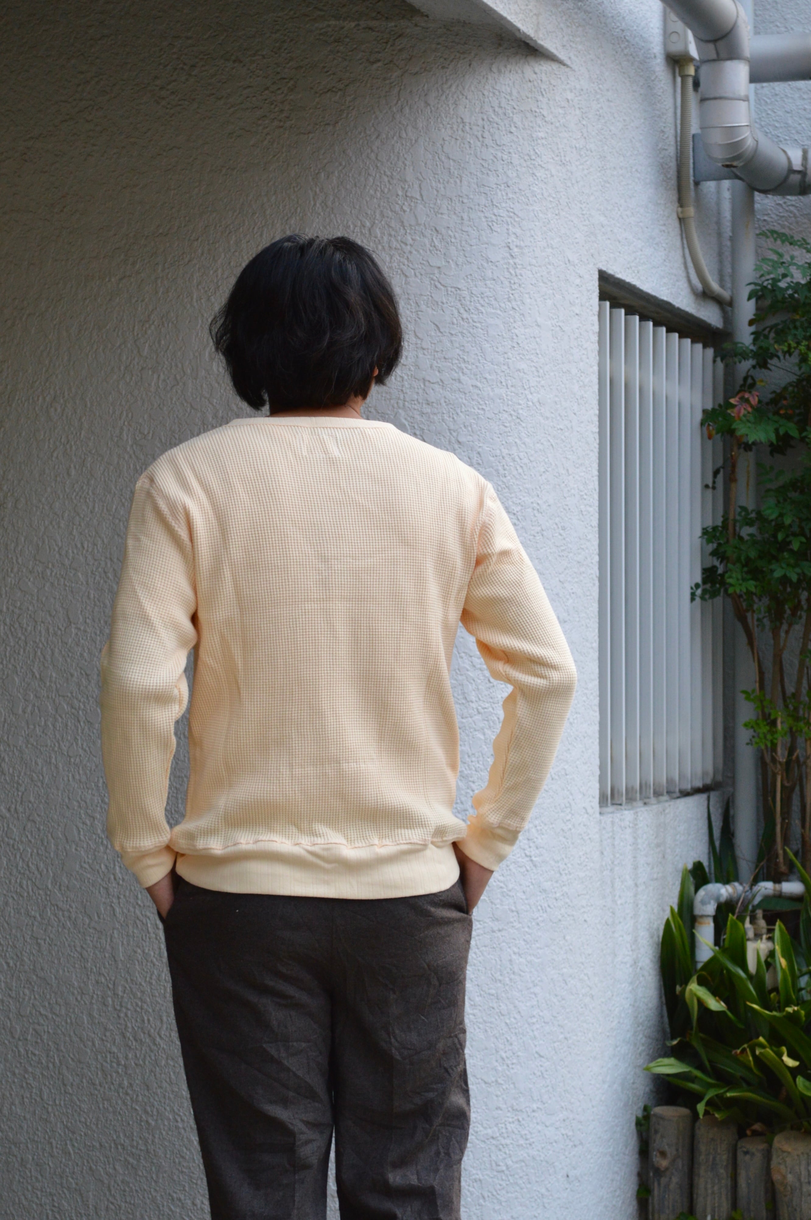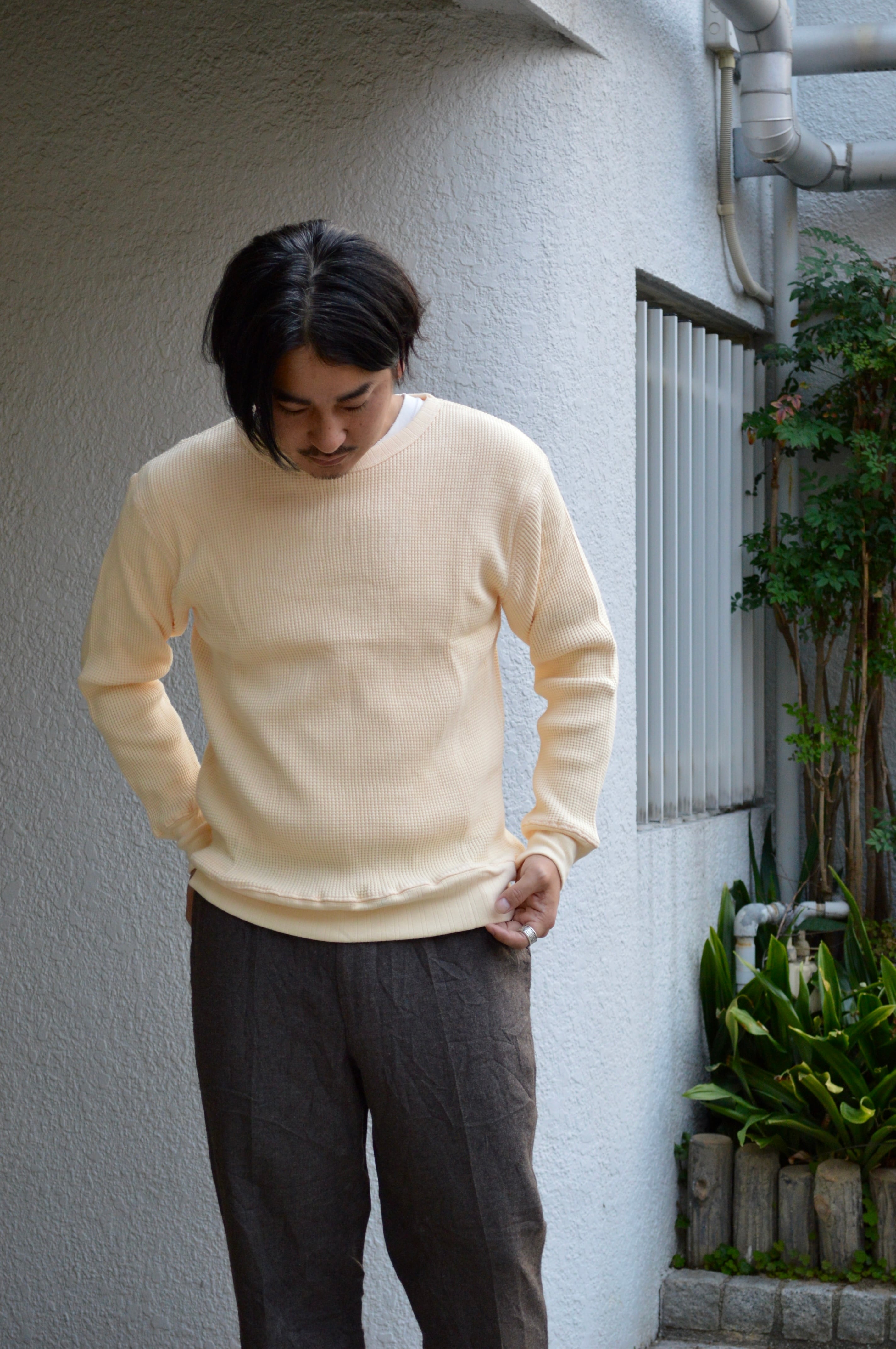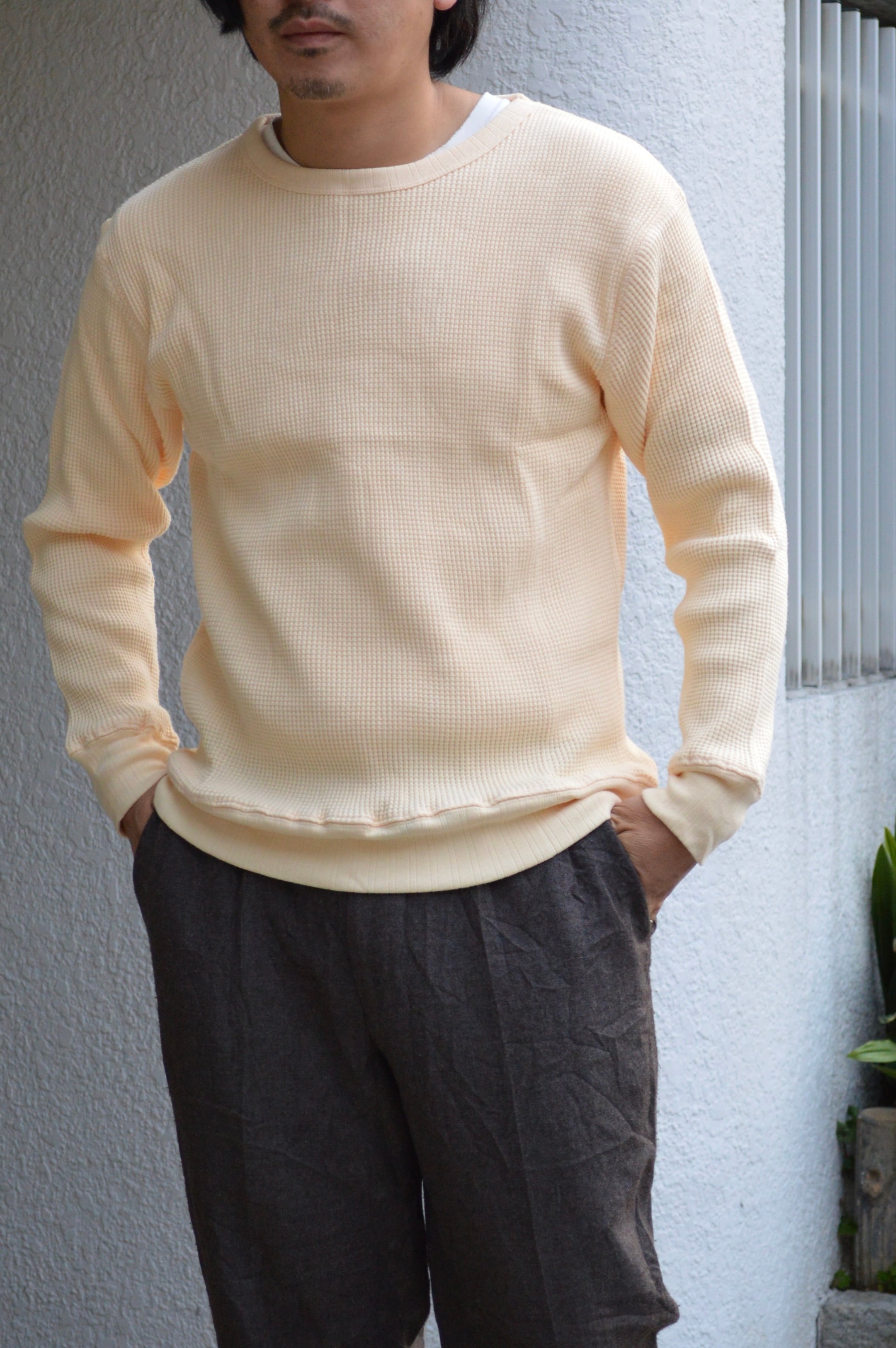 度詰めされたワッフル素材はライトなスウェット程の厚さがあり保温性、伸縮性に優れたタフなインナーウェアーです。