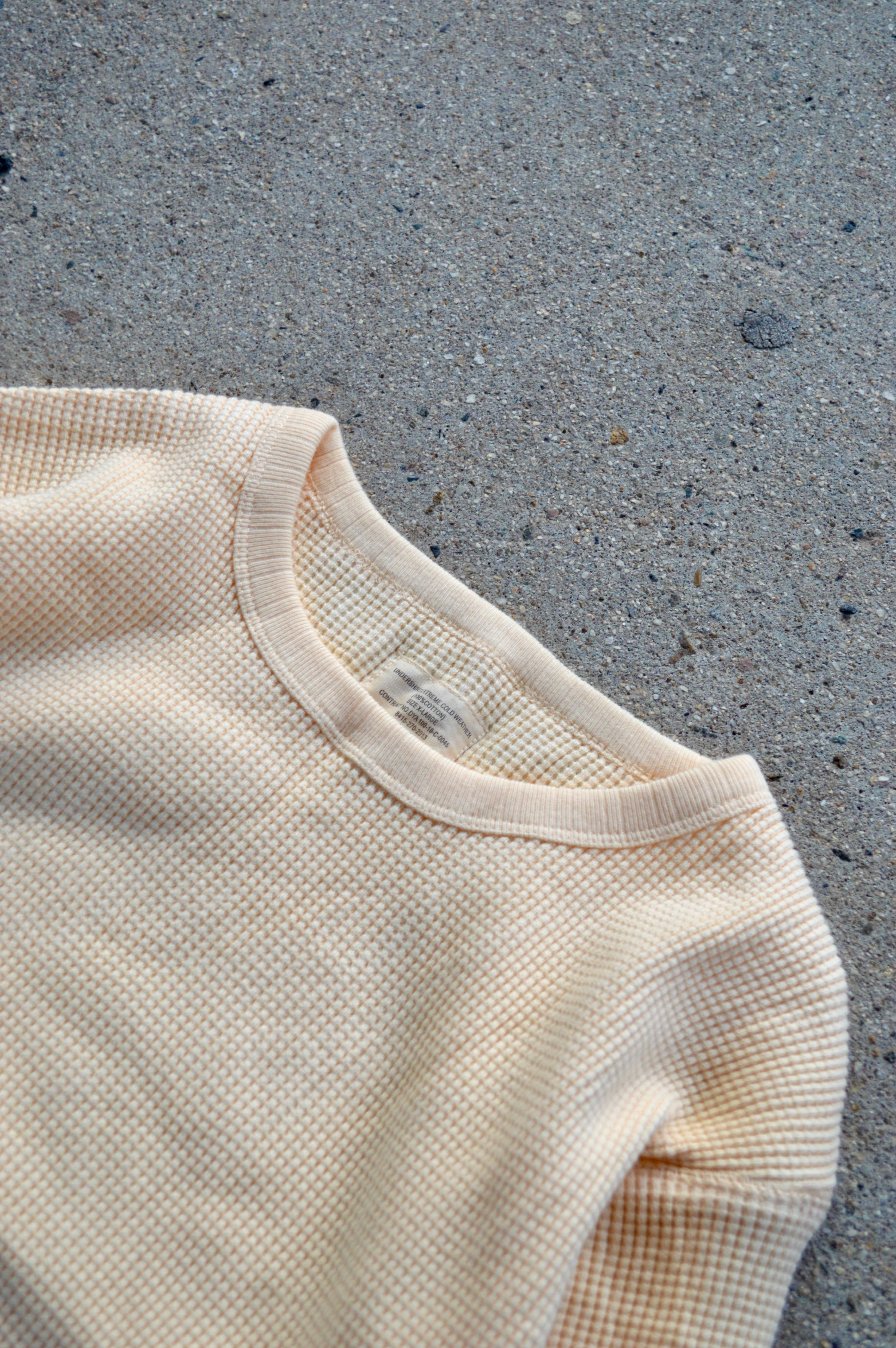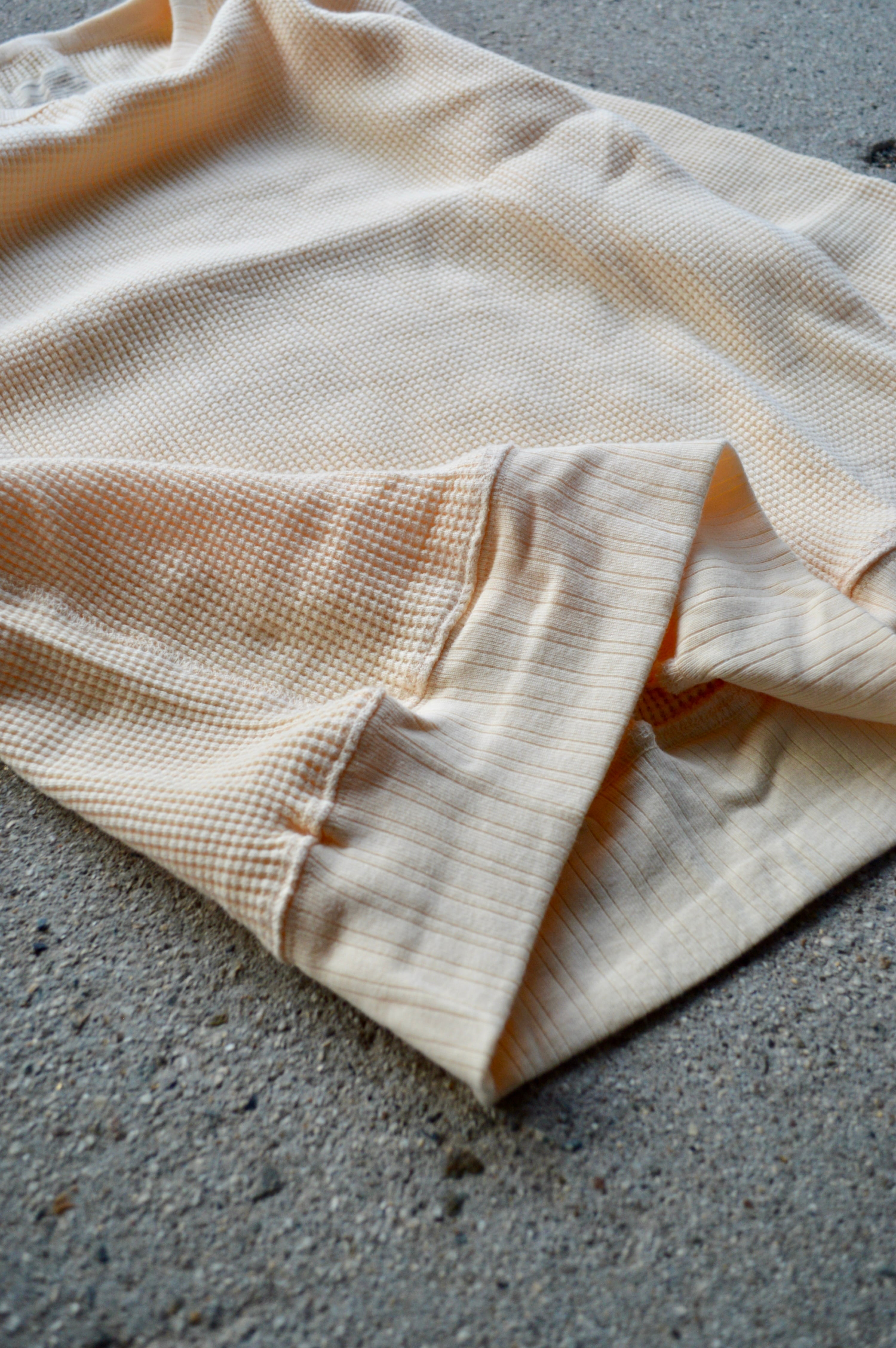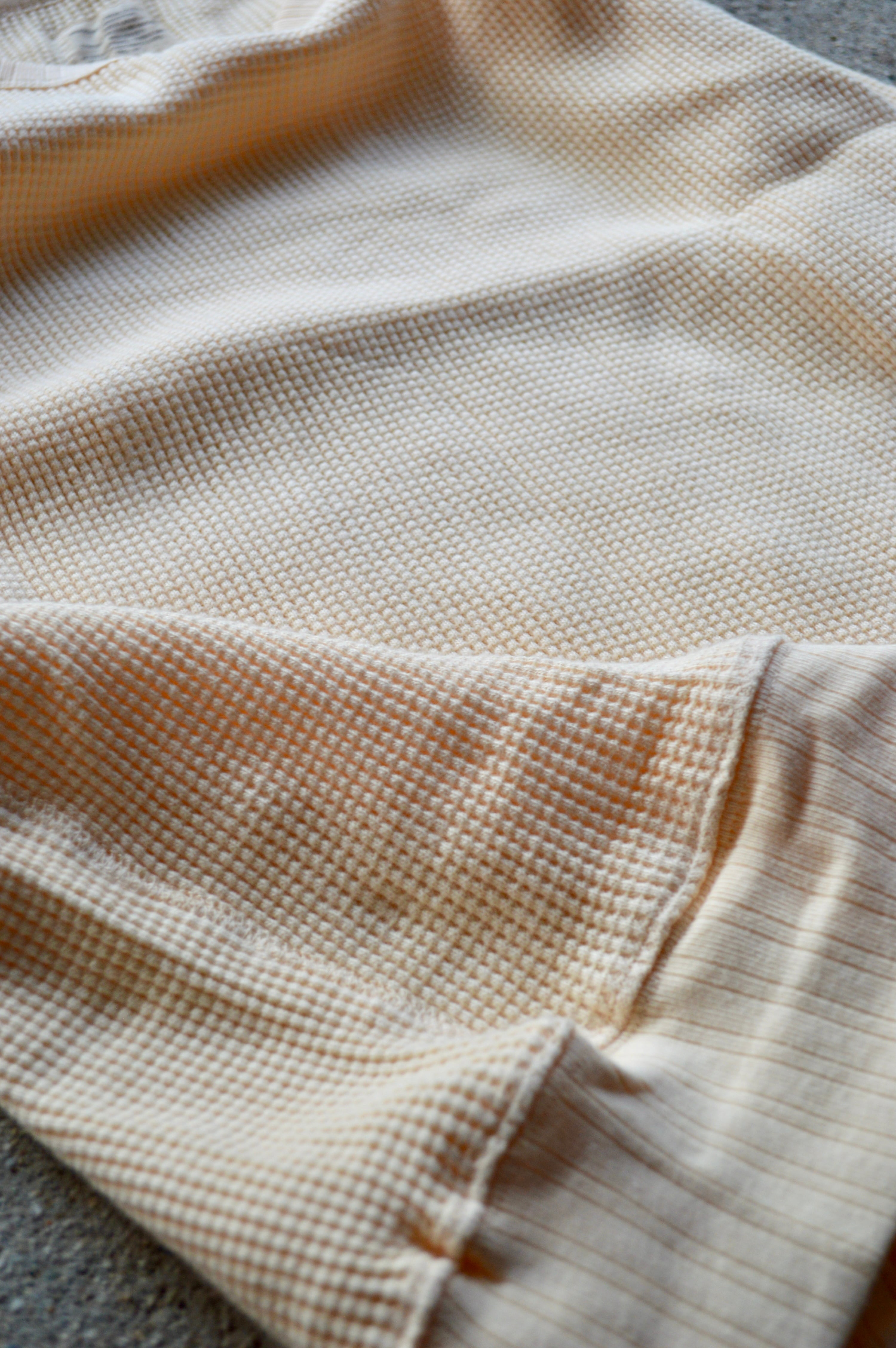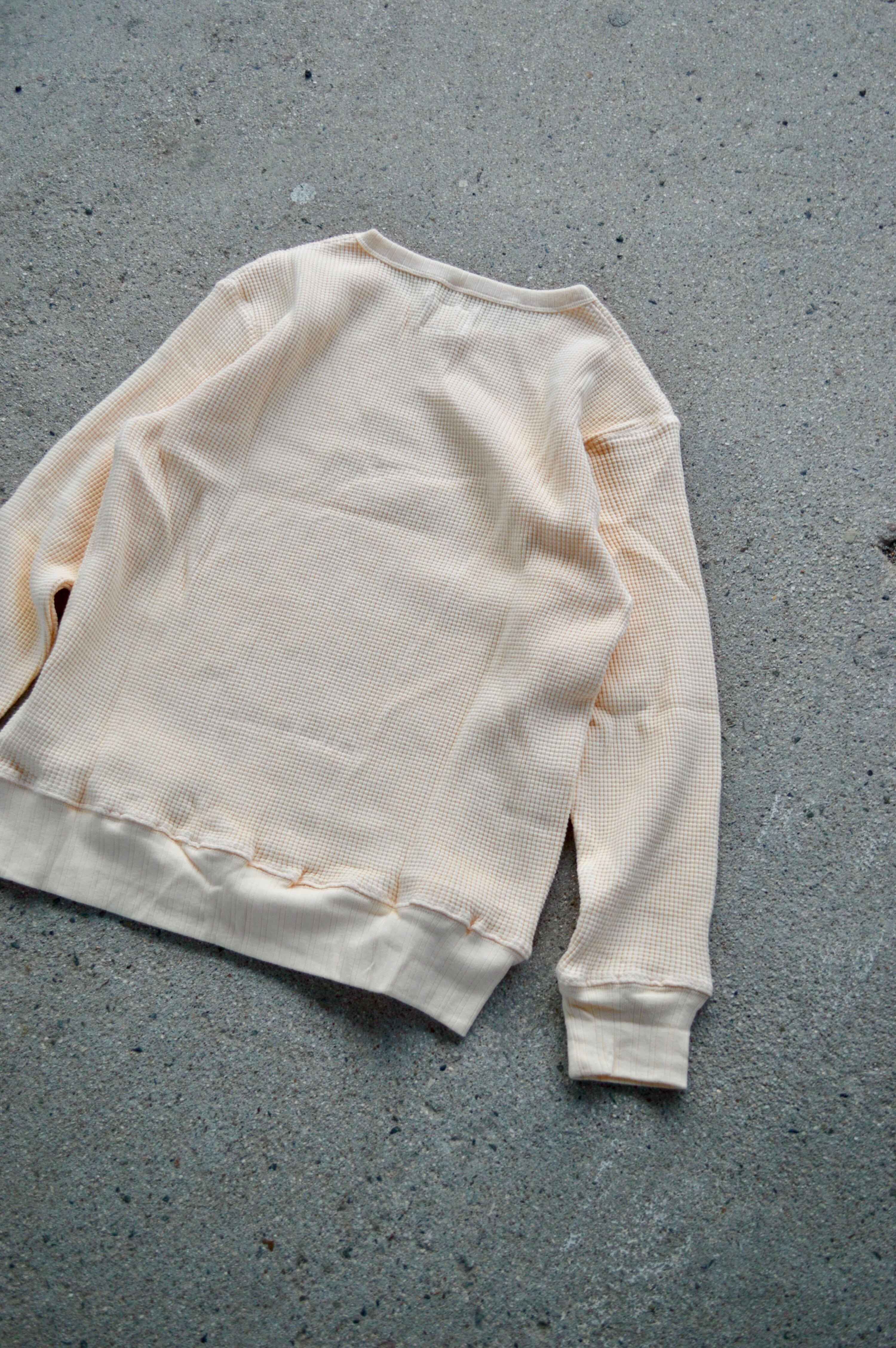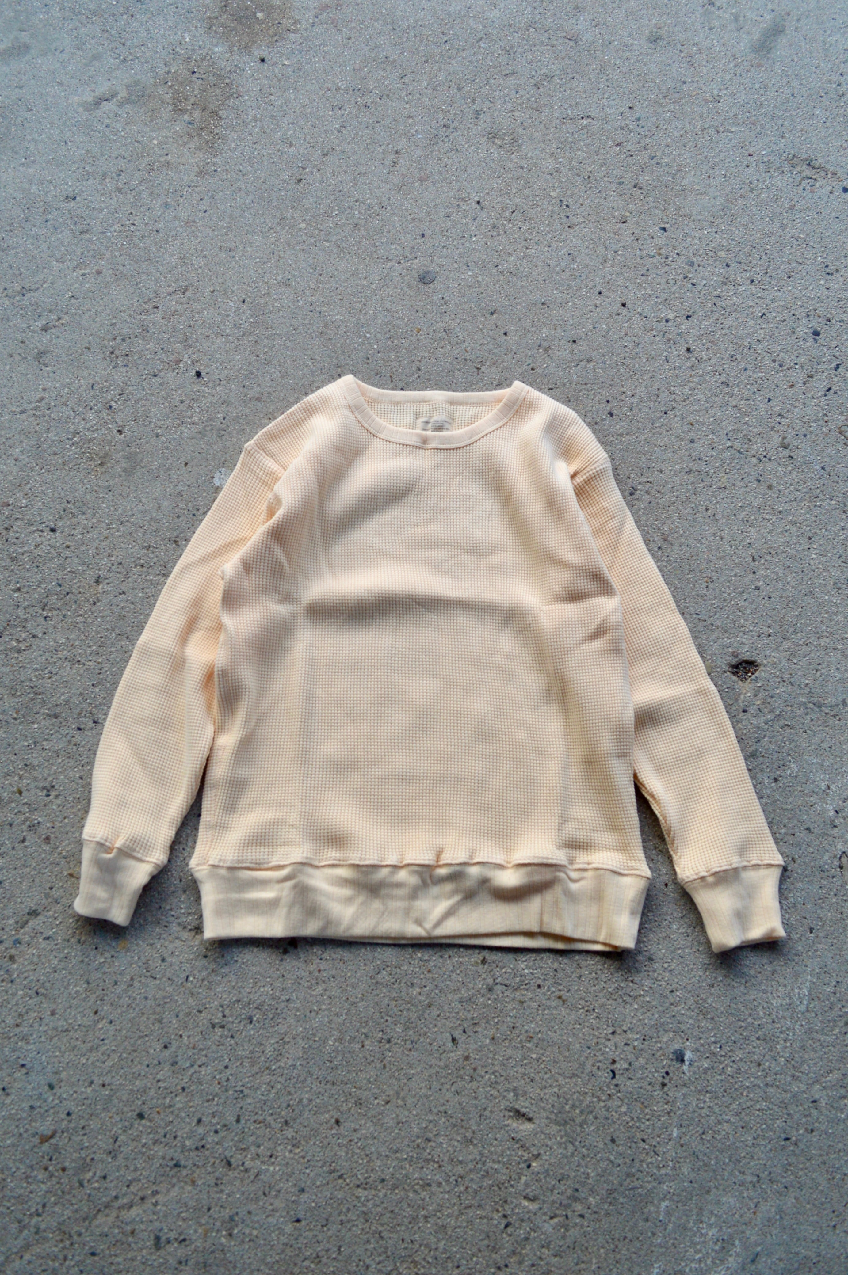 度詰めされたワッフル素材はライトなスウェット程の厚さがあり保温性、伸縮性に優れたタフなインナーウェアーです。