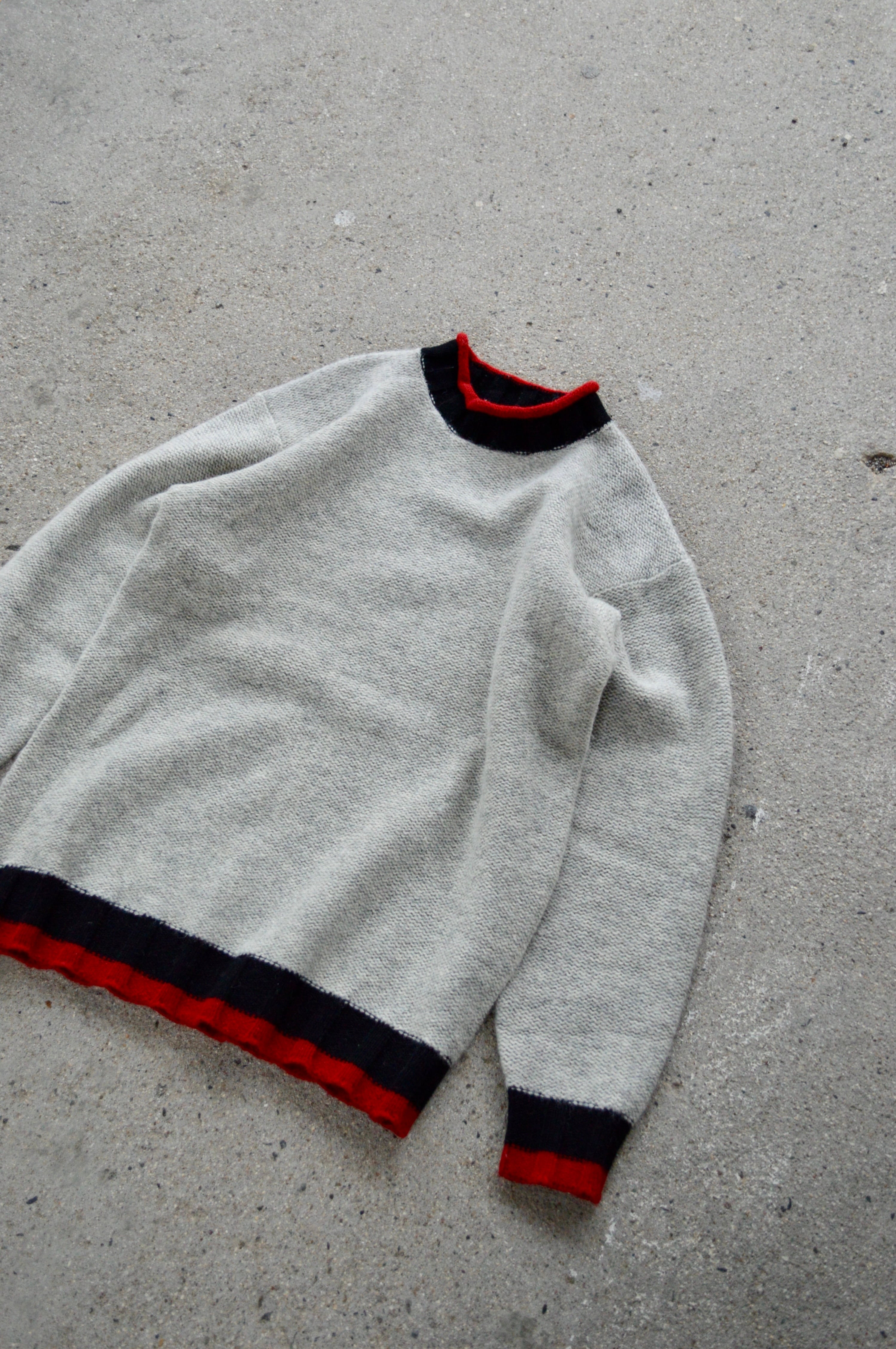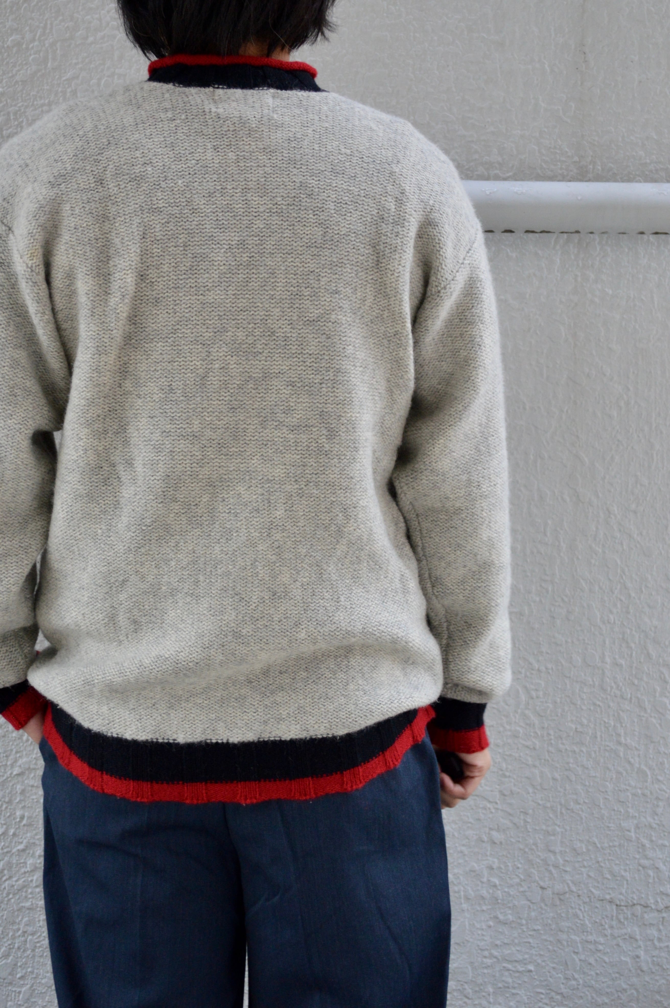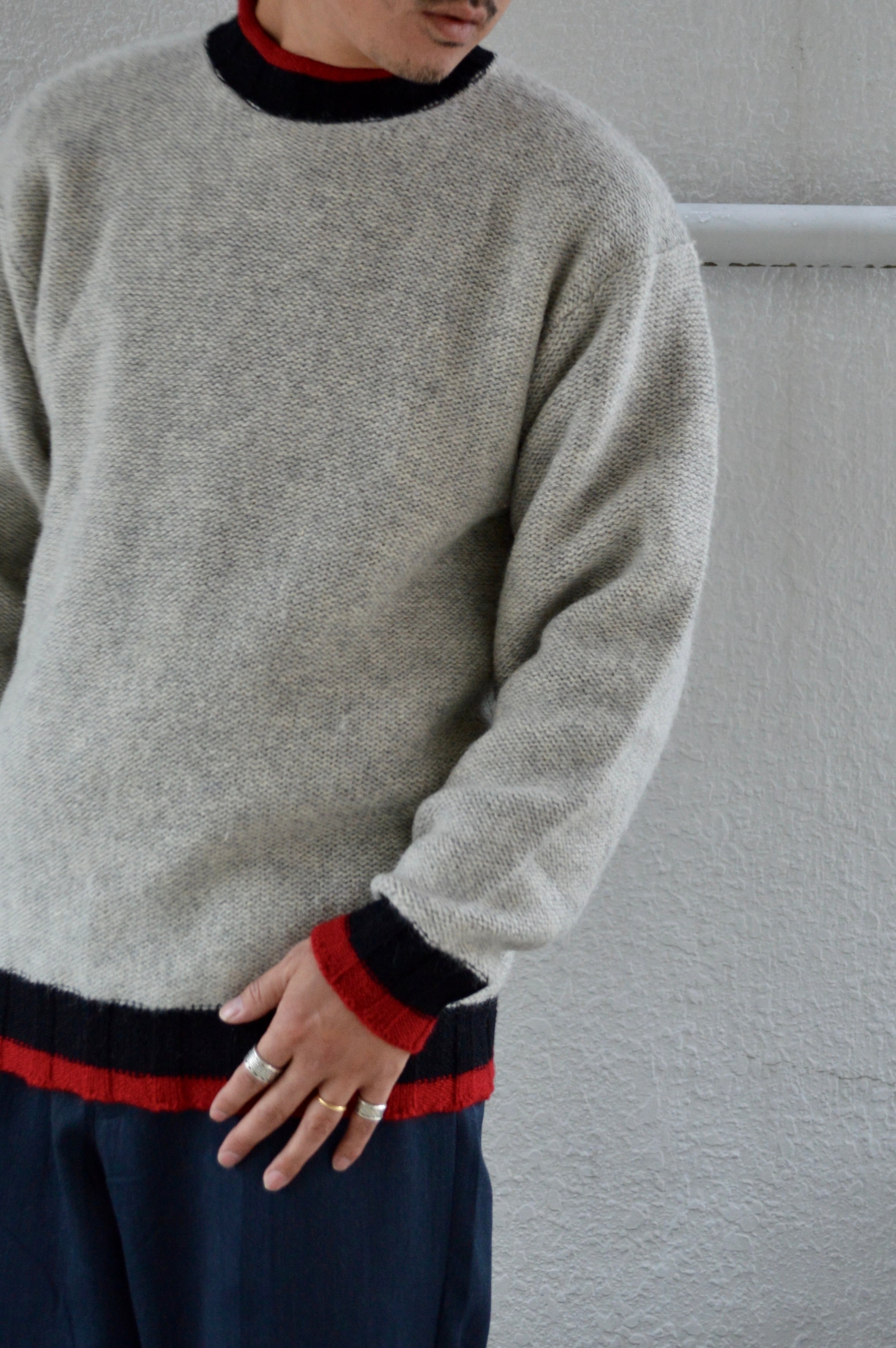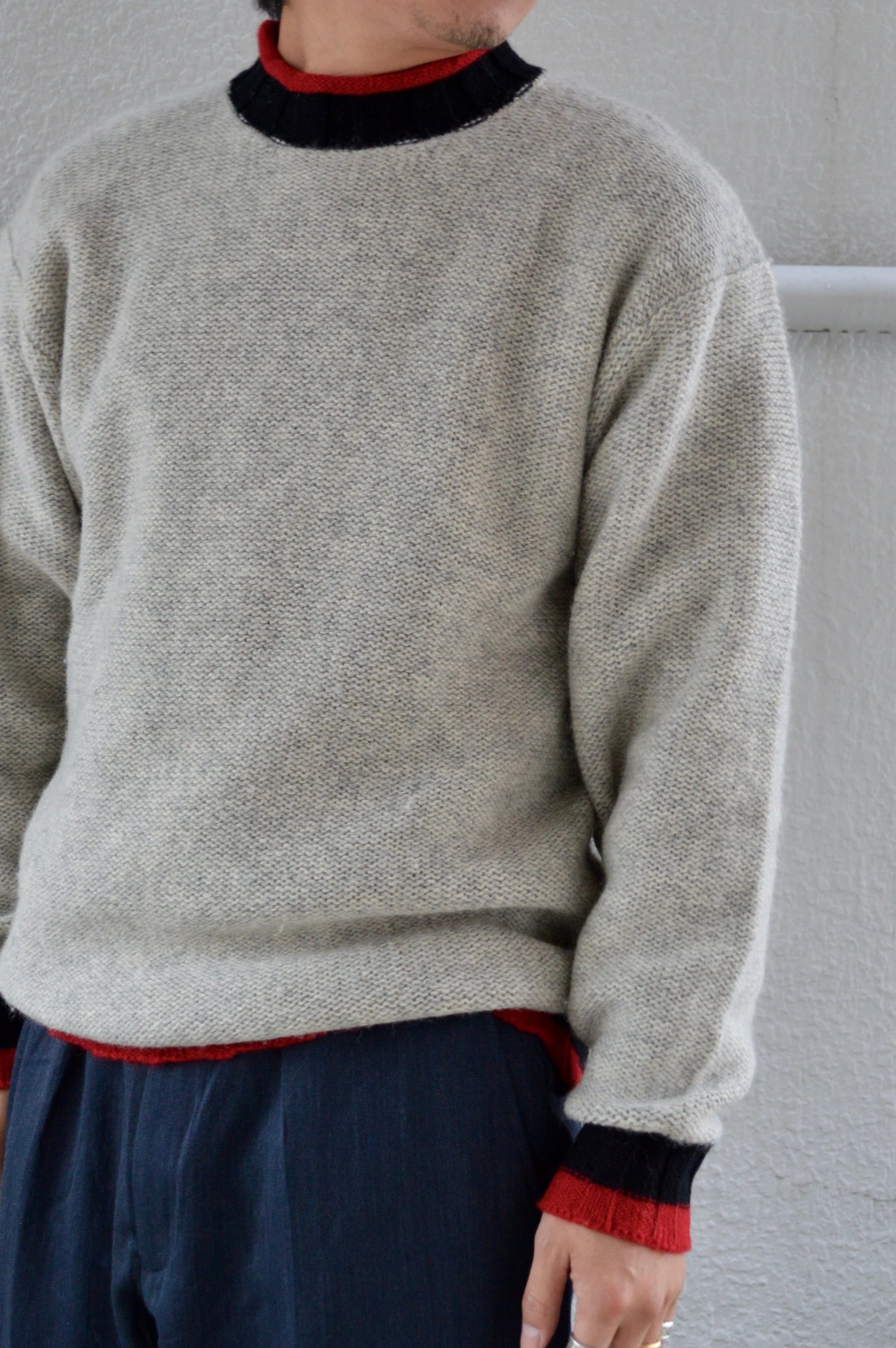 首元、袖先、裾口が赤×黒の配色アクセントになったライトグレーのニット。ミドルウエイトの軽やかなウールセーターでスタンダードなサイジング。