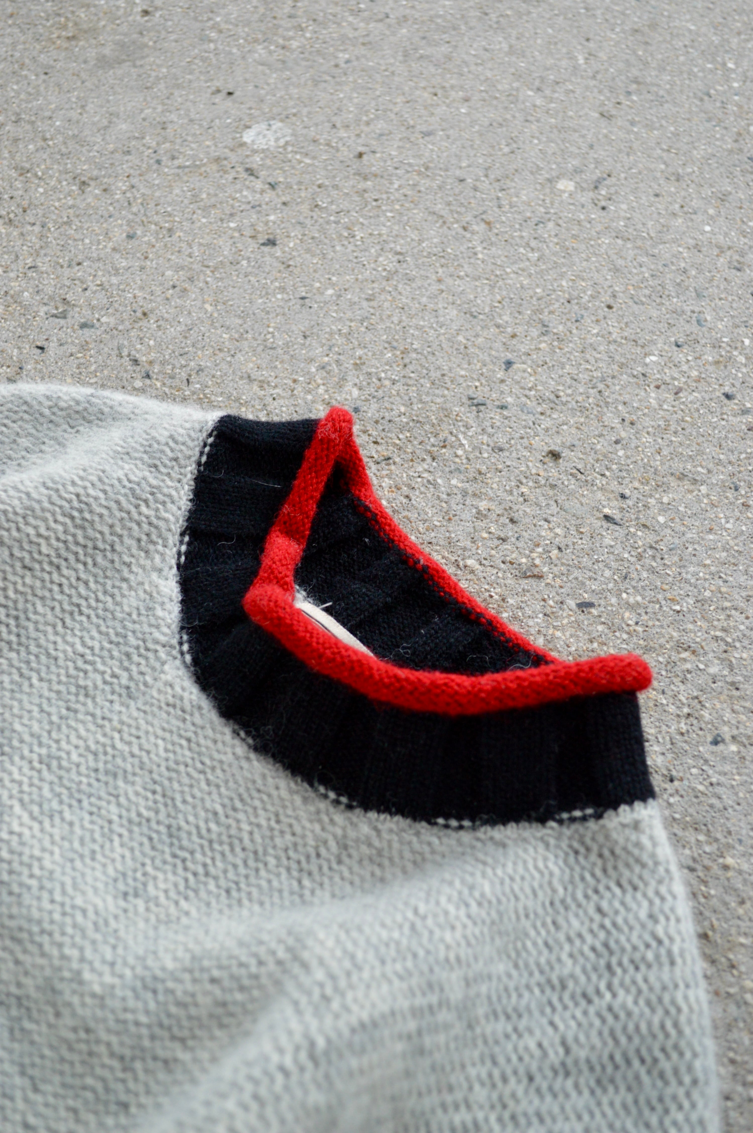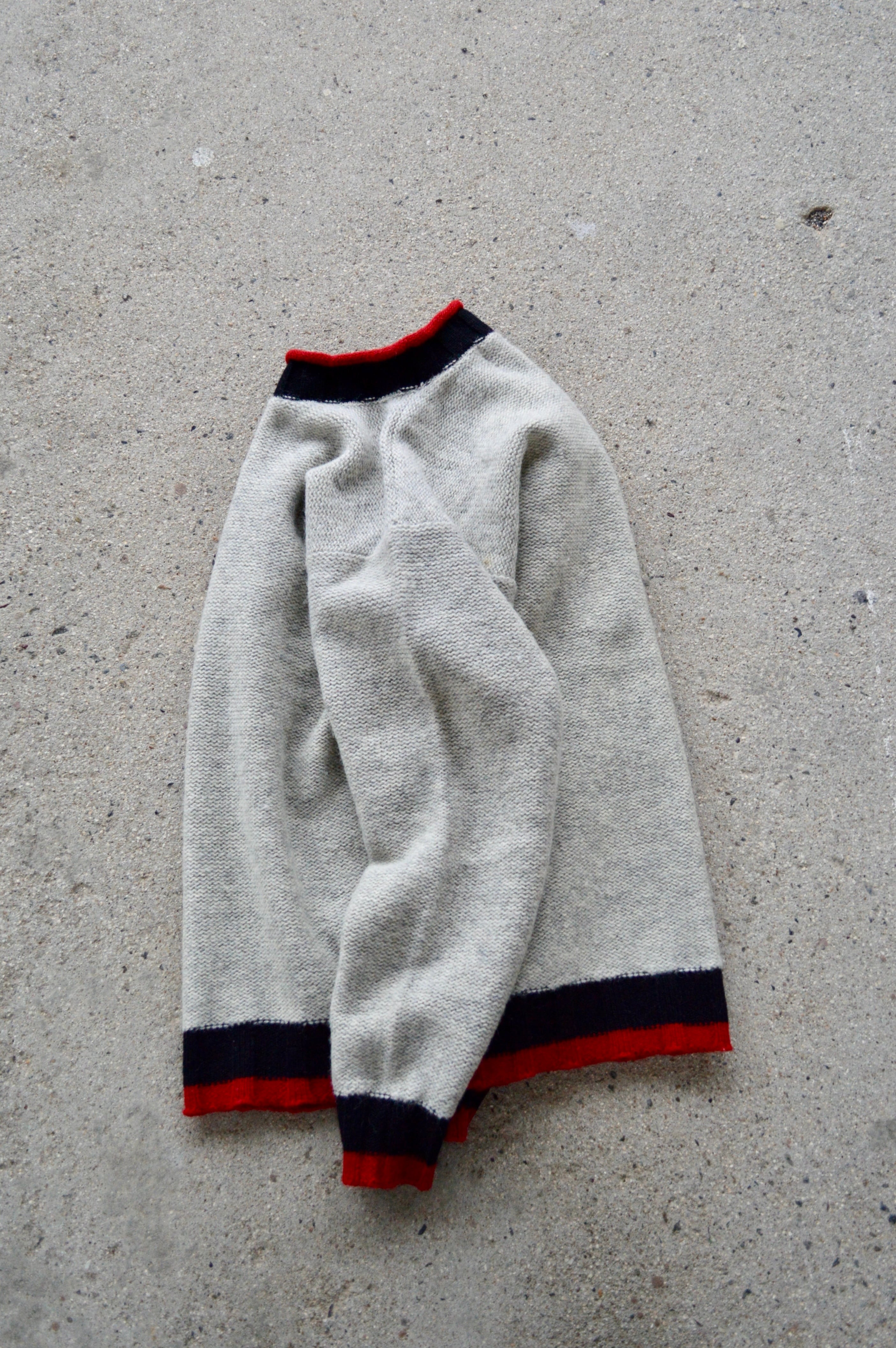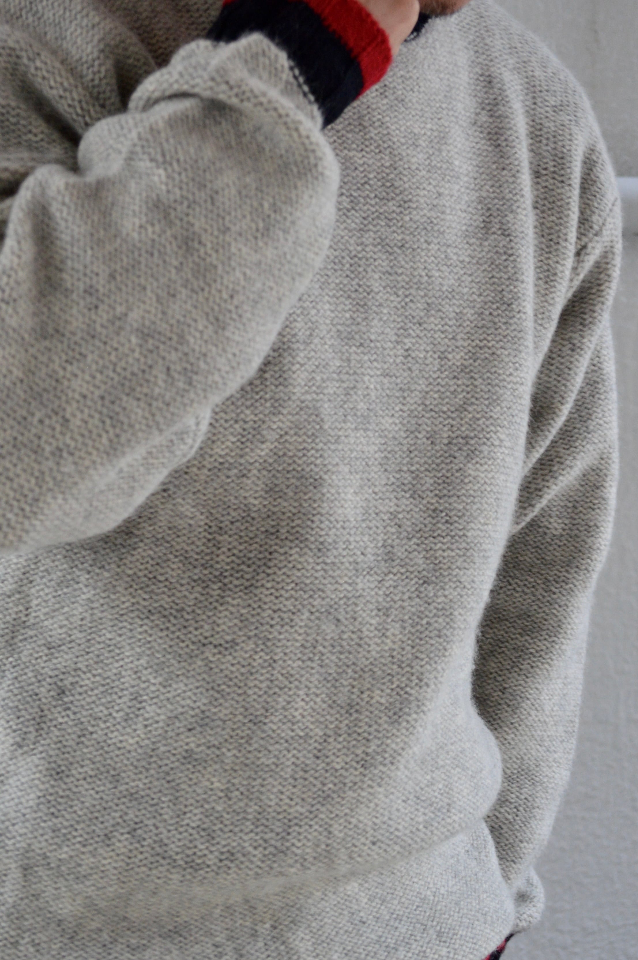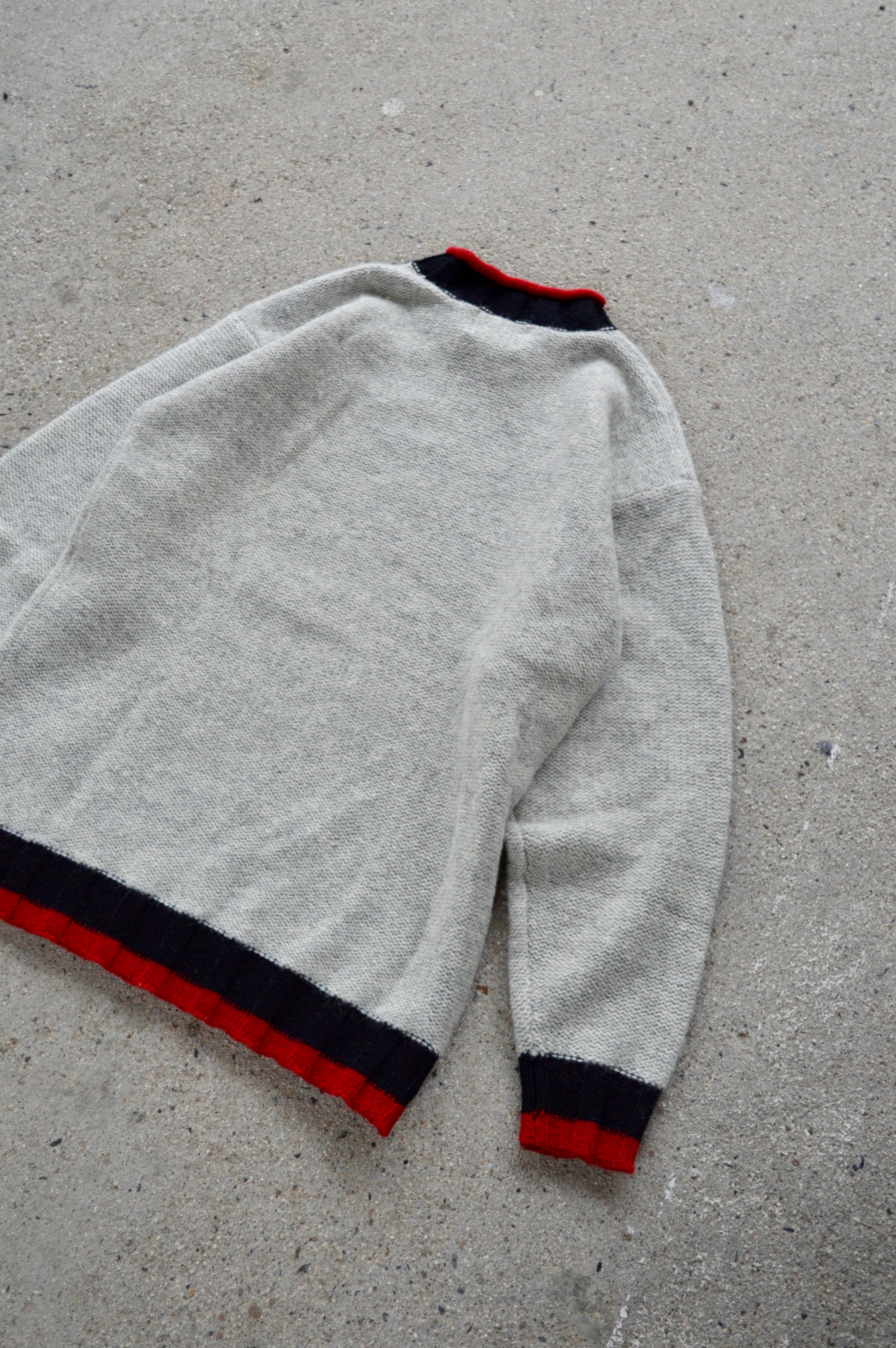 首元、袖先、裾口が赤×黒の配色アクセントになったライトグレーのニット。ミドルウエイトの軽やかなウールセーターでスタンダードなサイジング。