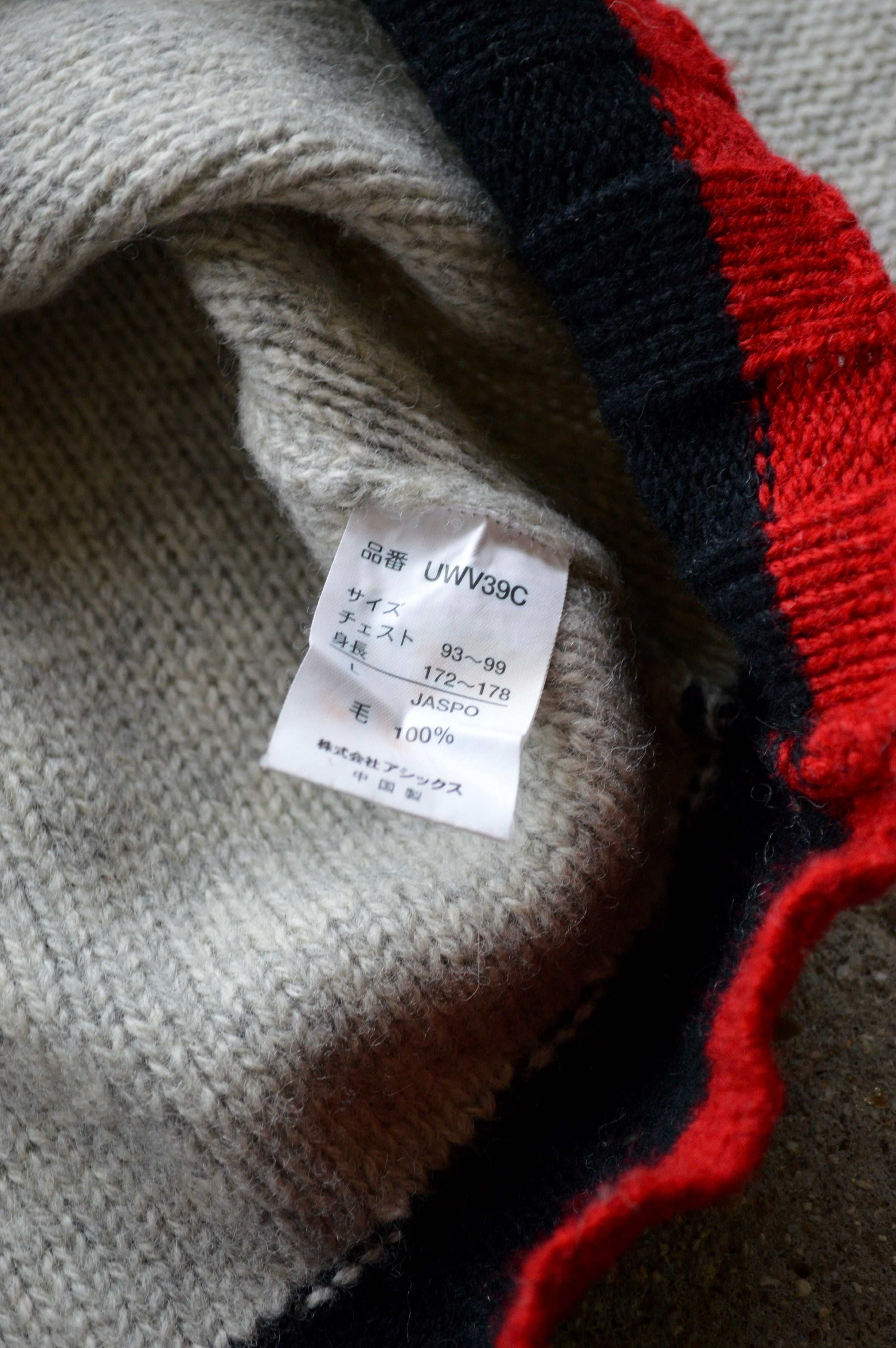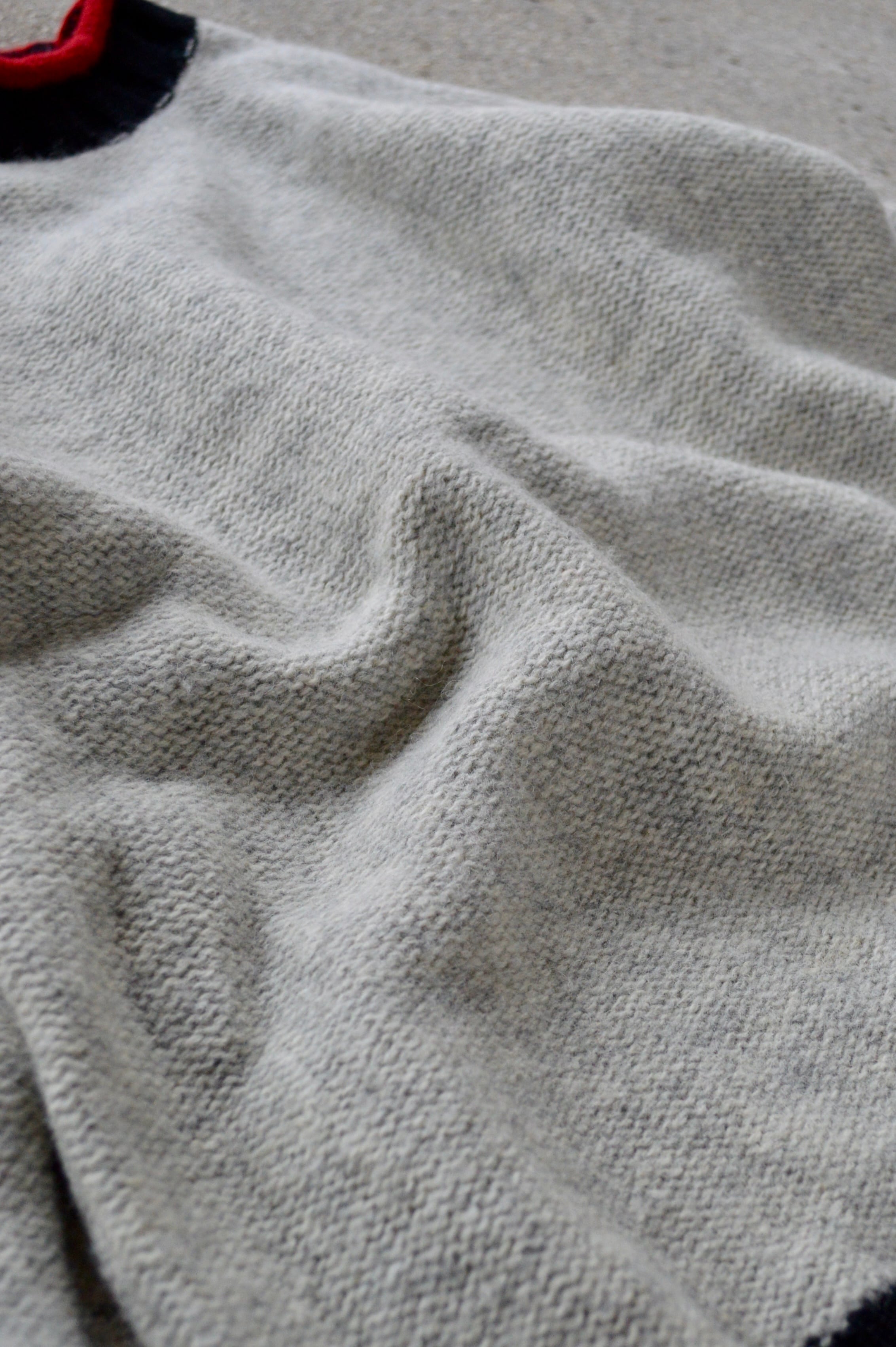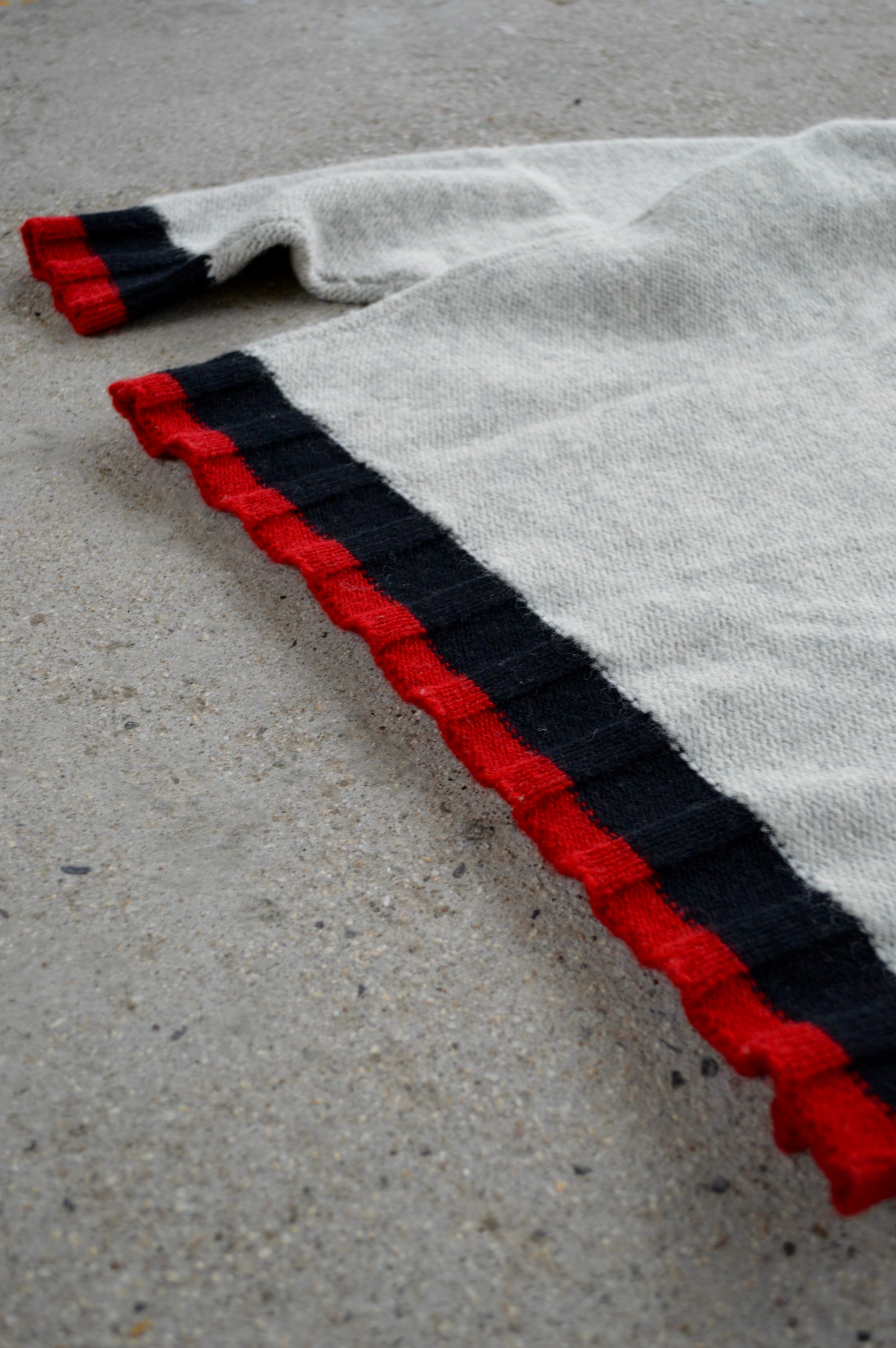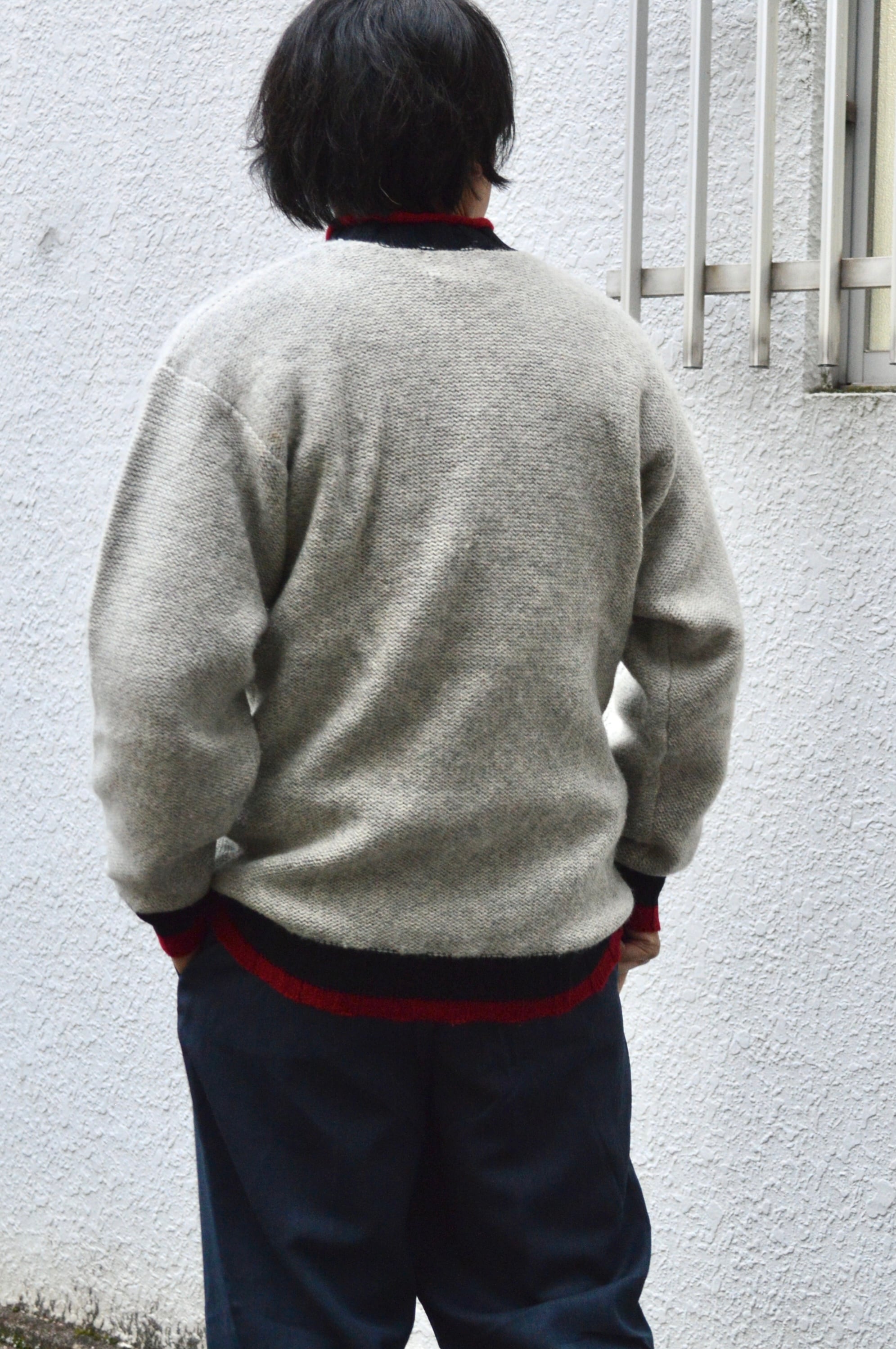 首元、袖先、裾口が赤×黒の配色アクセントになったライトグレーのニット。ミドルウエイトの軽やかなウールセーターでスタンダードなサイジング。