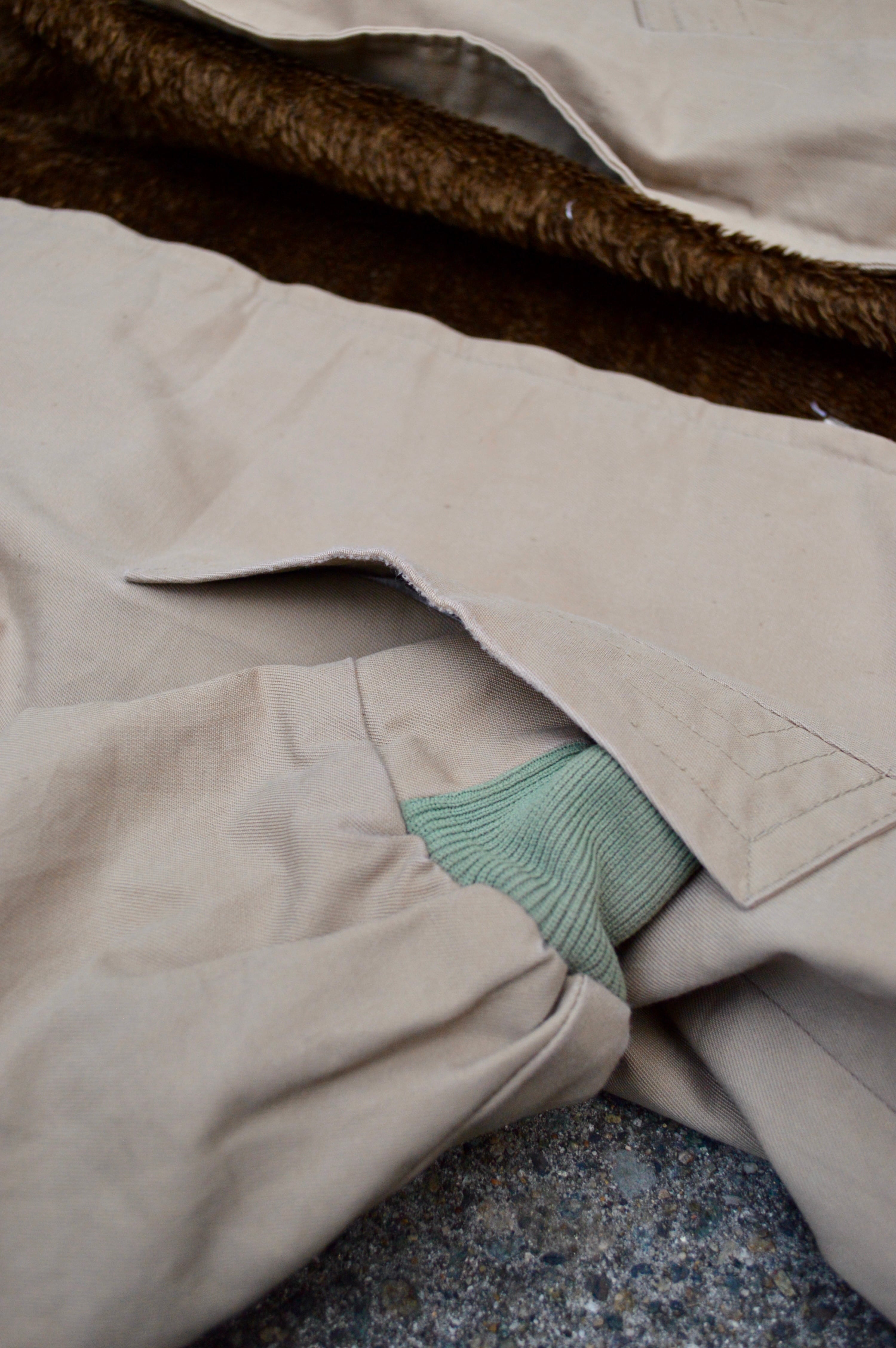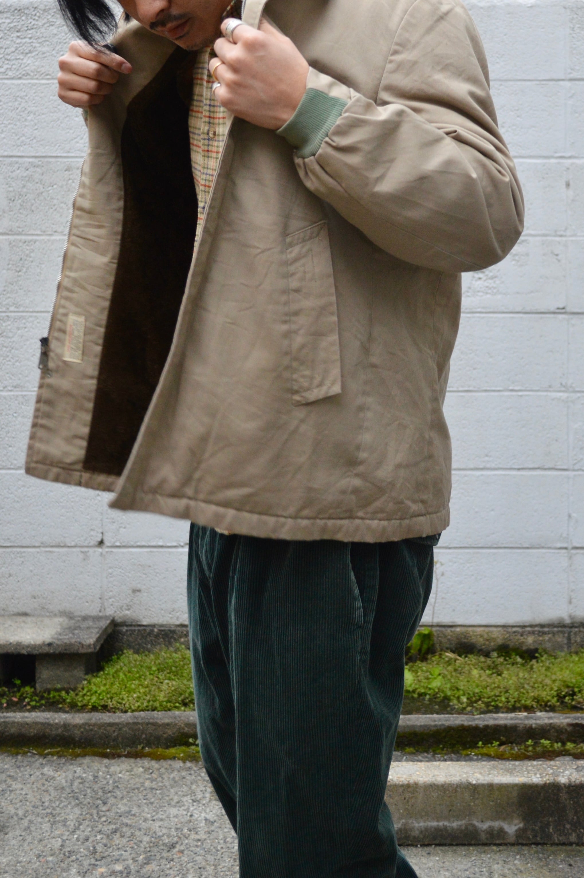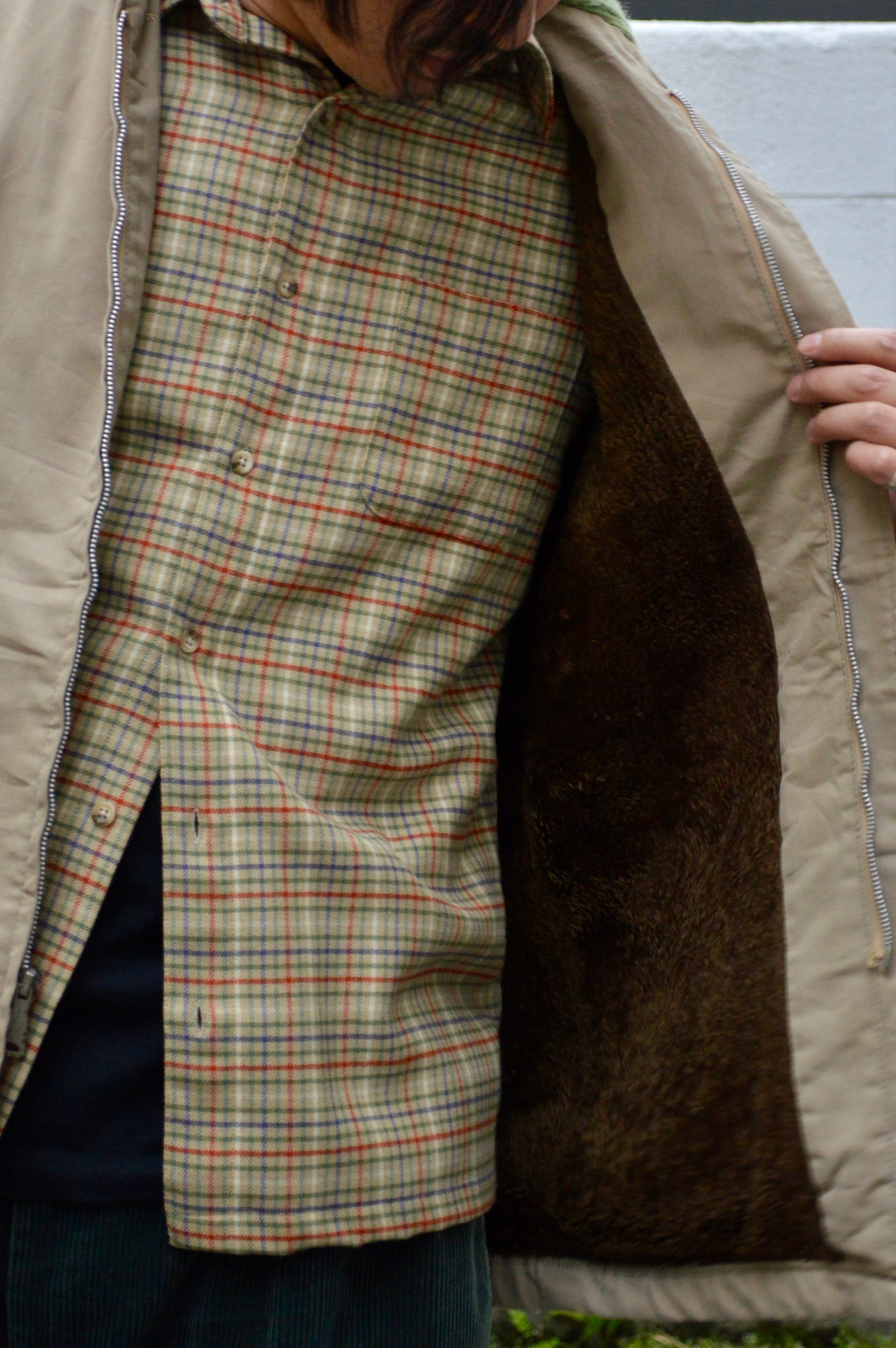 ファラオジャケット特有のショールカラーに腰丈、袖リブデザインのラフなサイジング。裏地は一般的にキルト仕様となりますが、暖が取れるよう身頃は毛足の長いファーボアタイプで珍しい一着。袖裏も抜かりなく、同系色カラーのポリエステルキルティングが施されております。