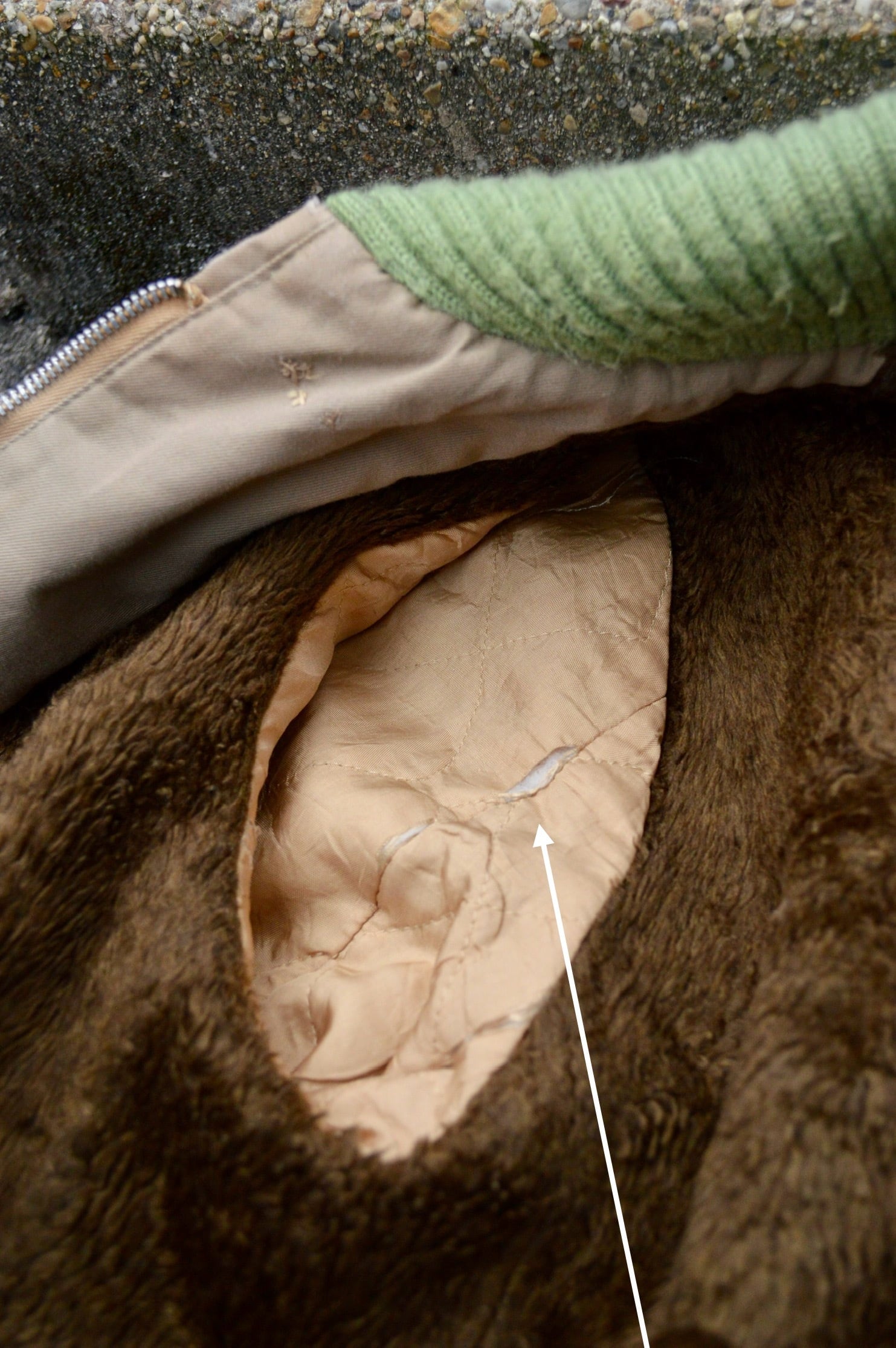 また、片側ポケット側面のステッチ外れとポケット内側破れ、脇位置一部ににキルト破れがあるコンディションとなります。