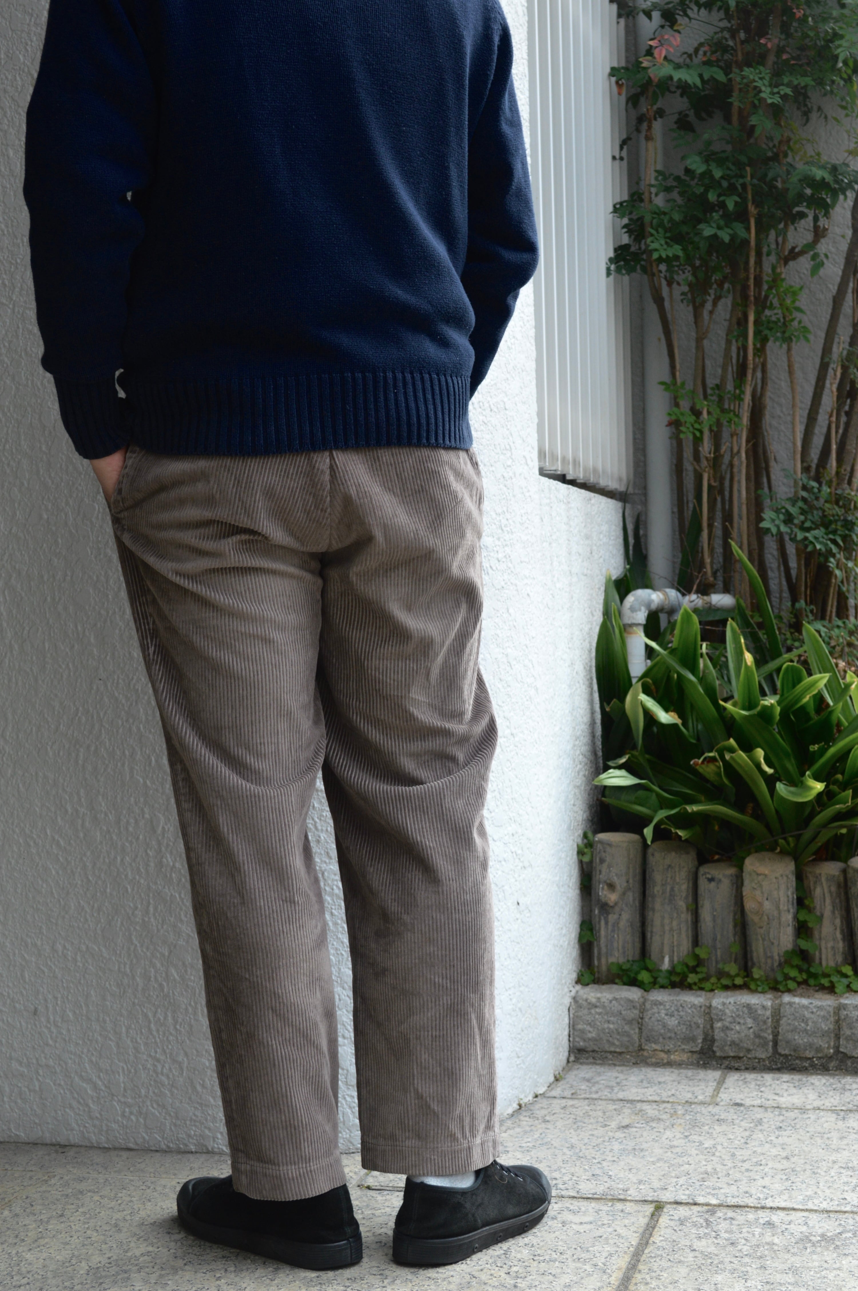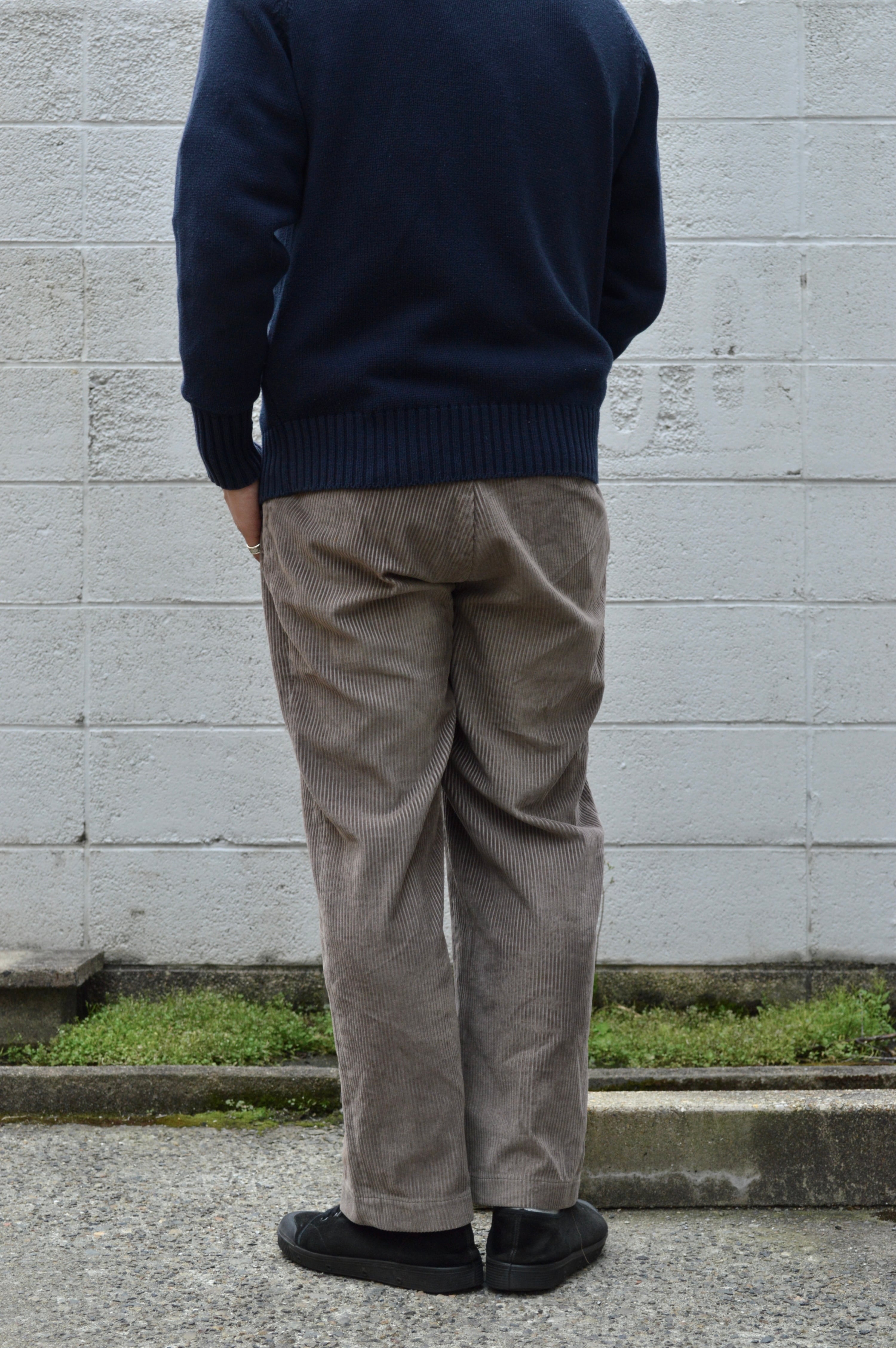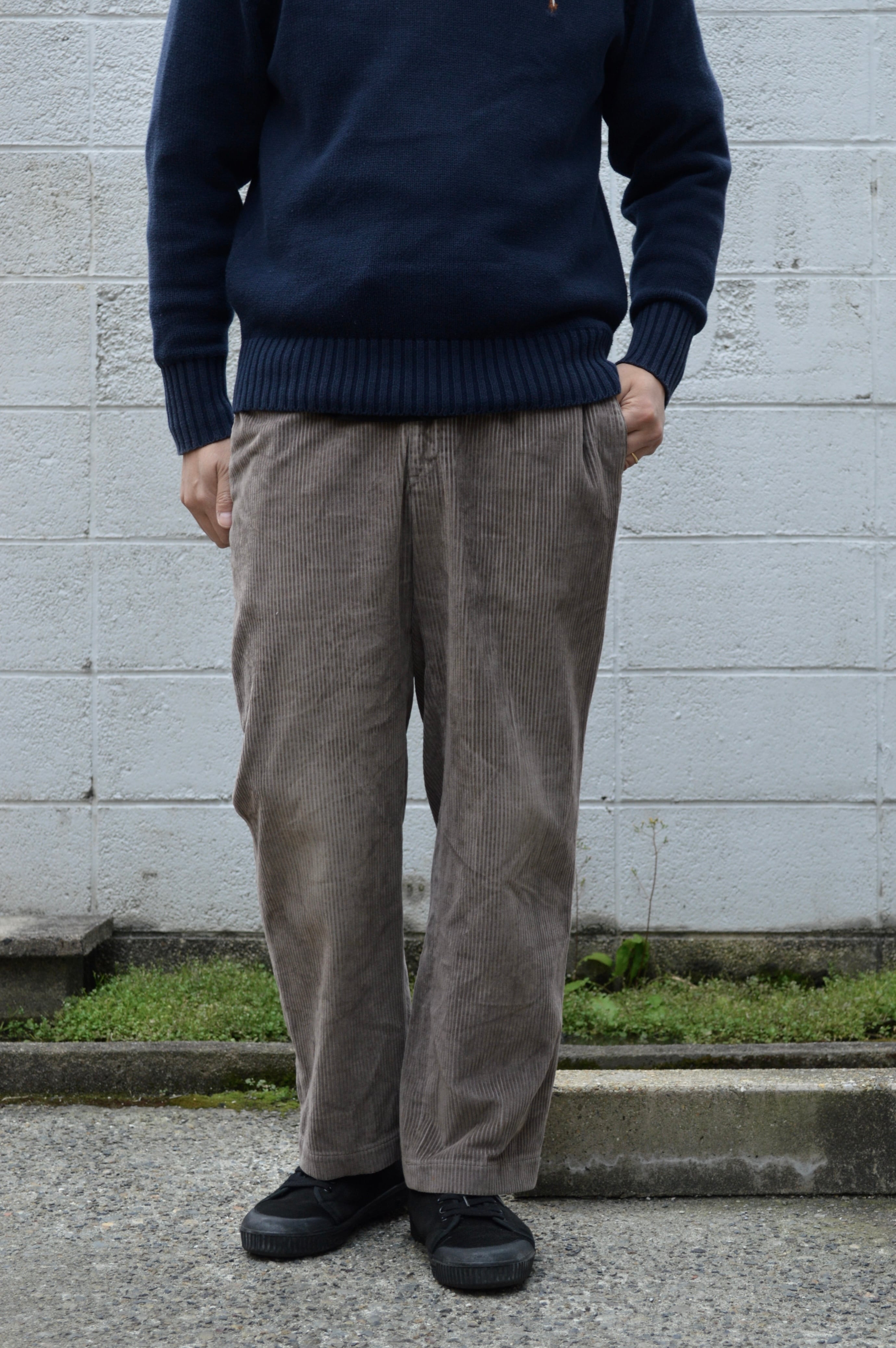 テーパードが一切効かない裾に向かったシンプルなストレートでオールドトラウザーらしい太畝ツータックコーデュロイになります。