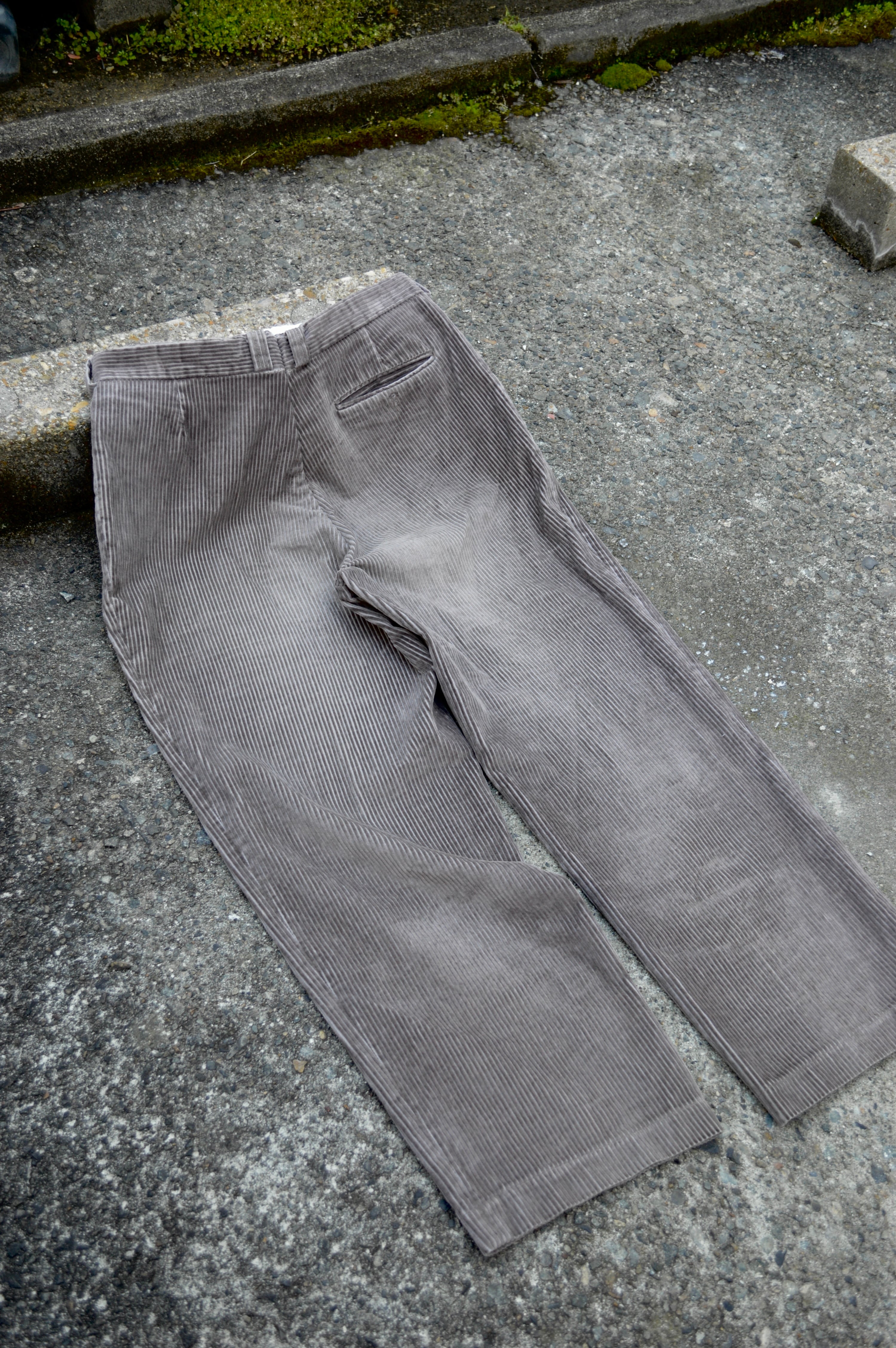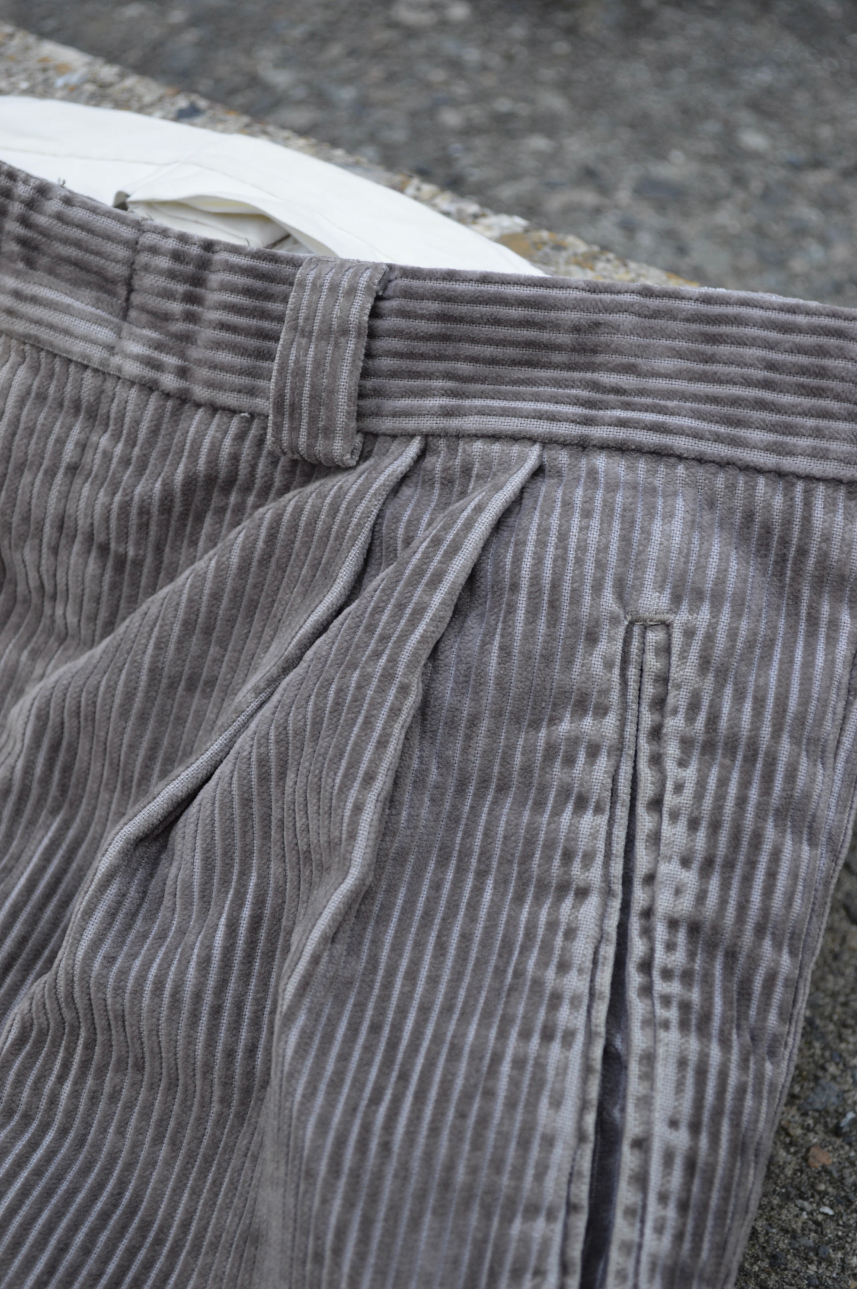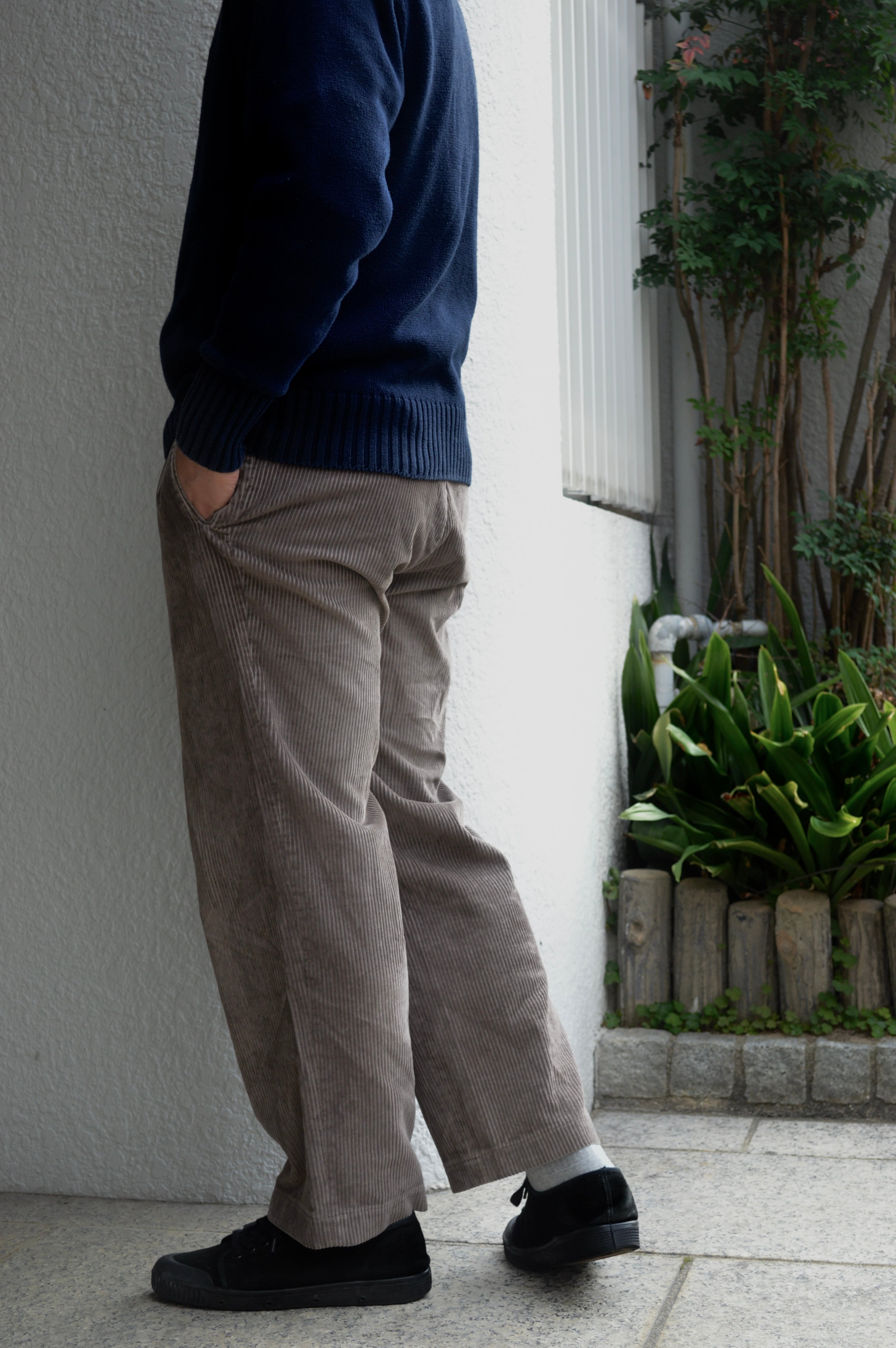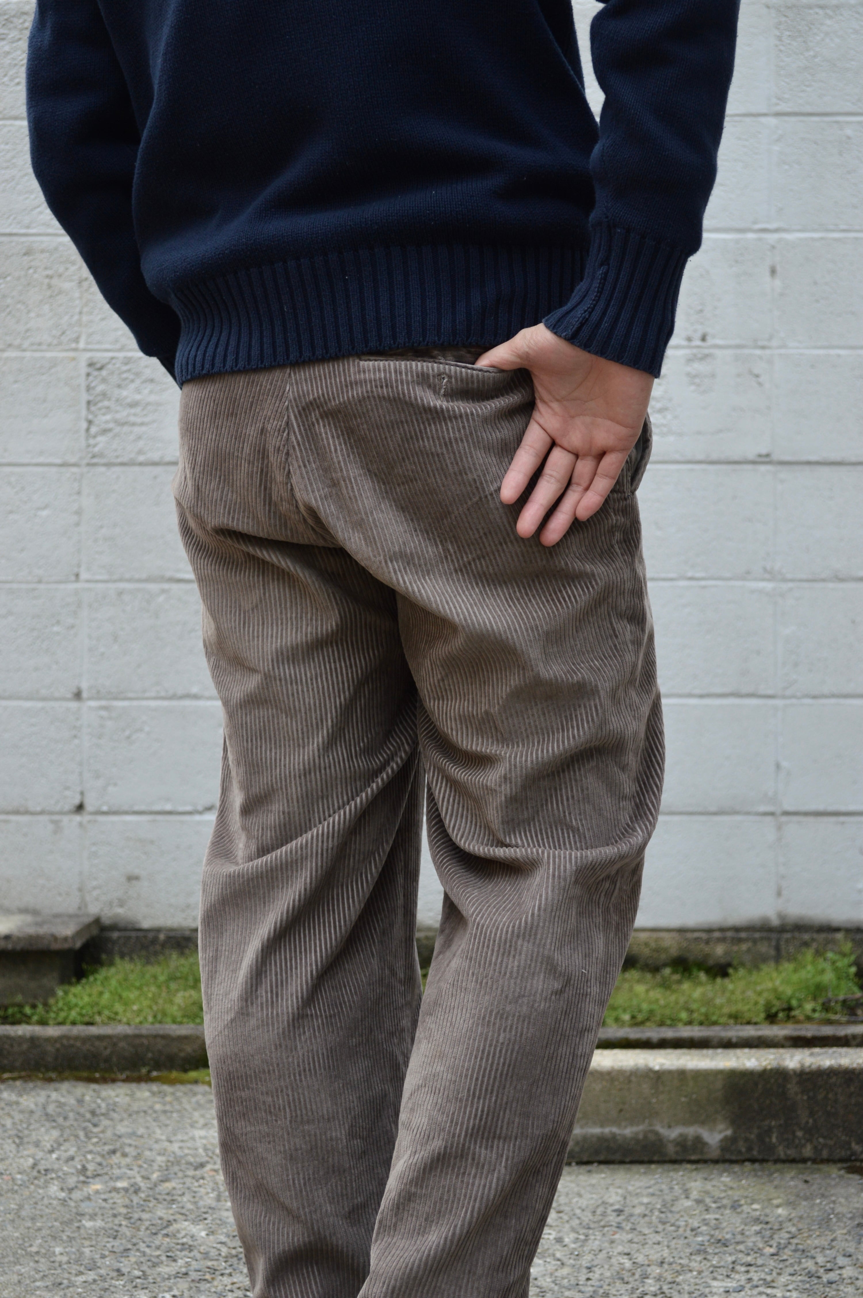 テーパードが一切効かない裾に向かったシンプルなストレートでオールドトラウザーらしい太畝ツータックコーデュロイになります。