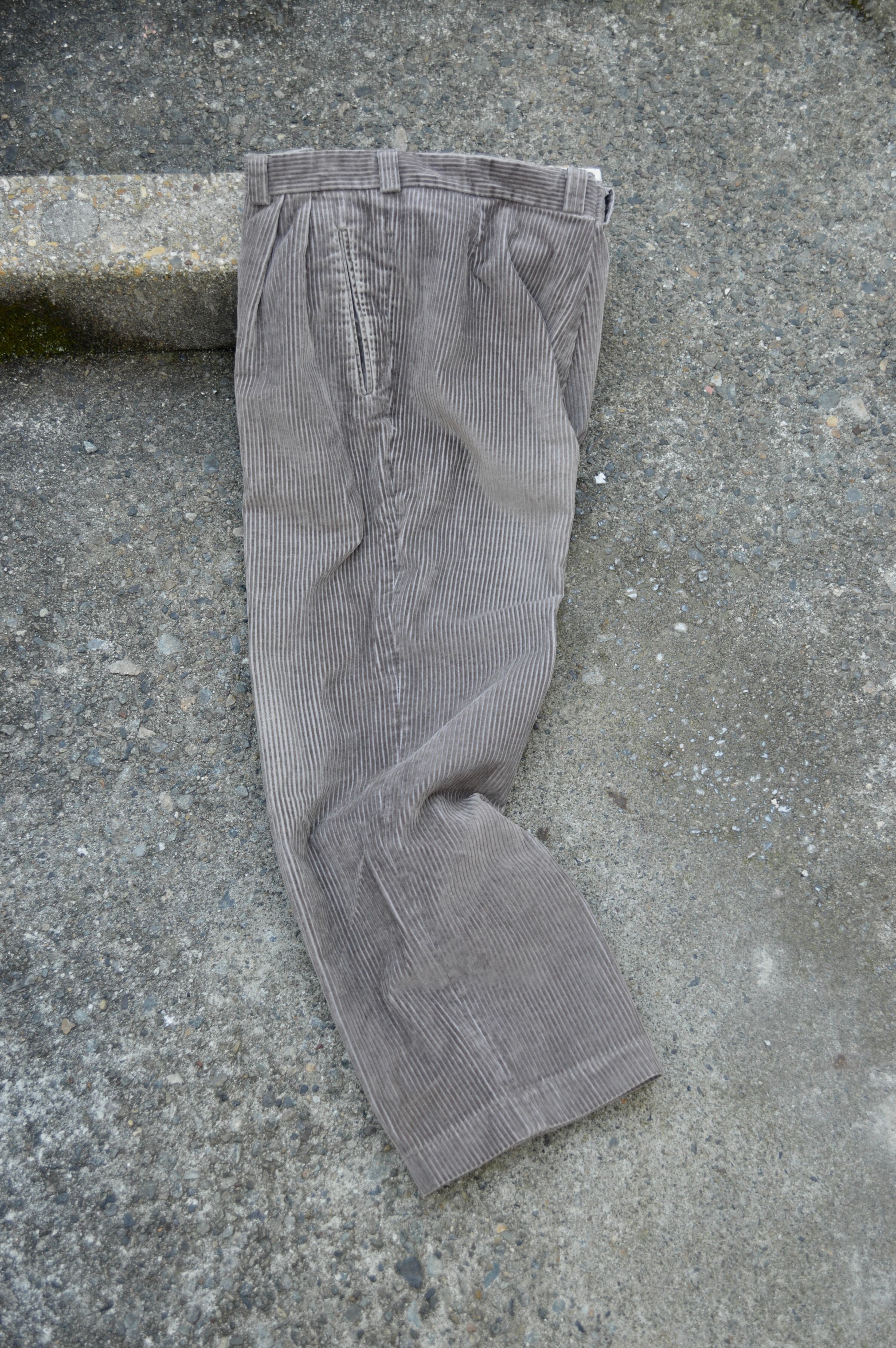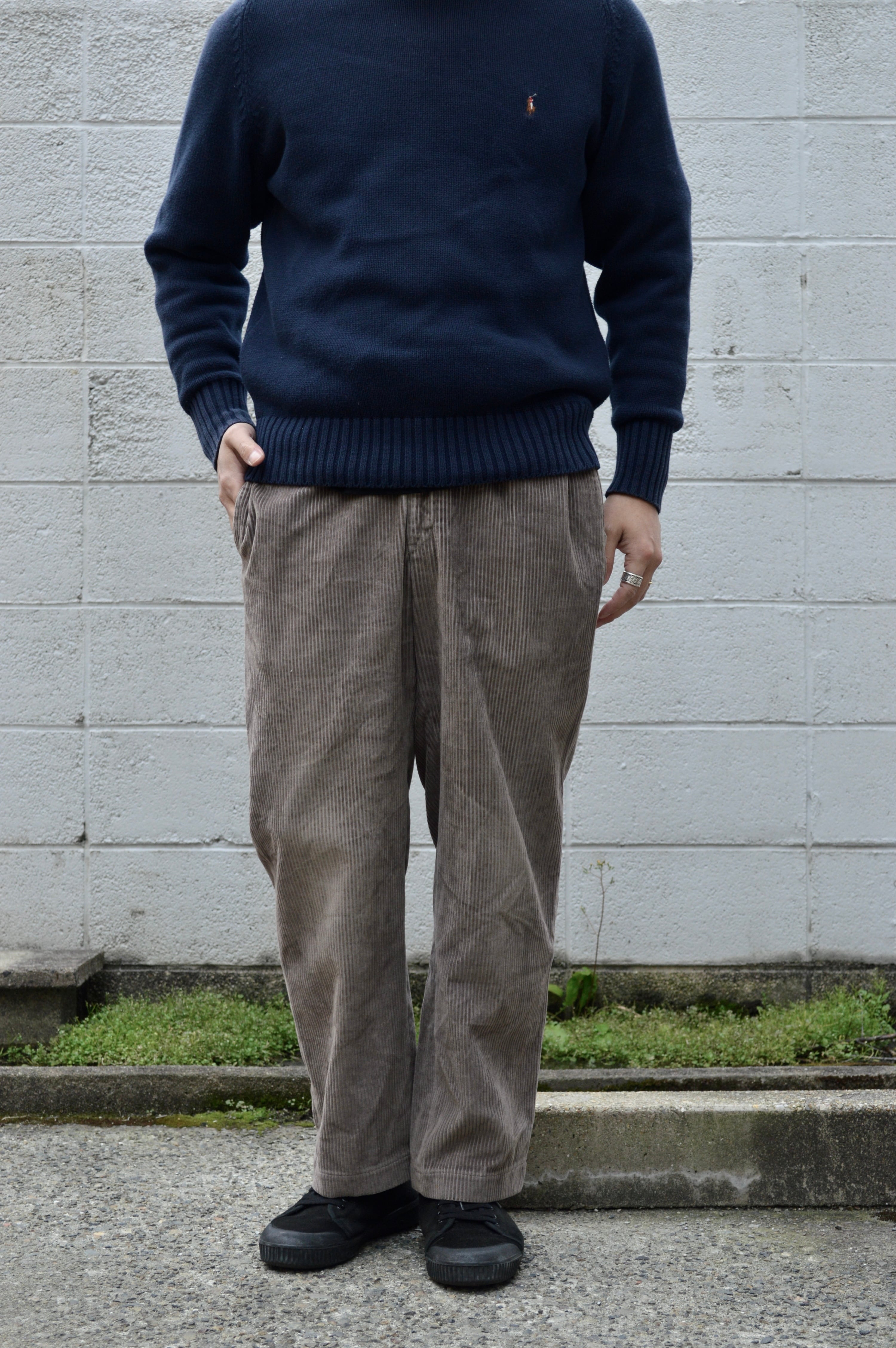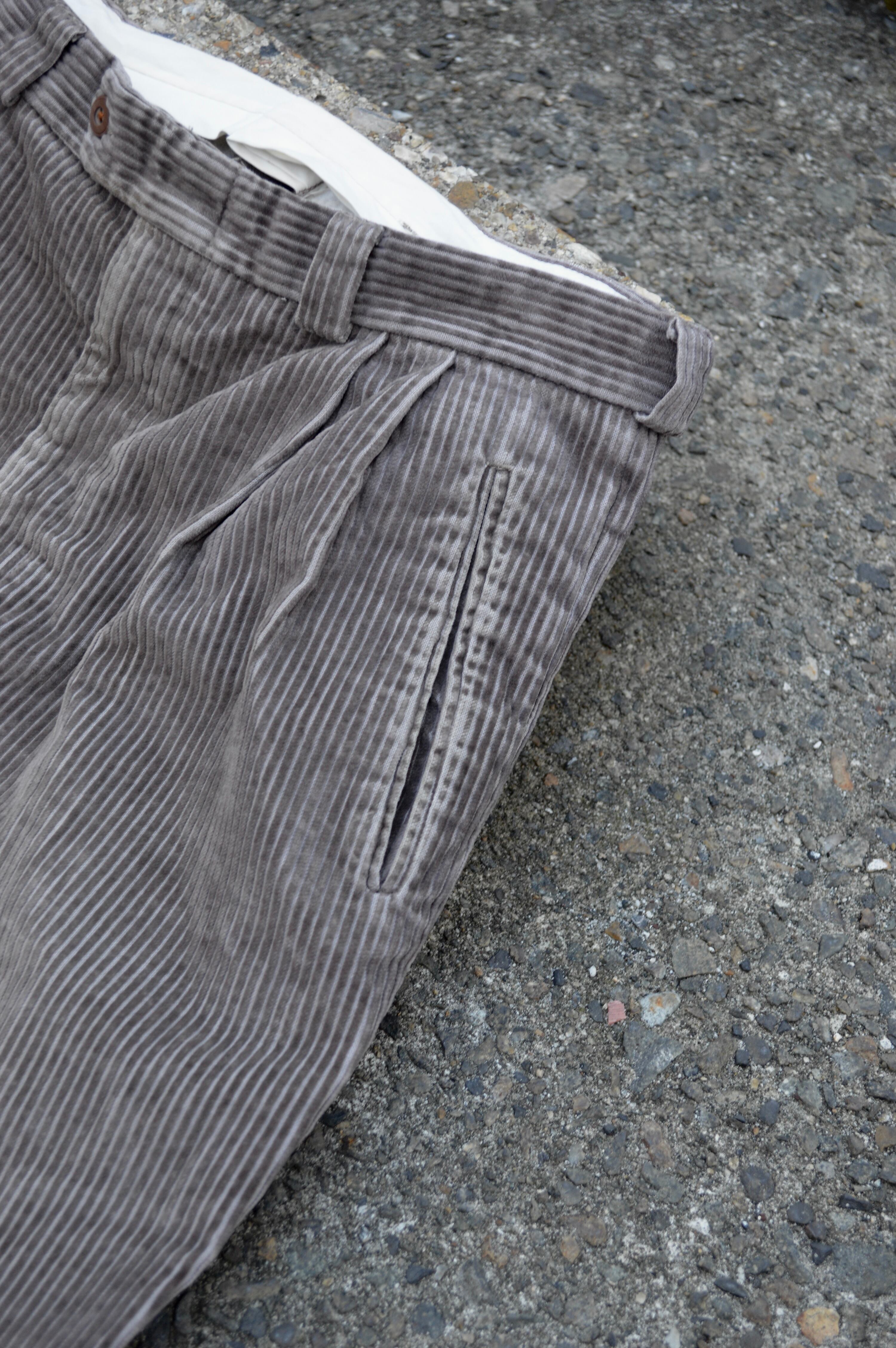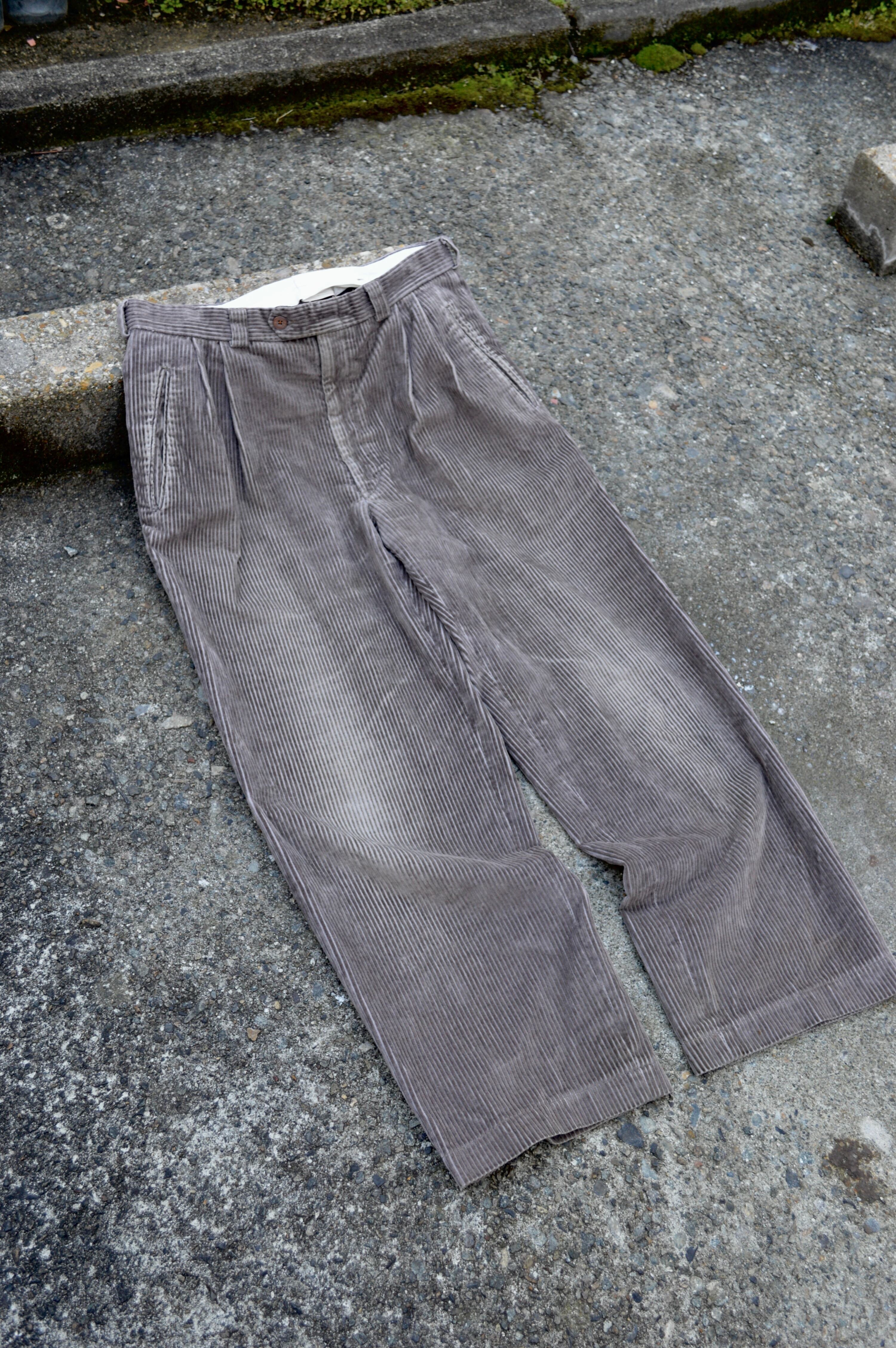 腰回りから裾にかけてストンと綺麗に落ちる緩やかなシルエットでアウトプリーツタックが際立ったコーデュロイトラウザー。オールド古着ならではやや、やれ感と膝周りの色抜けがありますがクタっと履きたい古着好きの方にはおすすめの一着となります。