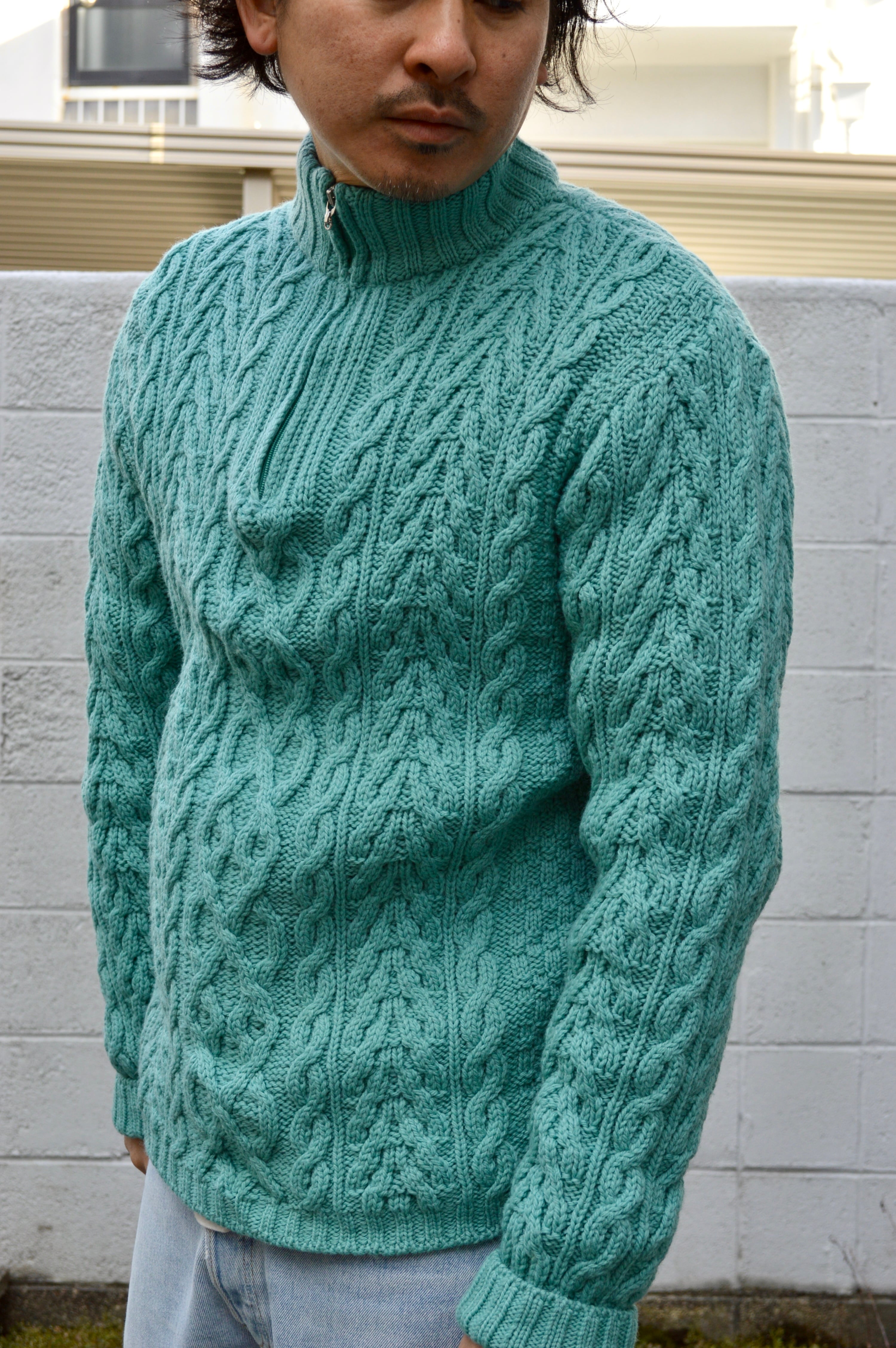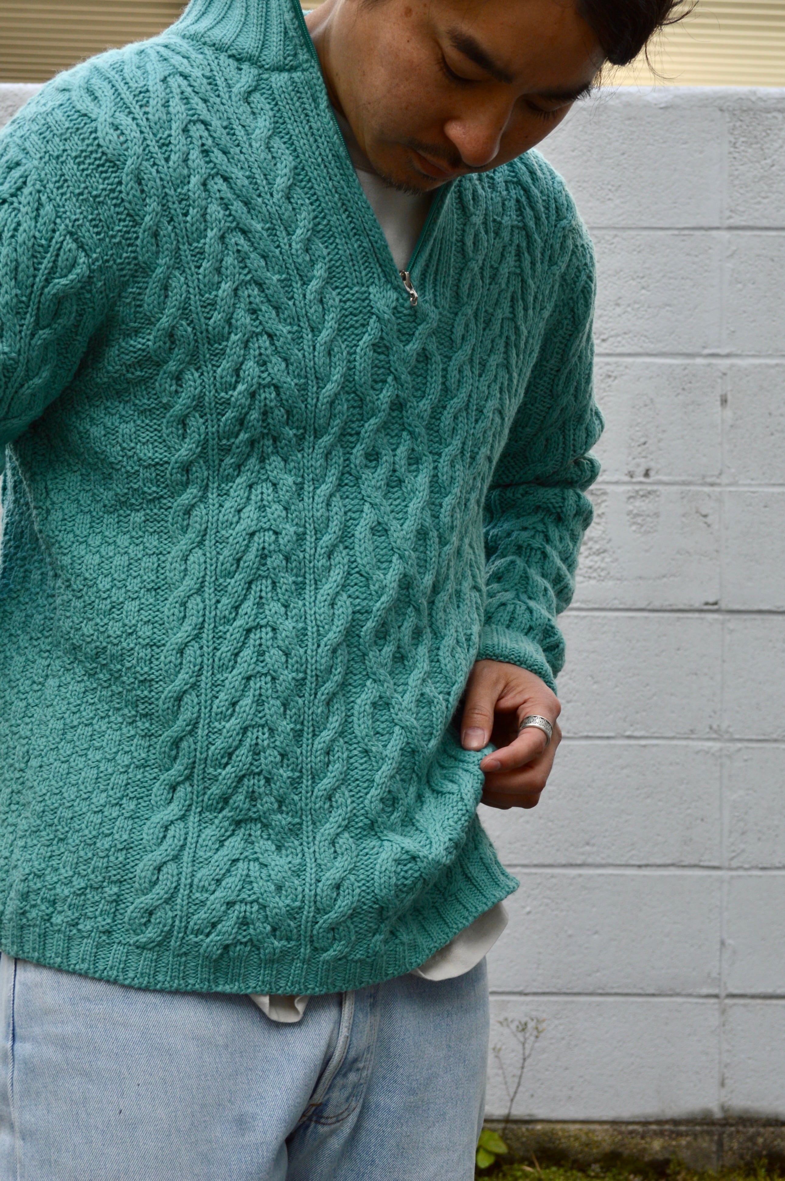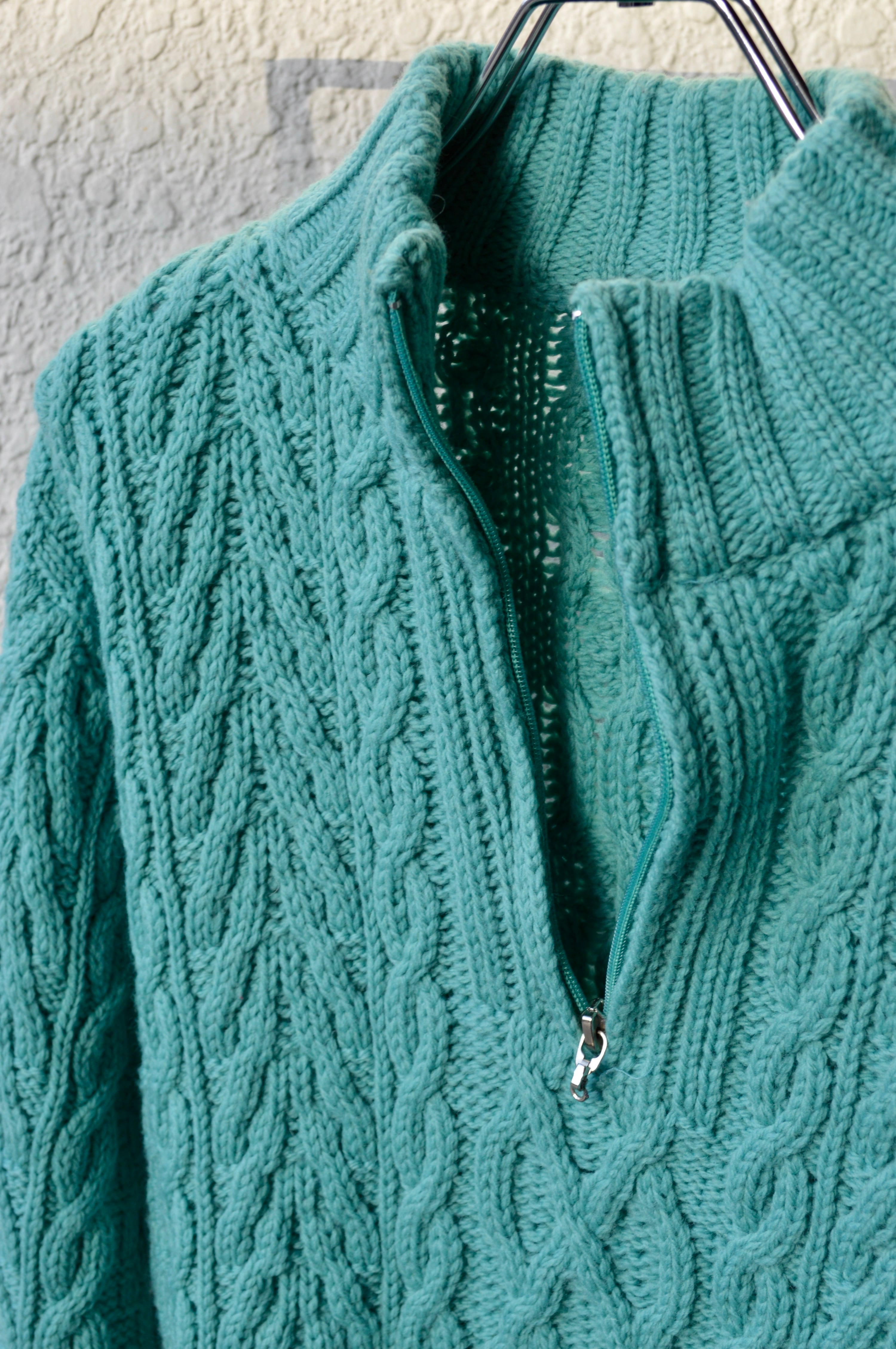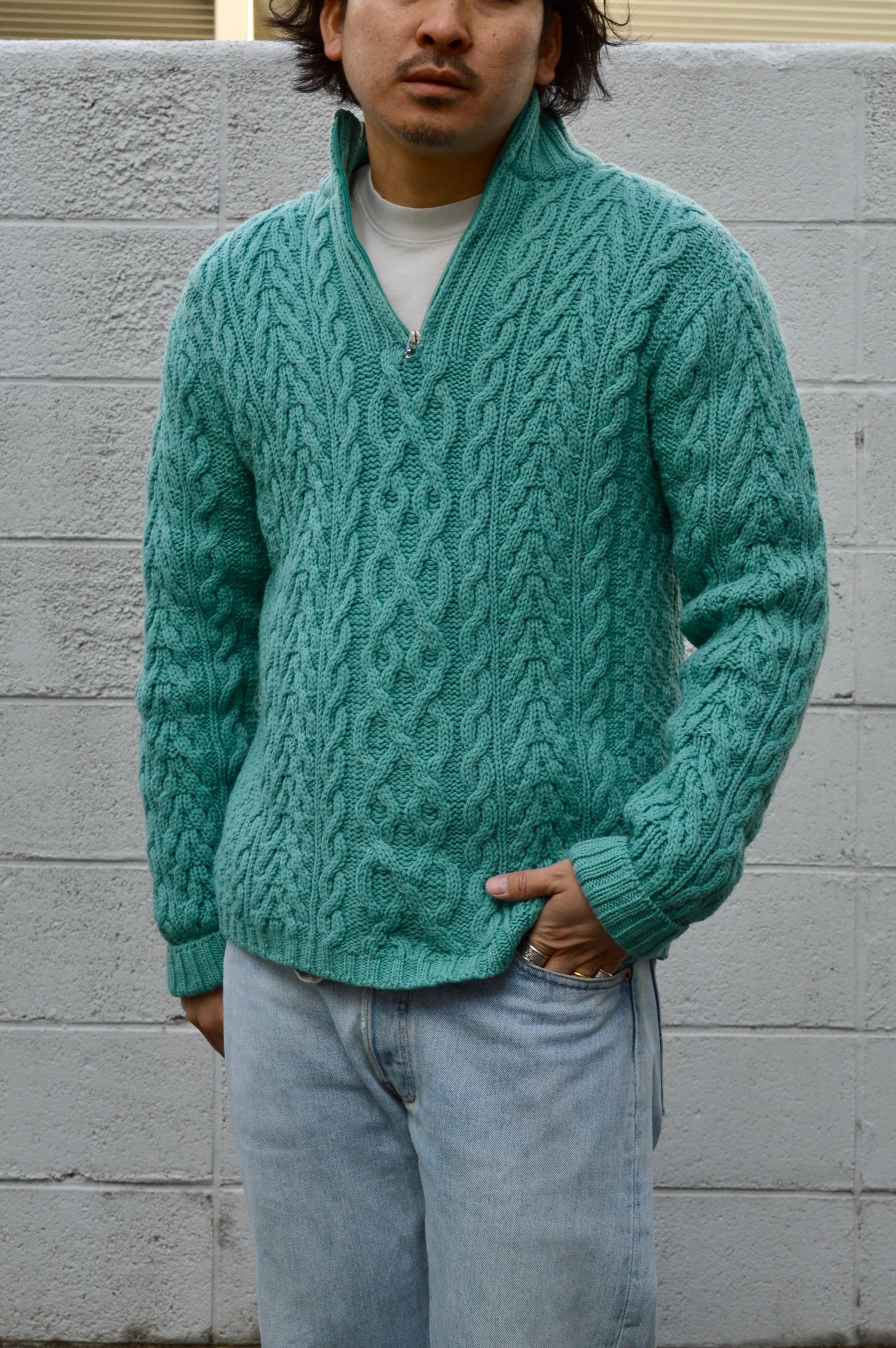 arancrafts 90s Harf Zip Fisherman Sweater Made in Ireland Merino Wool Turquoise アランクラフト 90年代 フィッシャーマンセーター