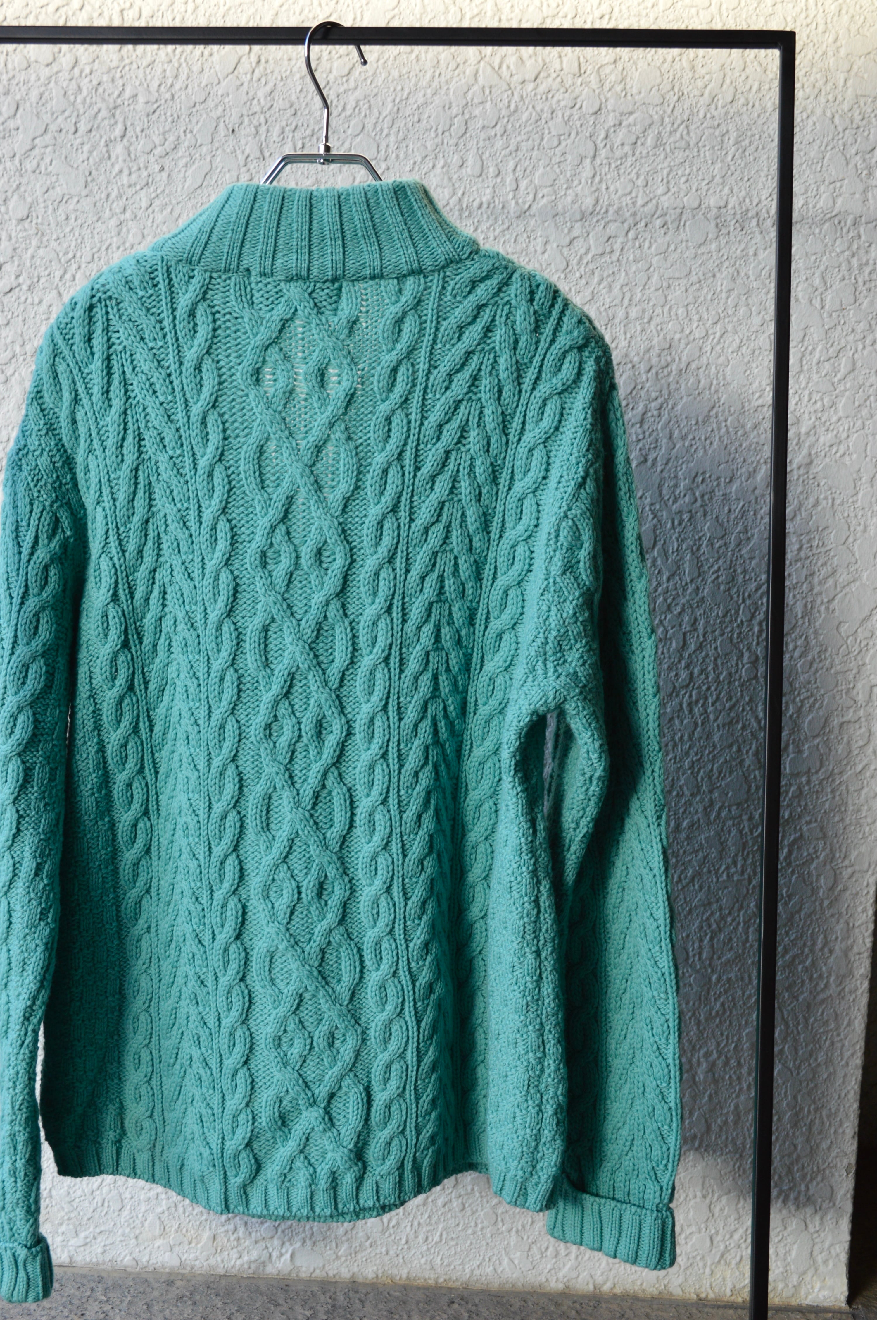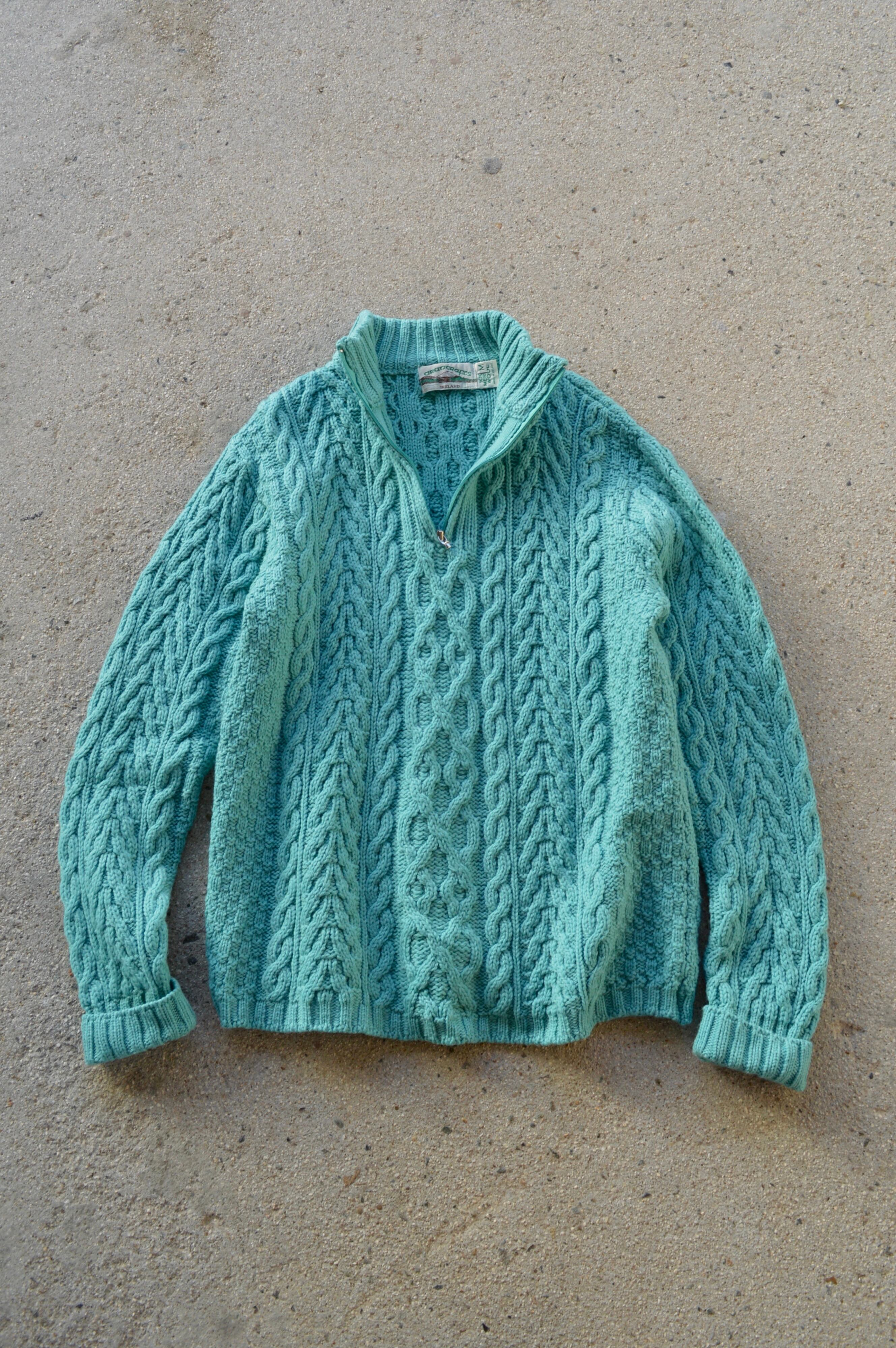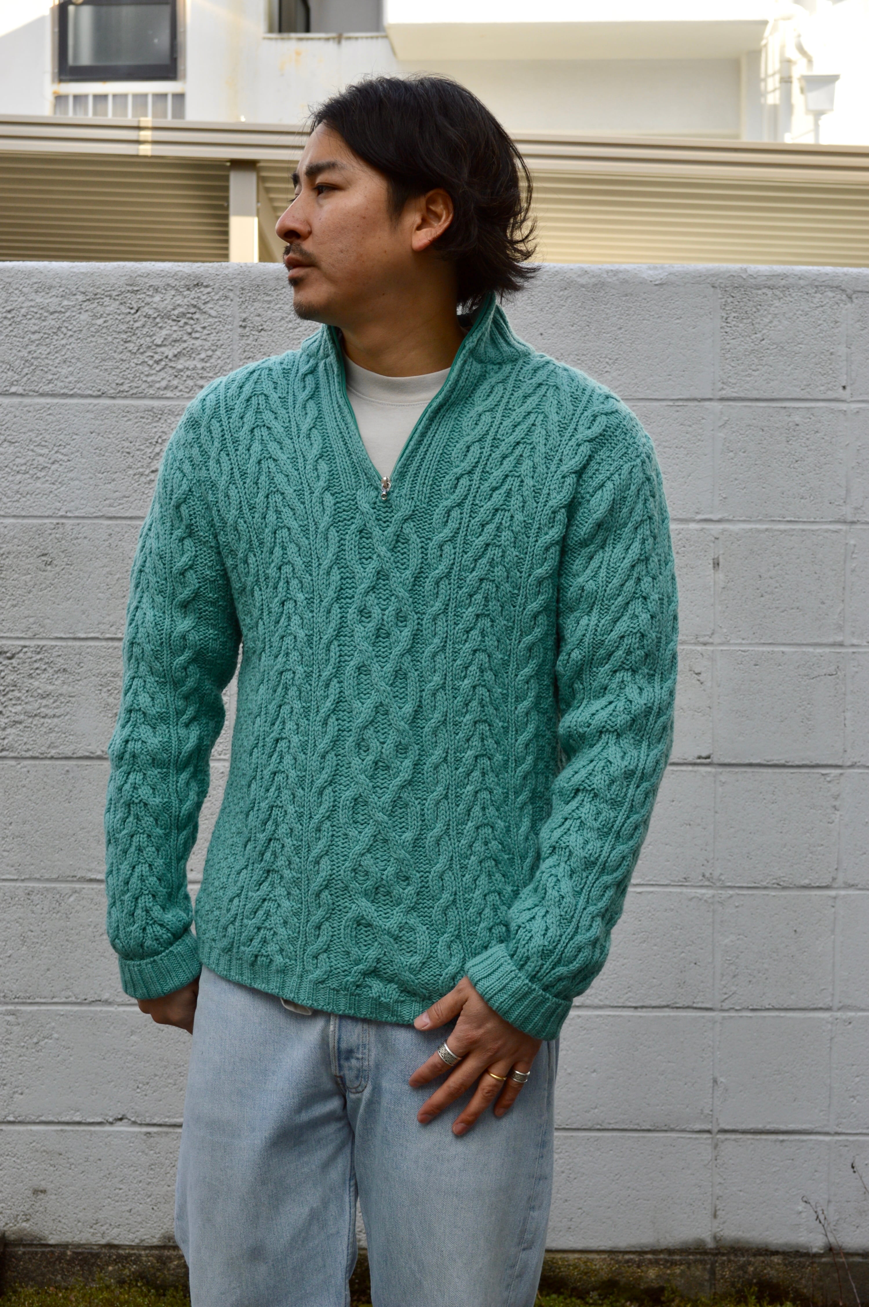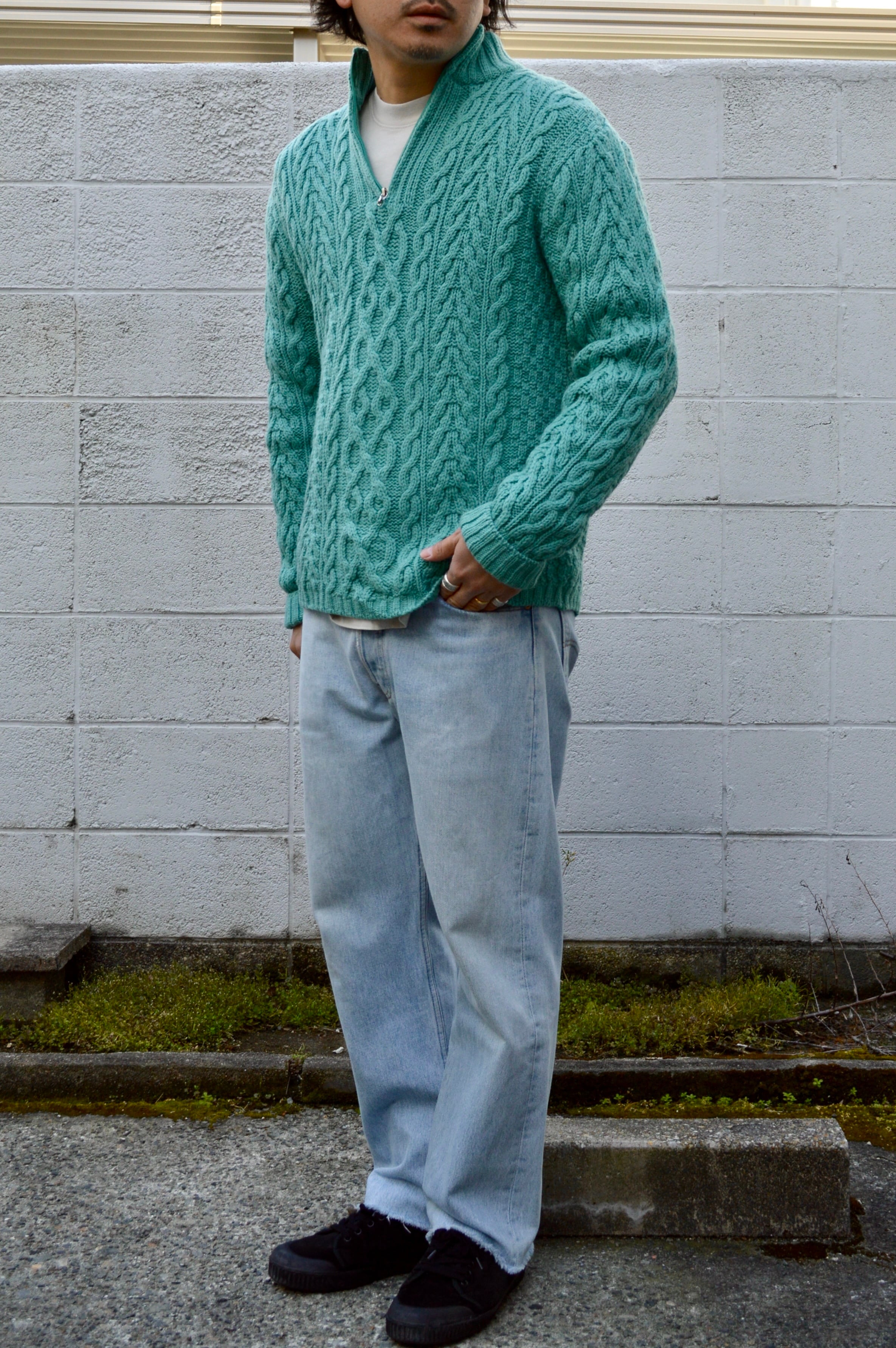 arancrafts 90s Harf Zip Fisherman Sweater Made in Ireland Merino Wool Turquoise アランクラフト 90年代 フィッシャーマンセーター