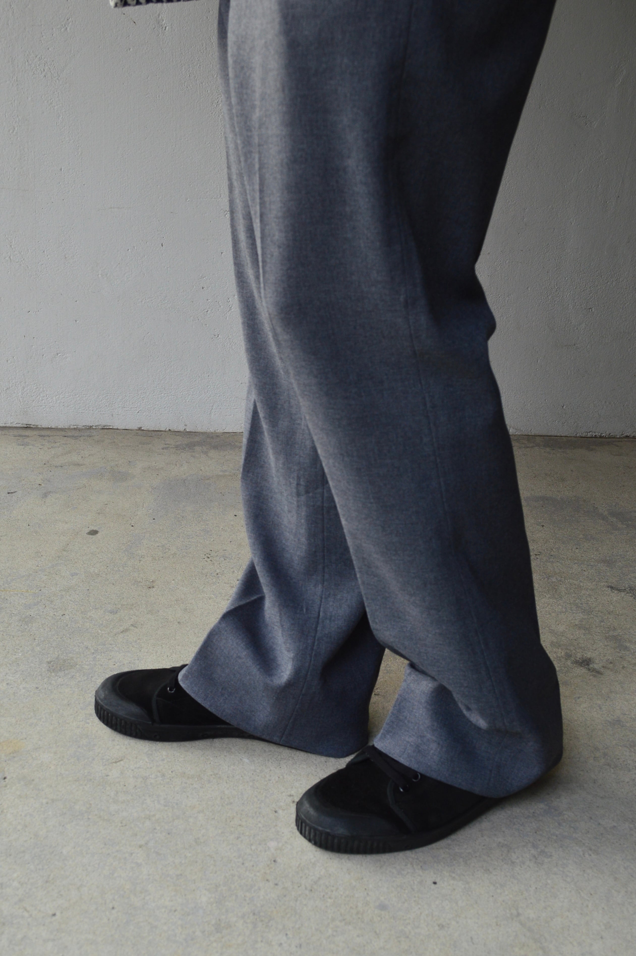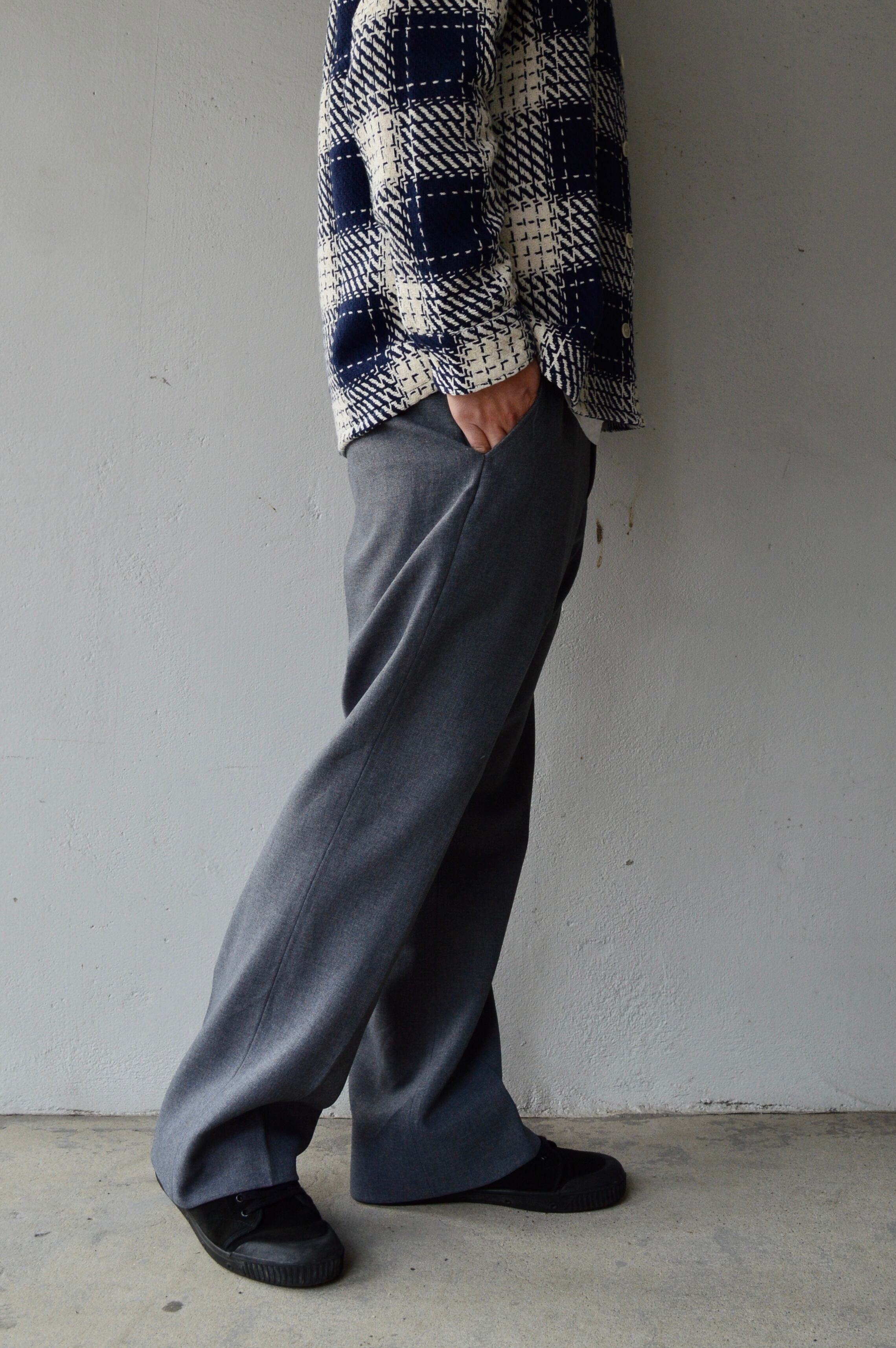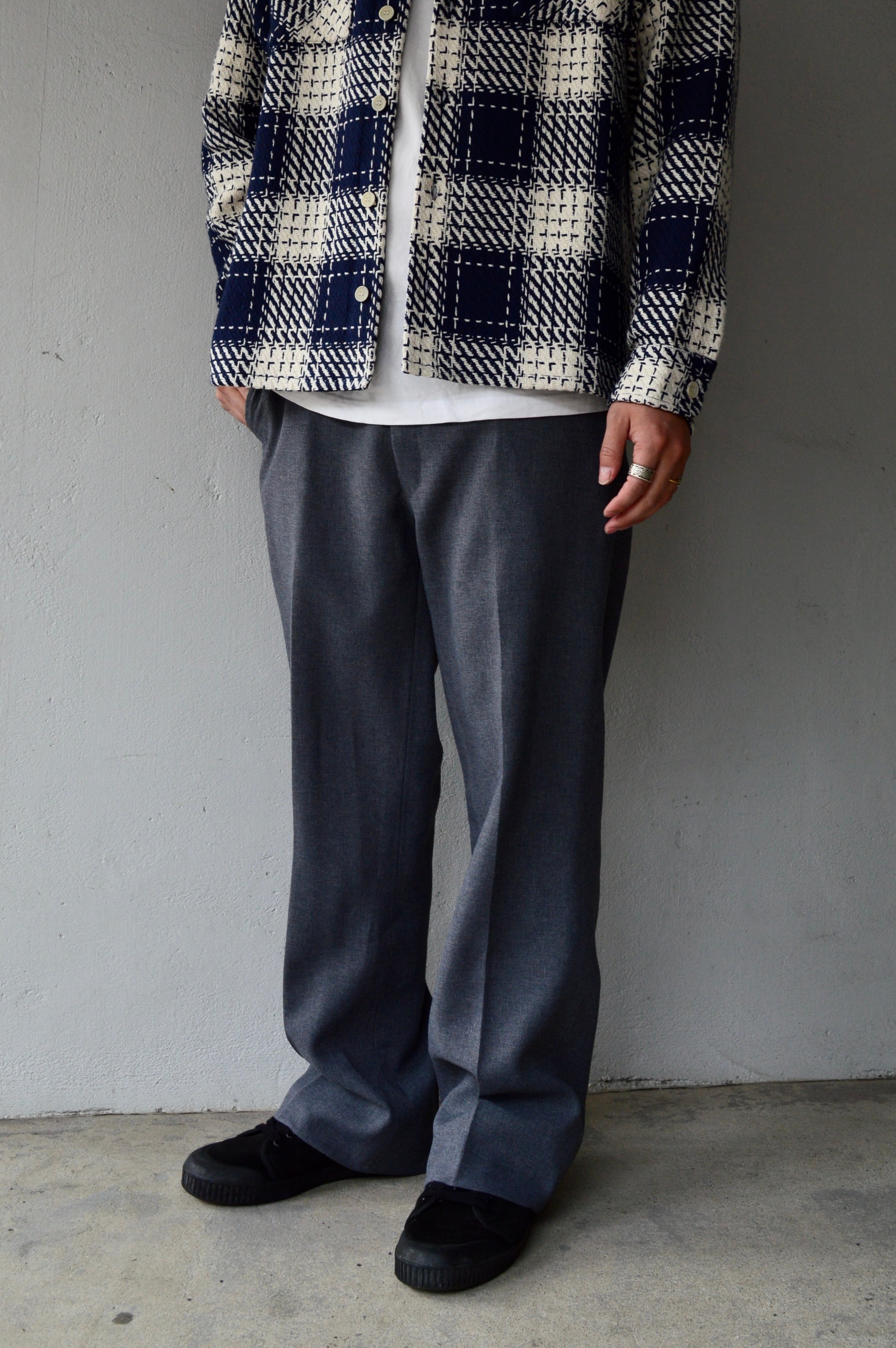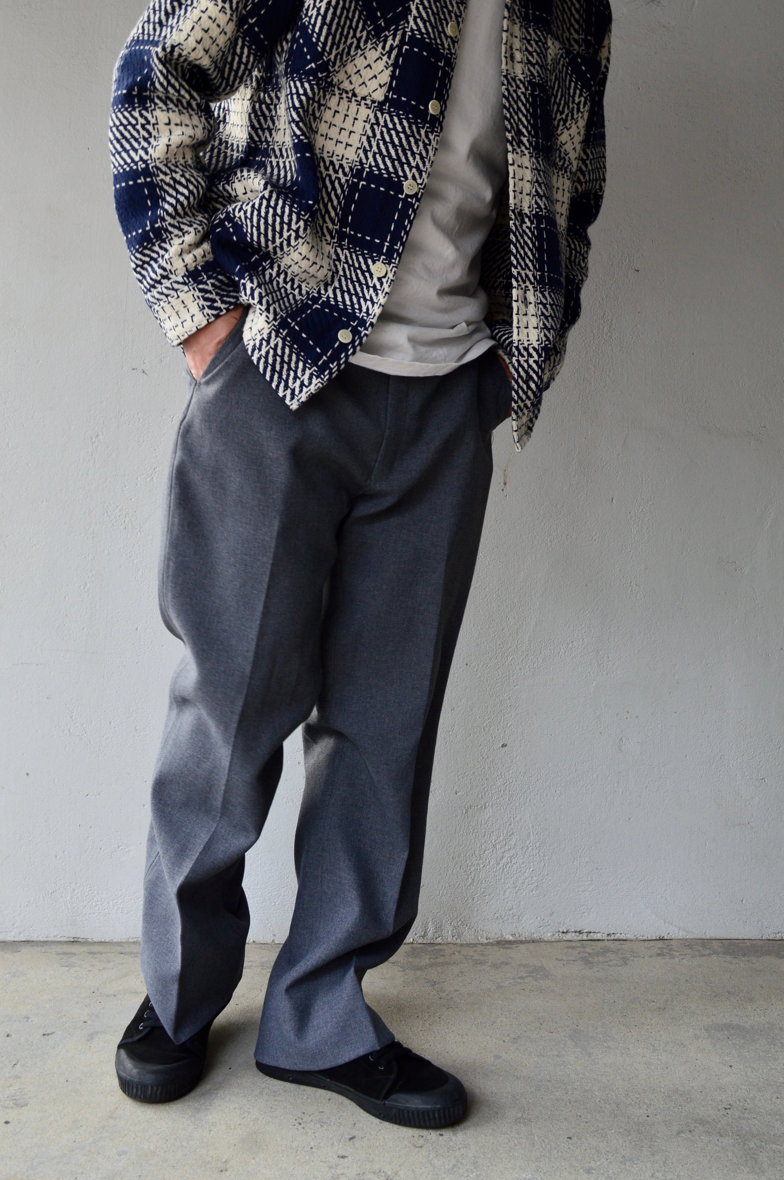 滑らかなポリスラックスになり、クラシックなセミフレア型の太めシルエット。
