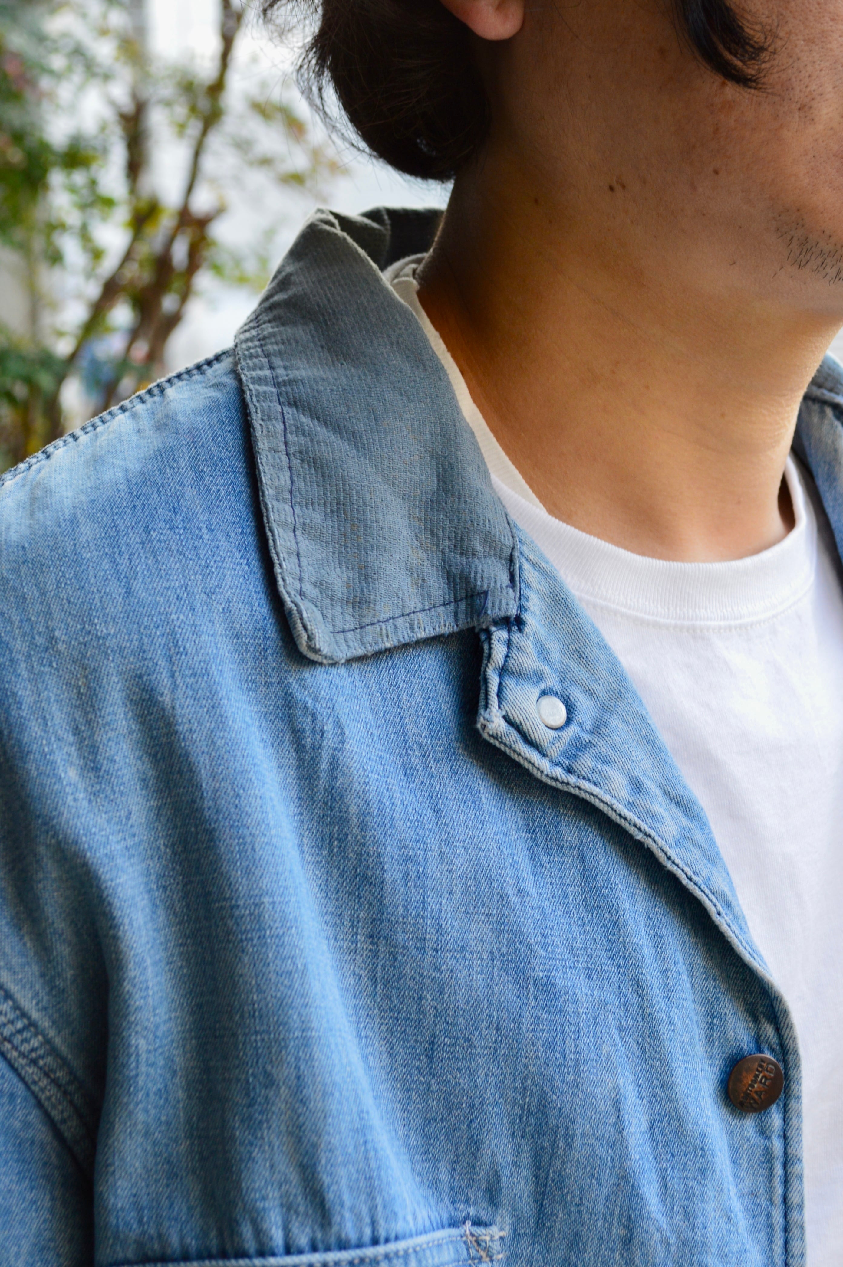 ヴィンテージのモンゴメリーワードでは定番モデルの一つ。ダメージとフェードが強く現れた襟コーデュロイデニムカバーオール。
