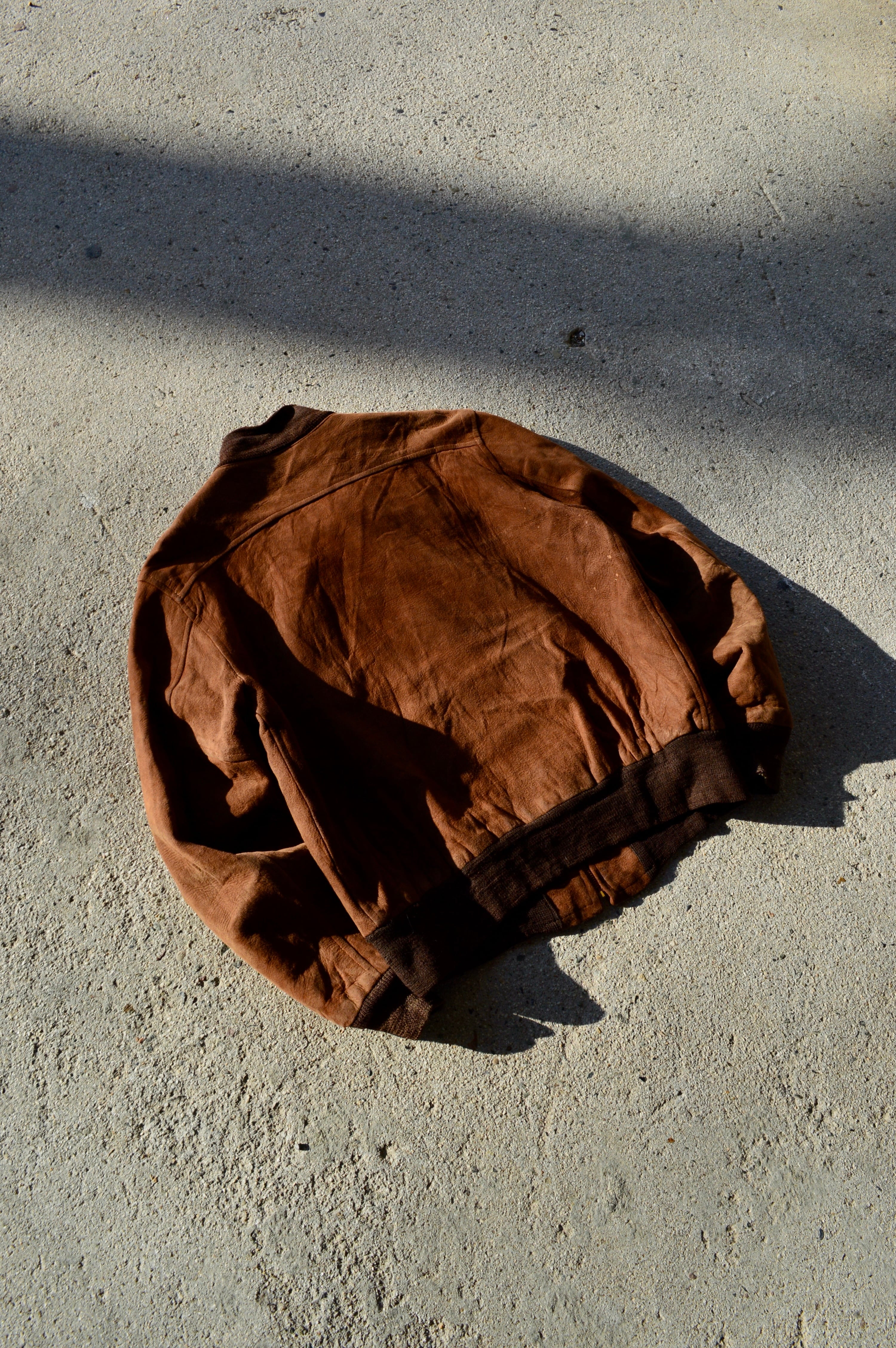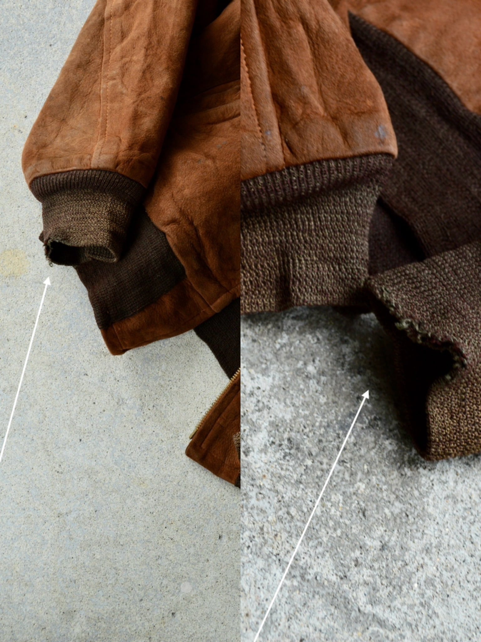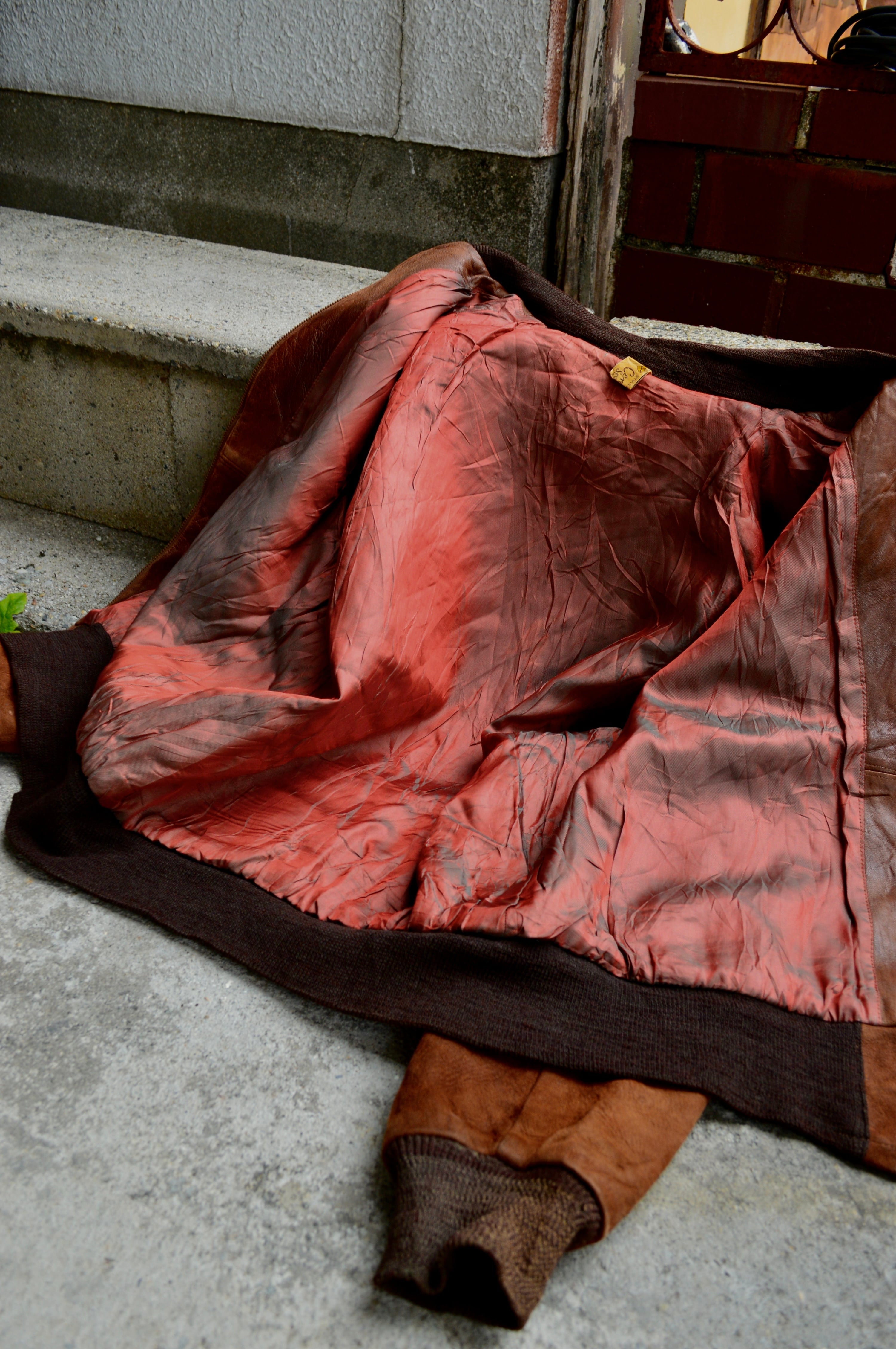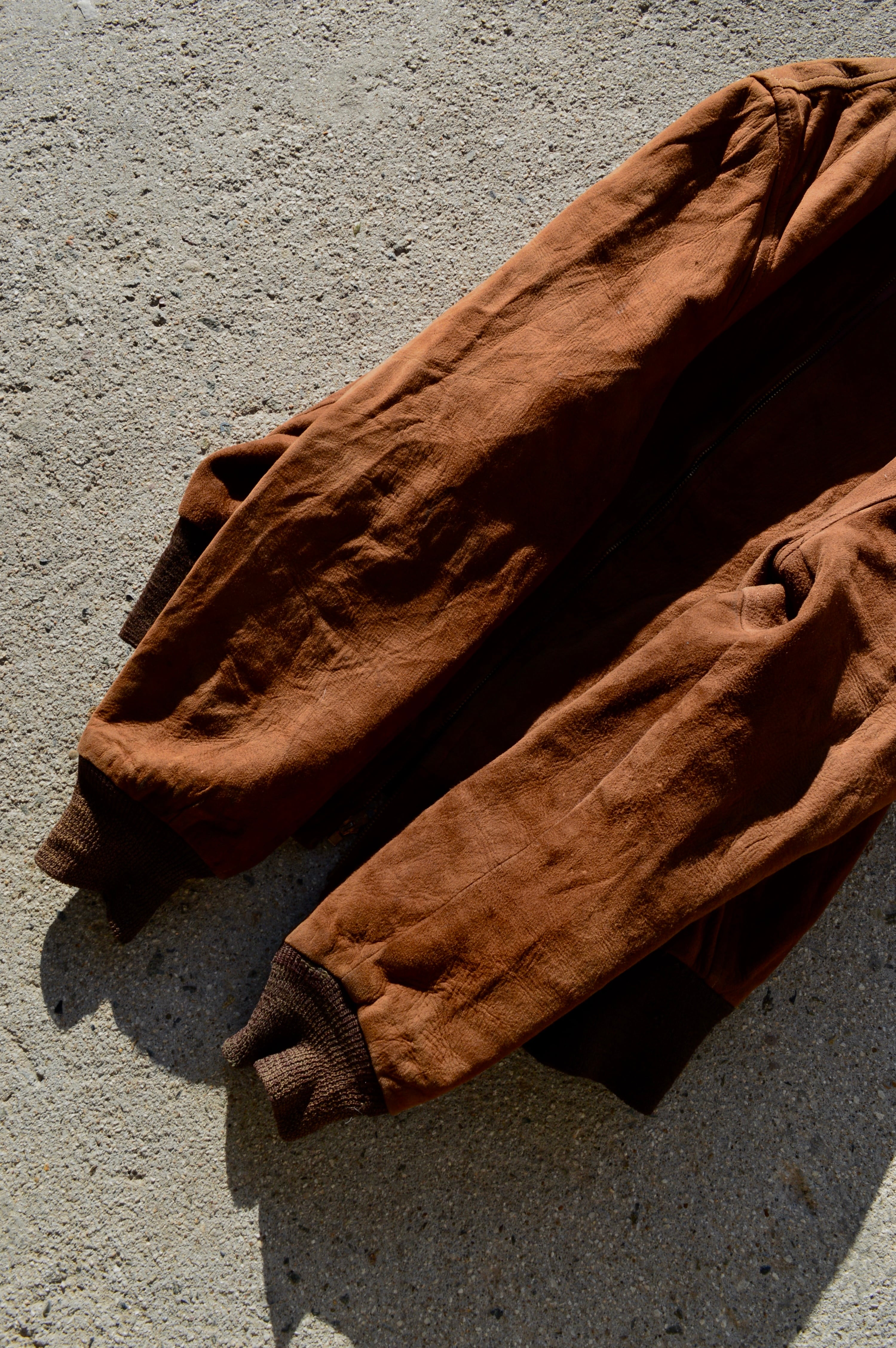 革の質感が際立ったシンプルなMA-1スウェードレザー。袖先、裾先リブはビンテージ特有の同色ウールリブとなります。