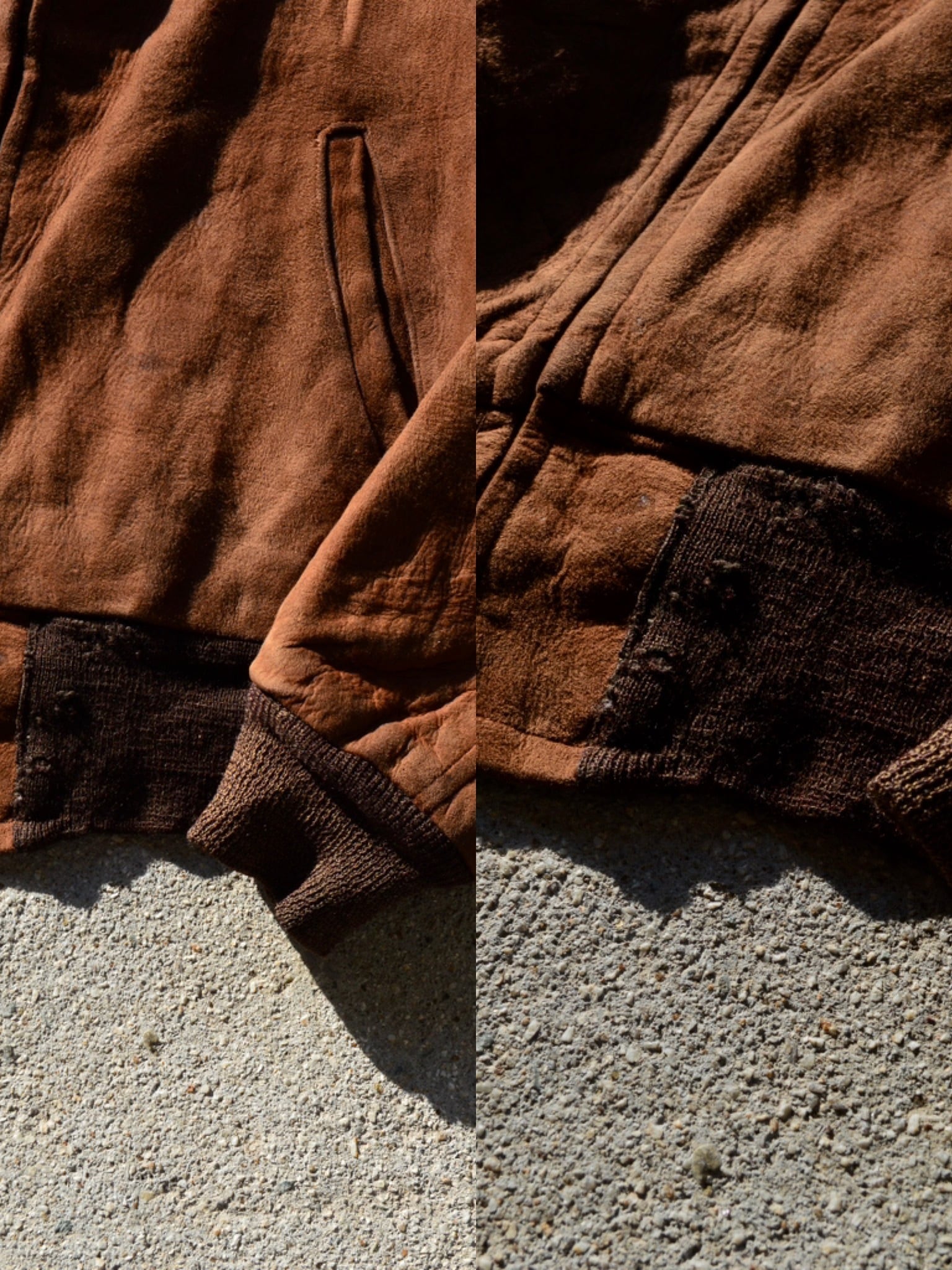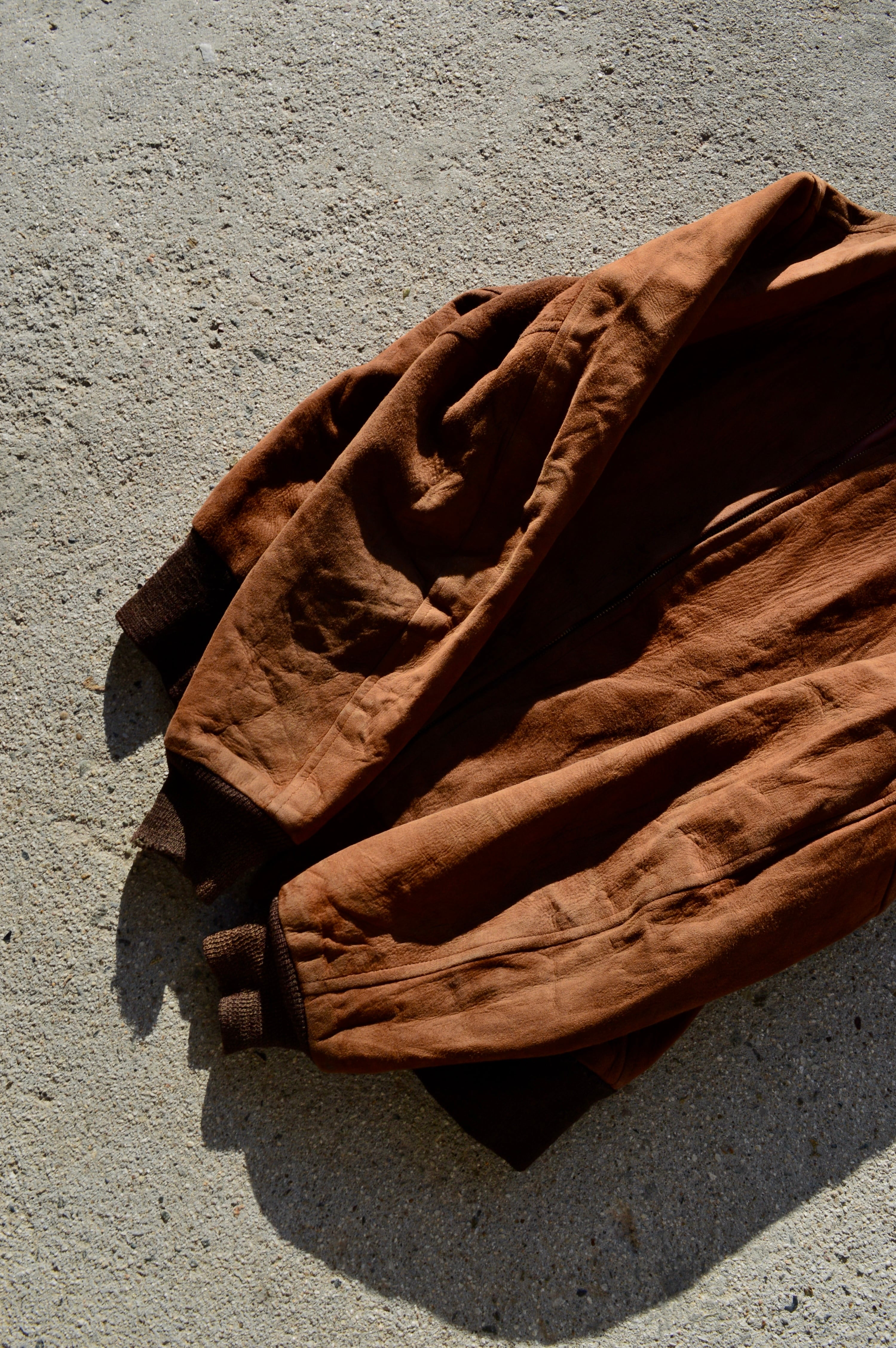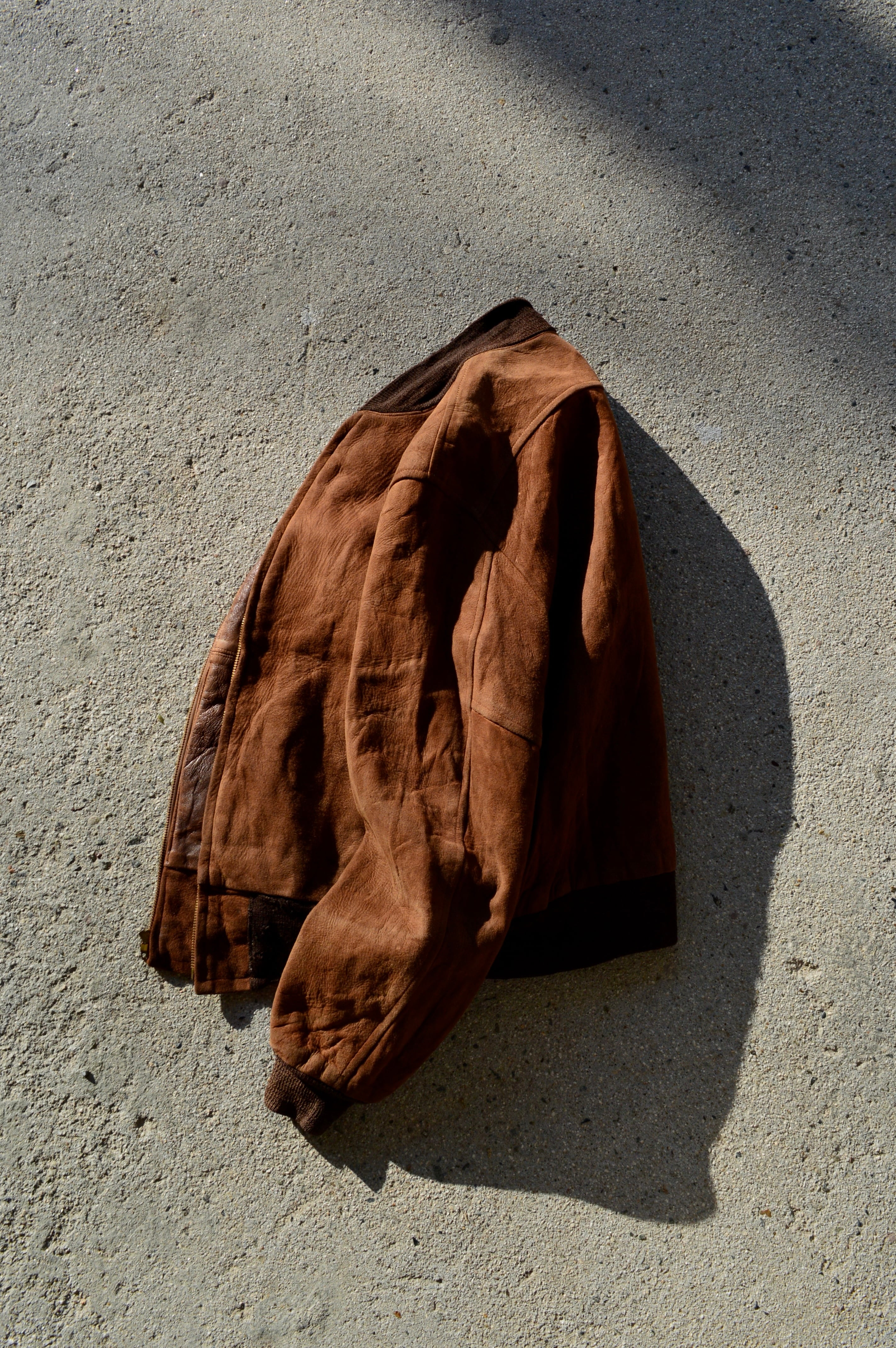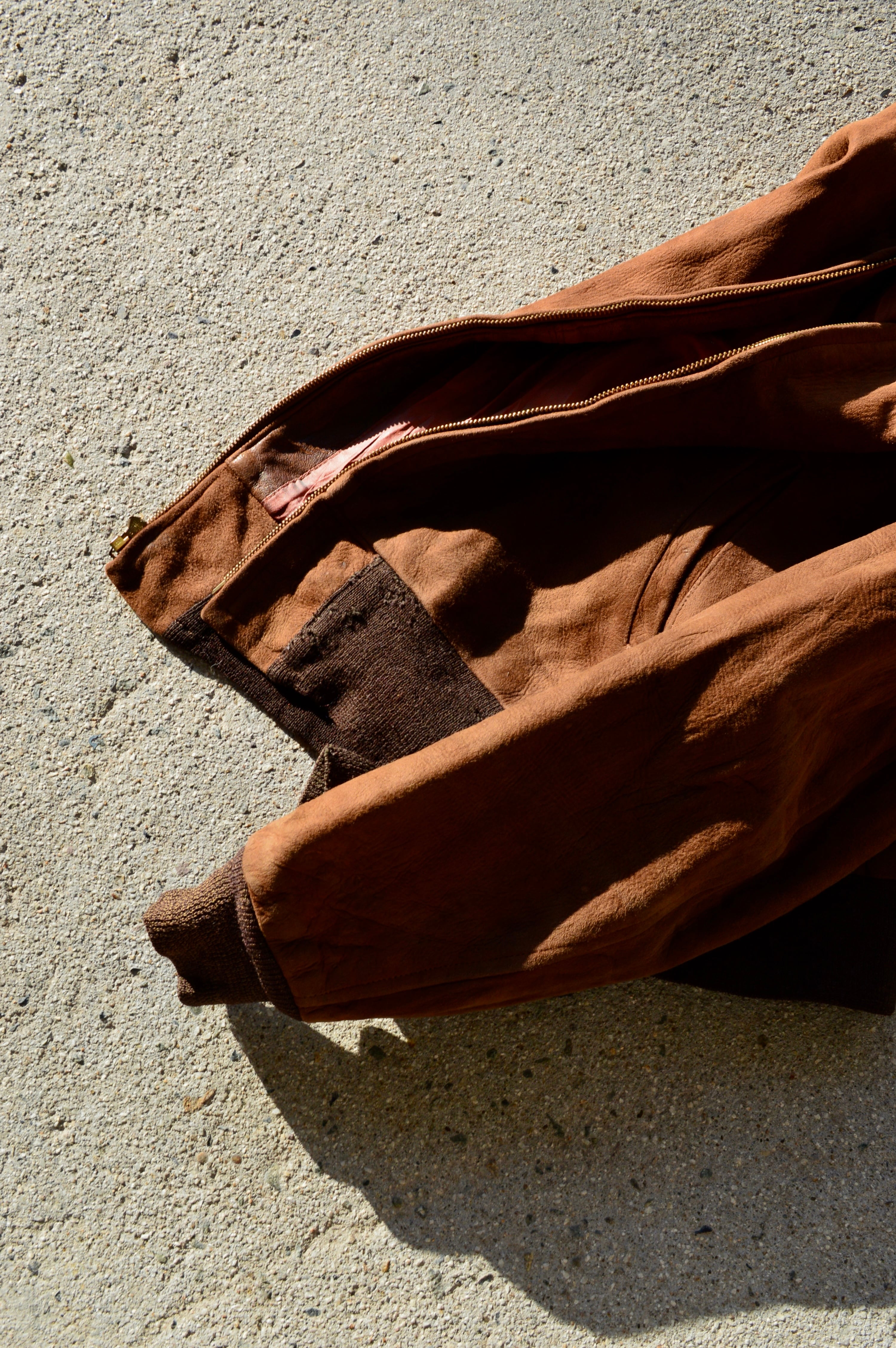 革の質感が際立ったシンプルなMA-1スウェードレザー。袖先、裾先リブはビンテージ特有の同色ウールリブとなります。
