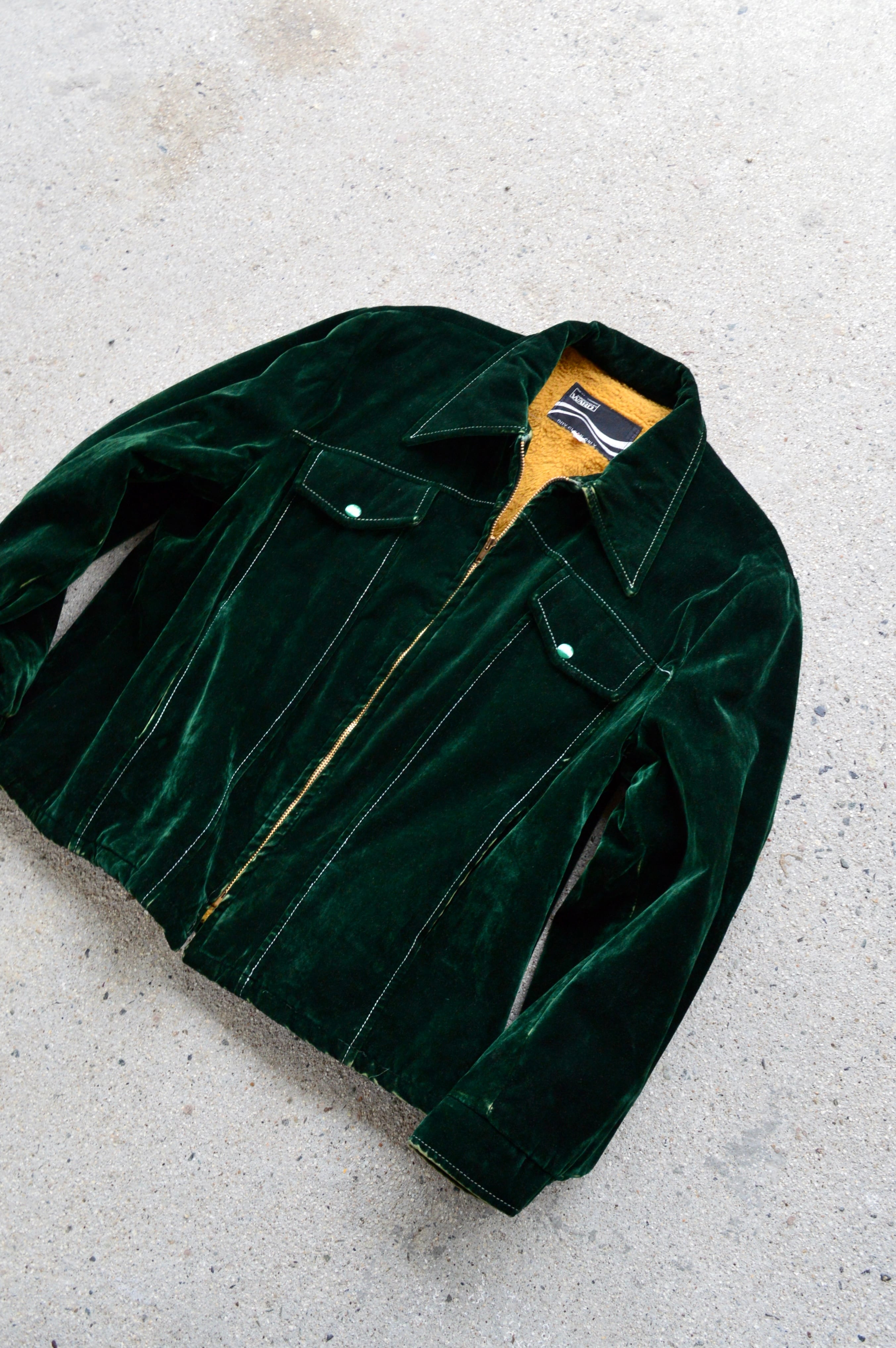 60sから70s特有のデカ襟に同色スナップ、フロントにはステッチに沿ったシームポケットが装備され、細かい部分でスタイリッシュな仕様。