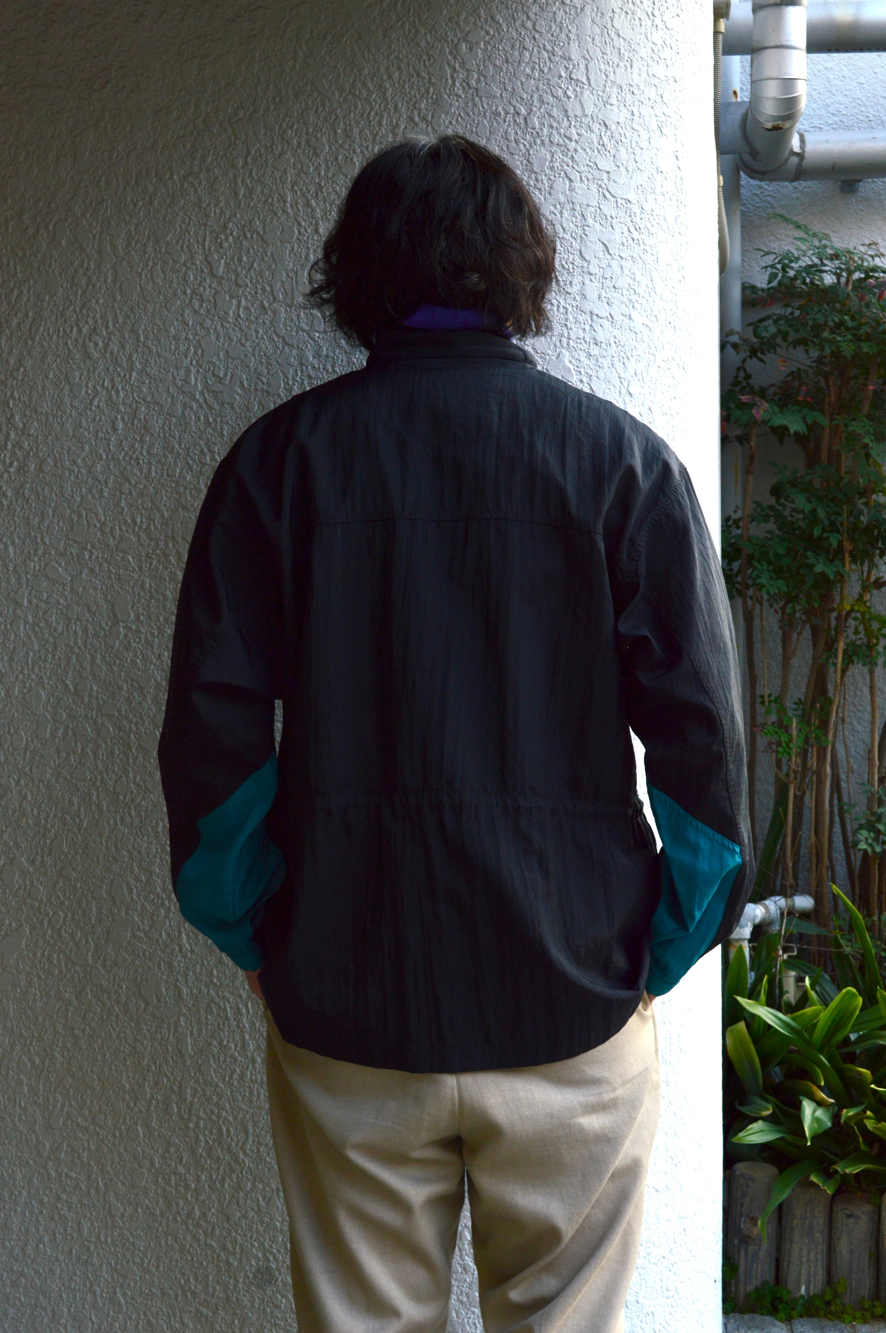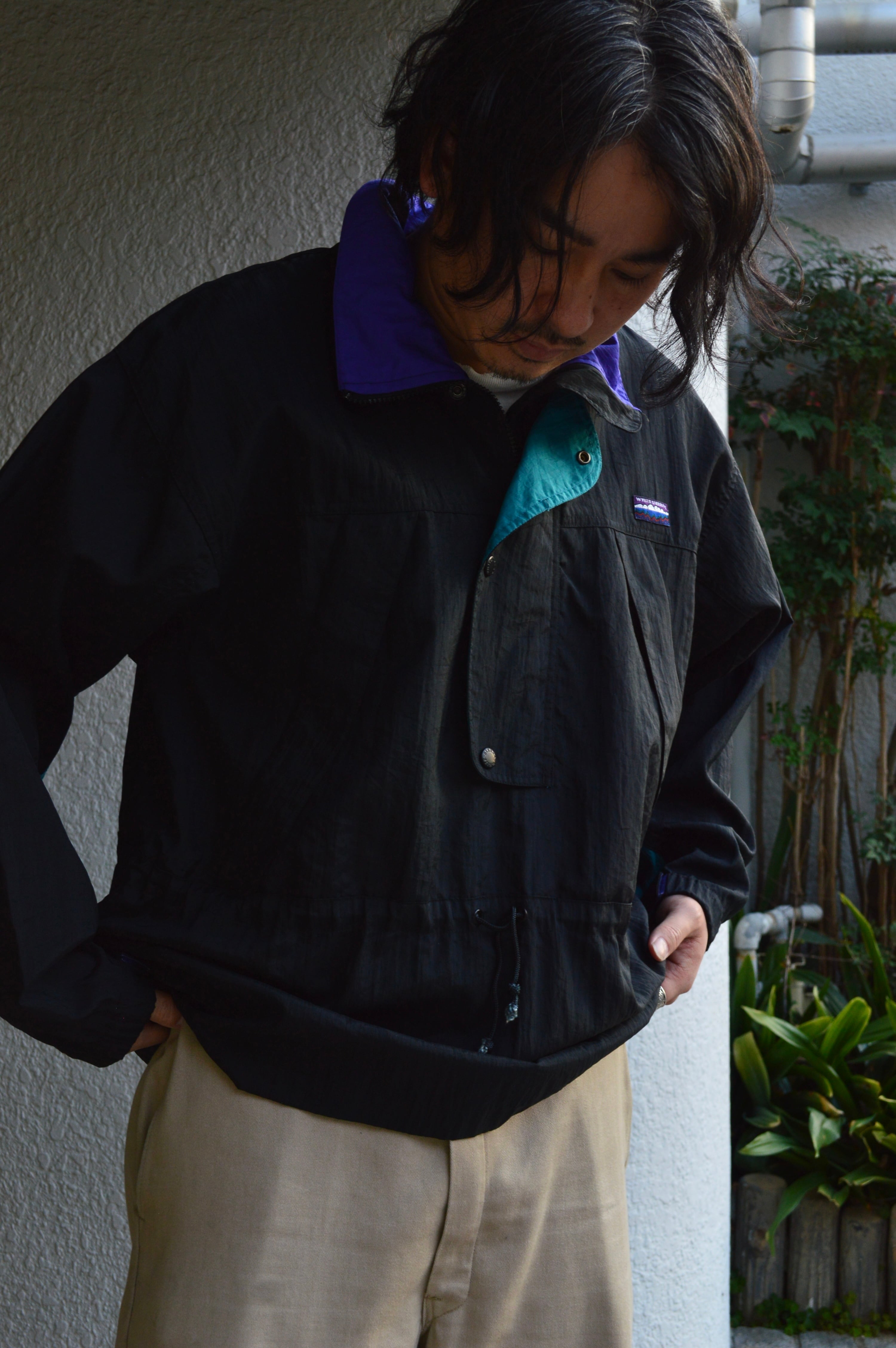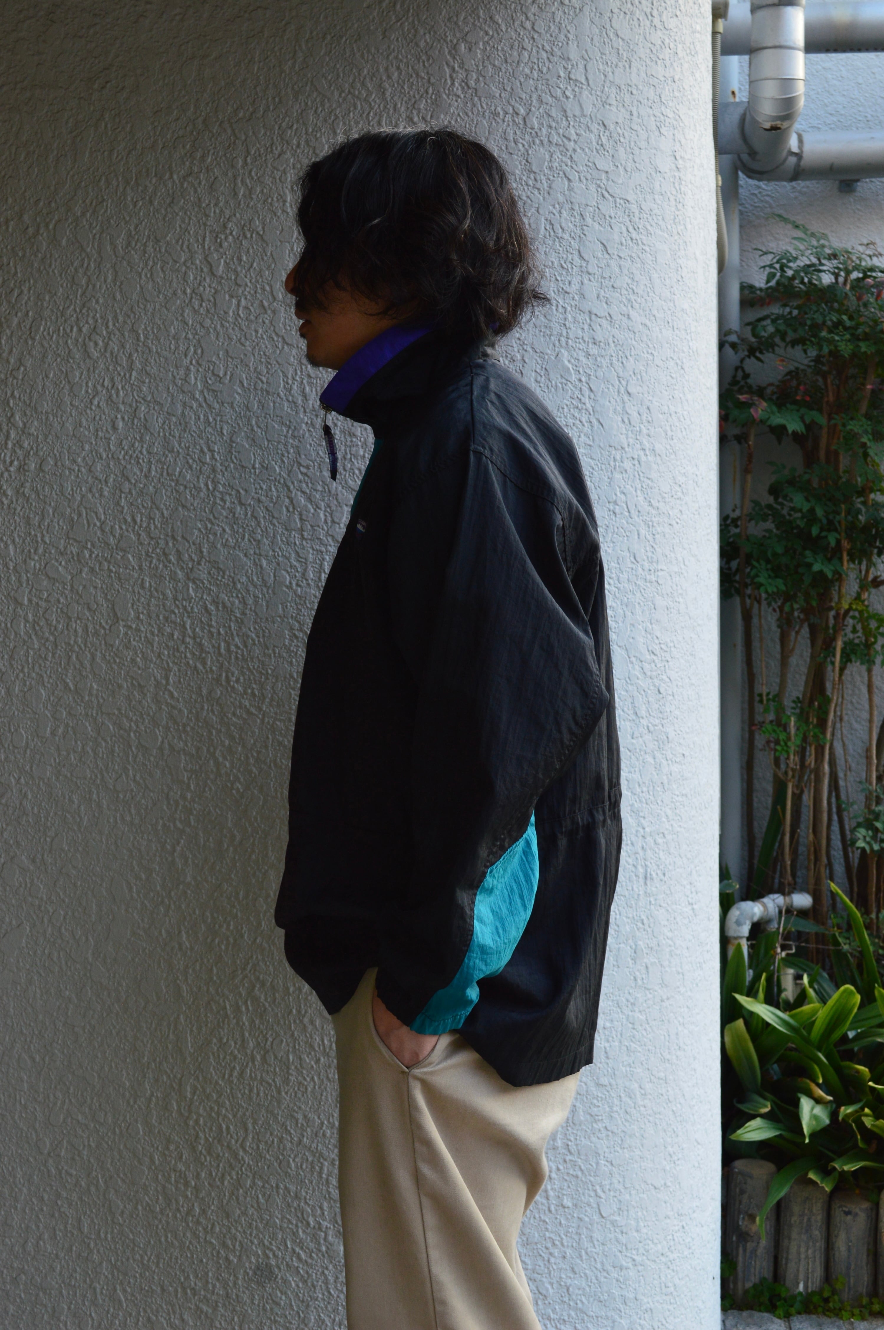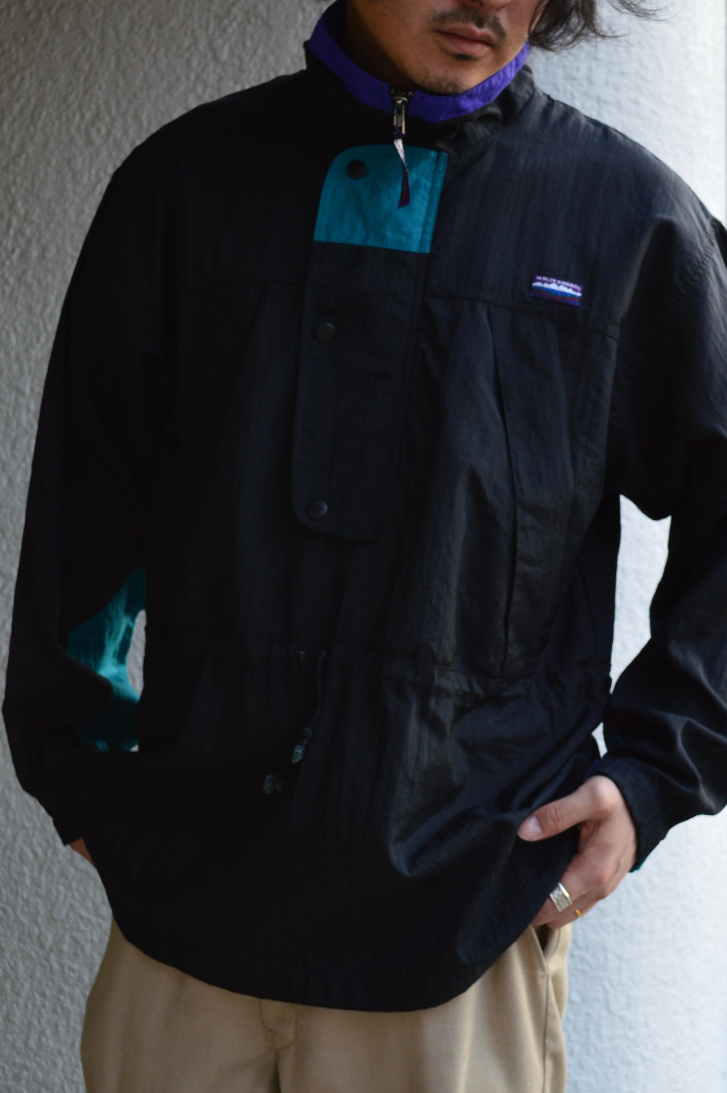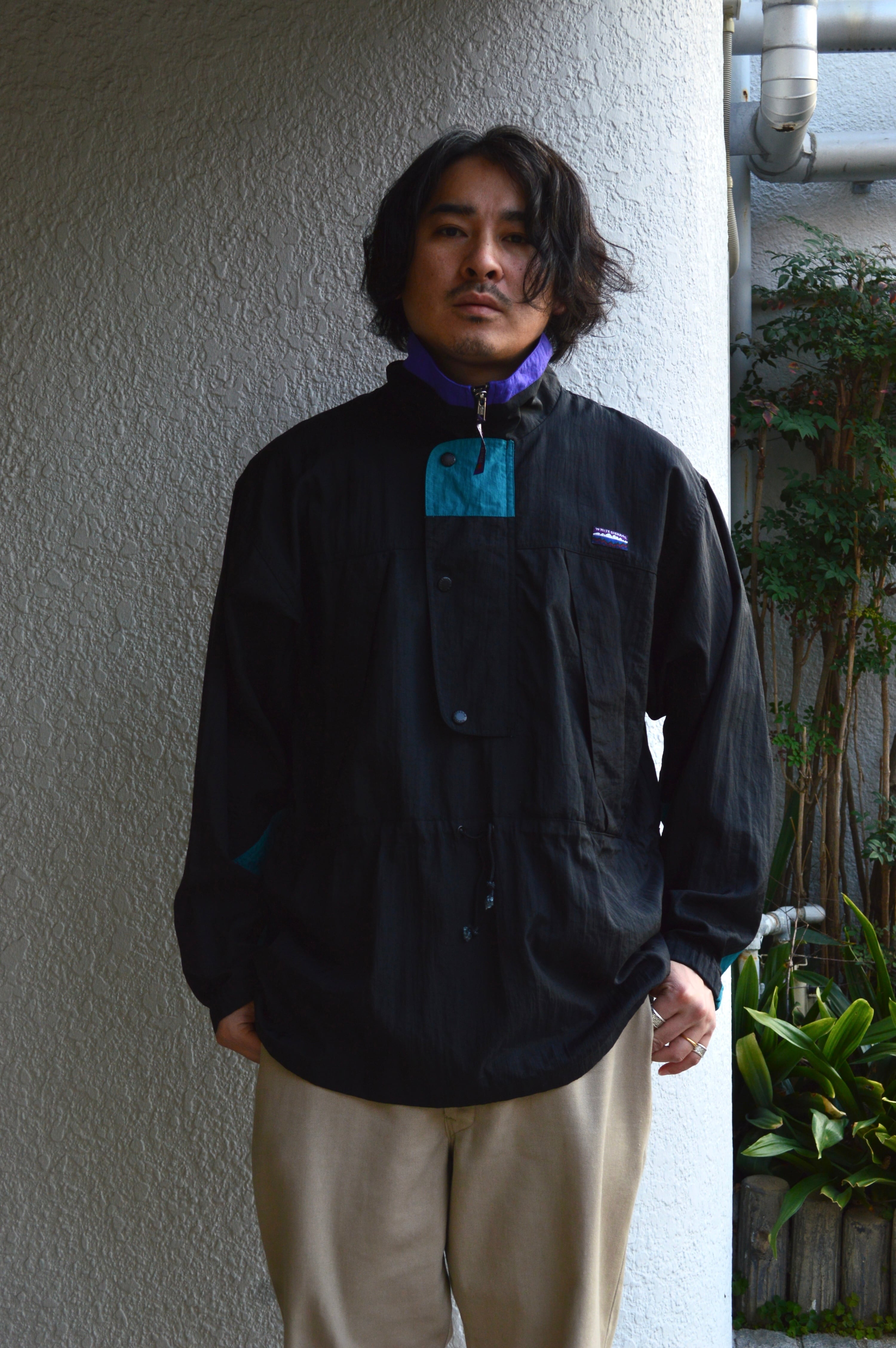 ハイネックカラーのハーフジップに大きめのフロントポケット、腰回りには冷気を遮断するウエストドローコードが装備され、アウトドアユースにも適した仕様が特徴。袖先はリブ&ベルクロで抜かり無い機能面を持ち合わせ、アクセントとして、片側側面には簡易カラビナやネック背面部にはジップ式の小さな隠しポケットまで付いており、現在のアウトドアウェアーにも無いような機能面が備わったモデル。