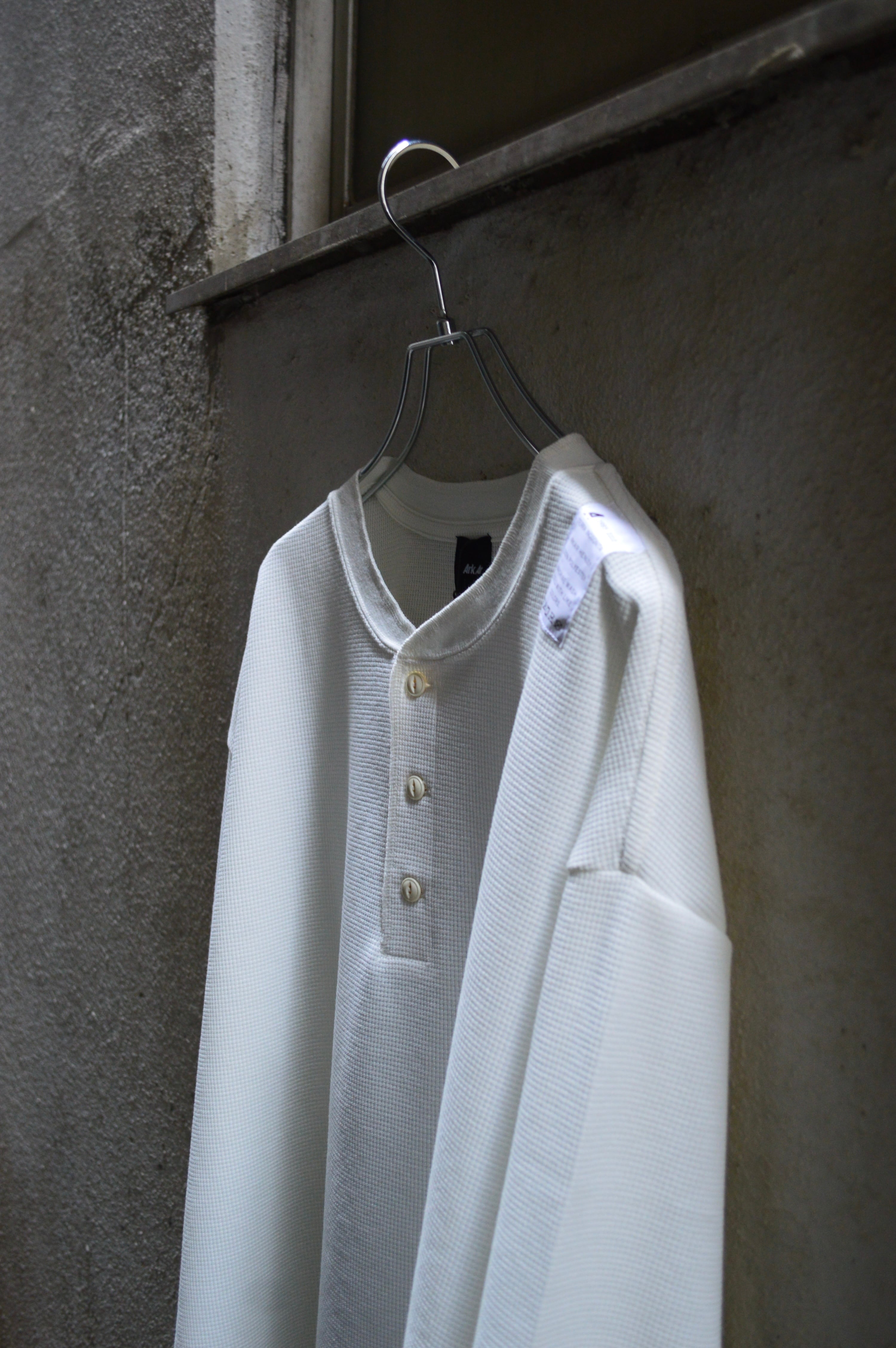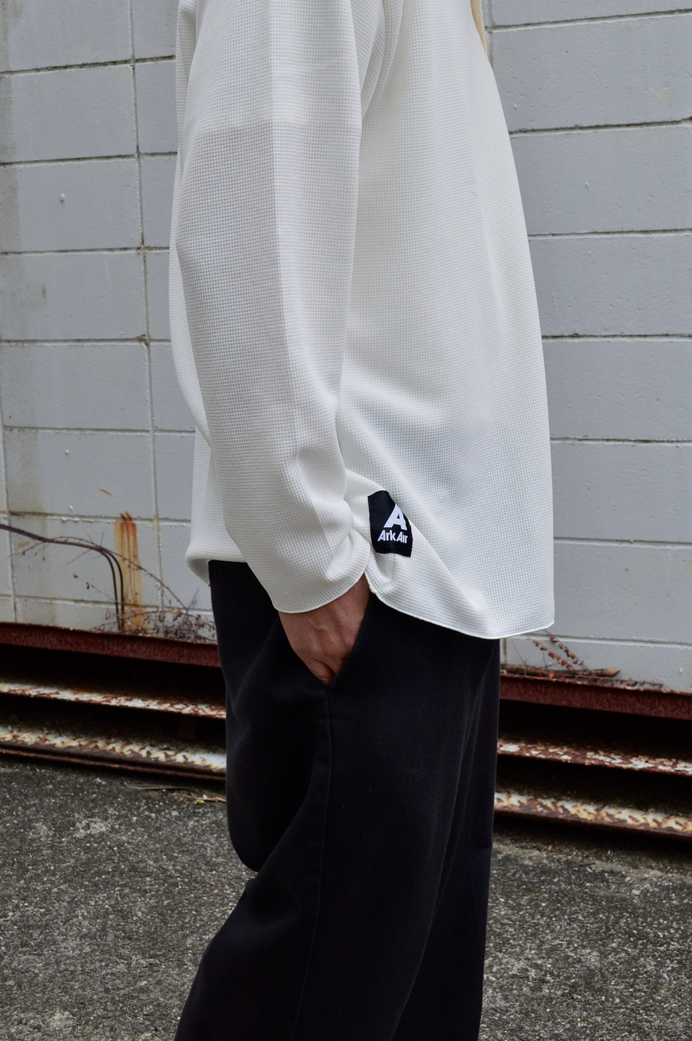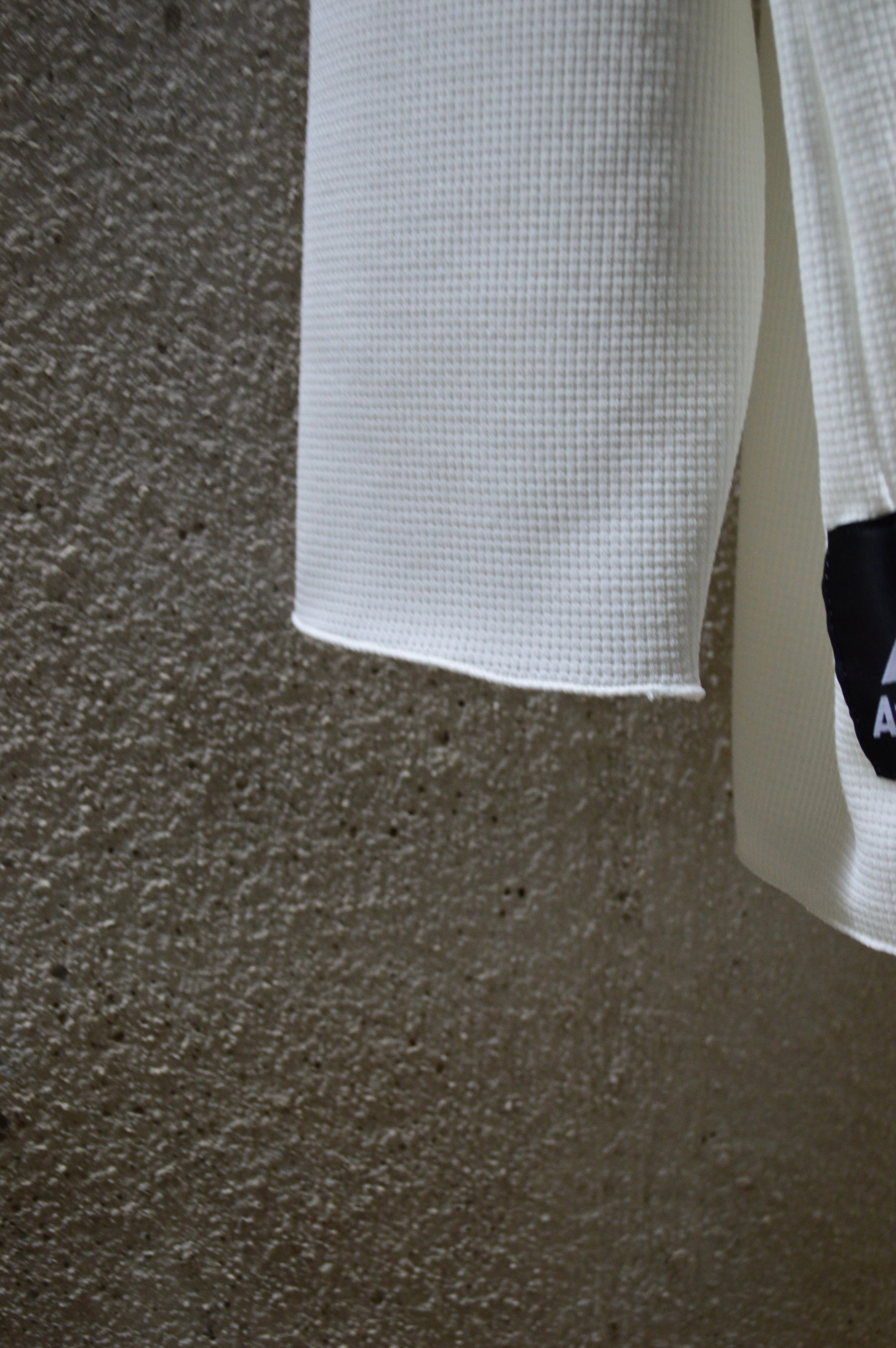 コットンライクなポリエステルワッフル素材でUVカットポリを含みながらもスポーツウェアーの生地質とは一線を引いた素材となり、型崩れに強い軽量なサーマルウェアー。