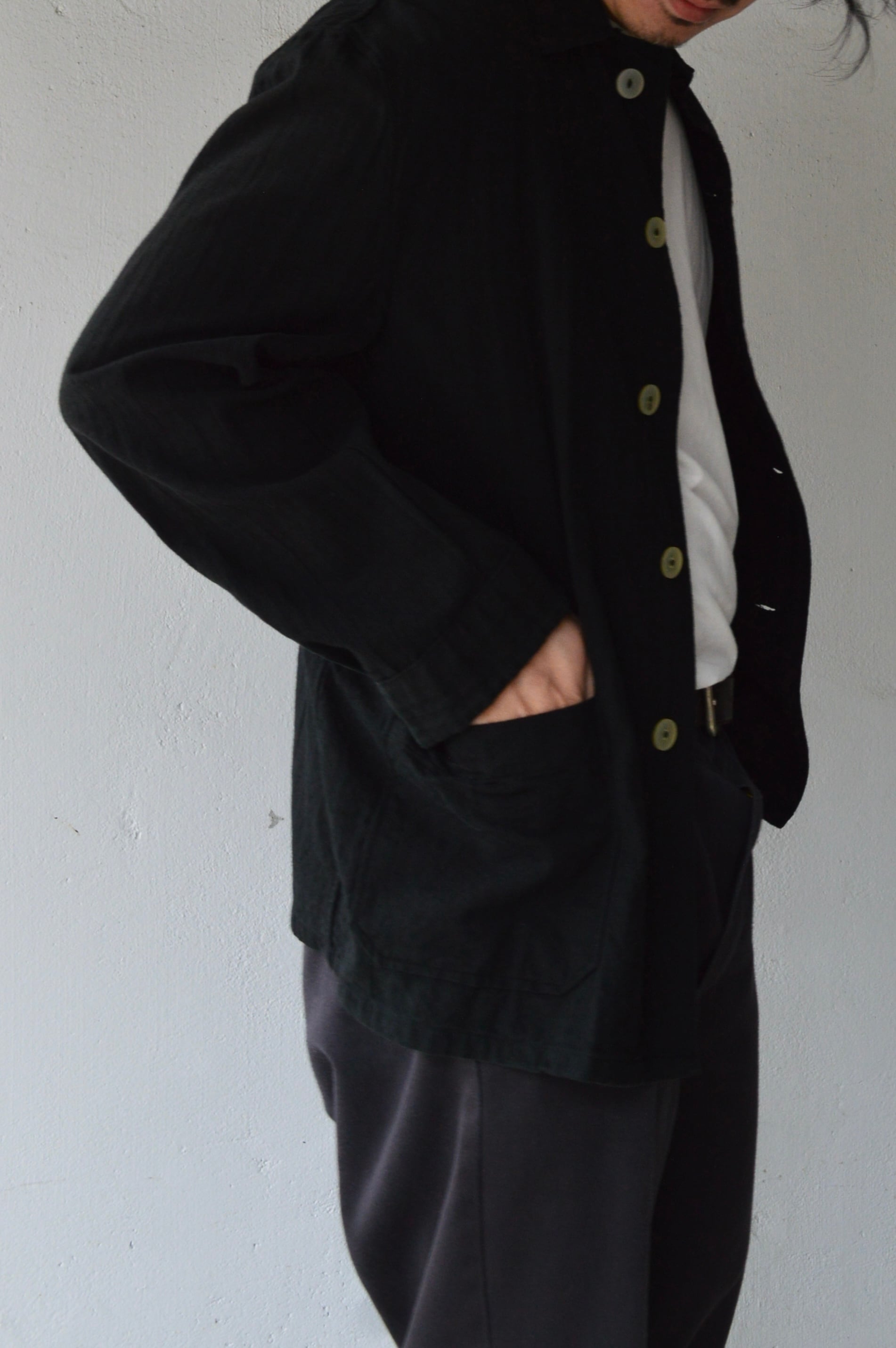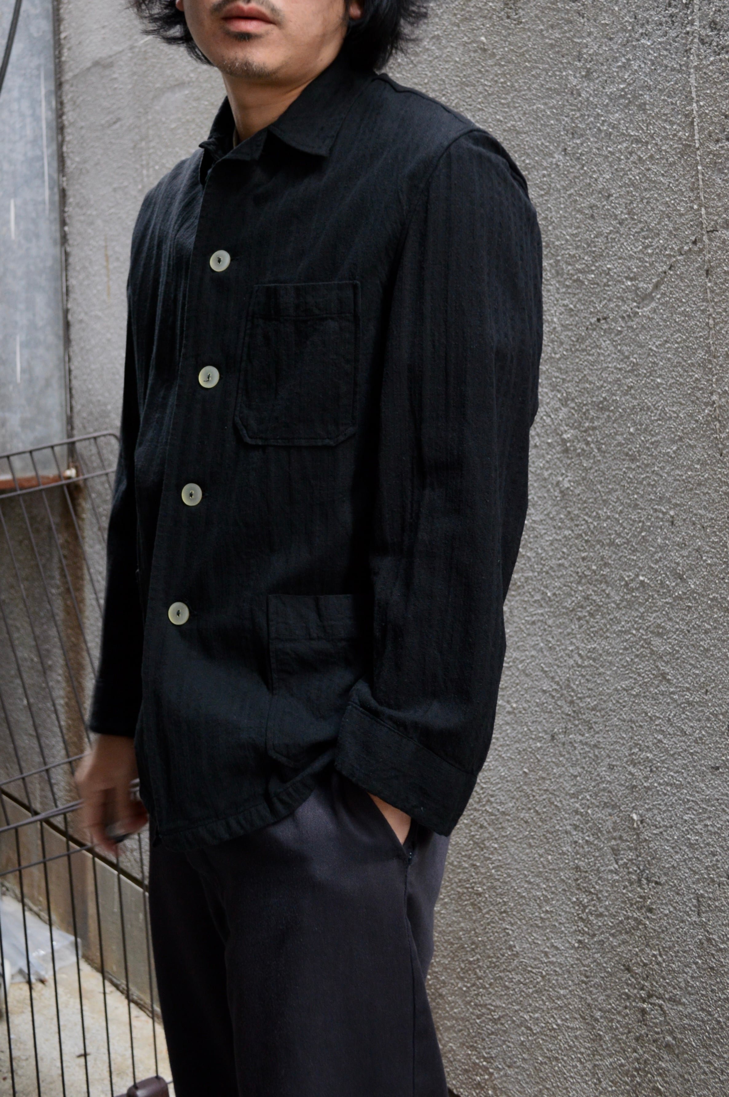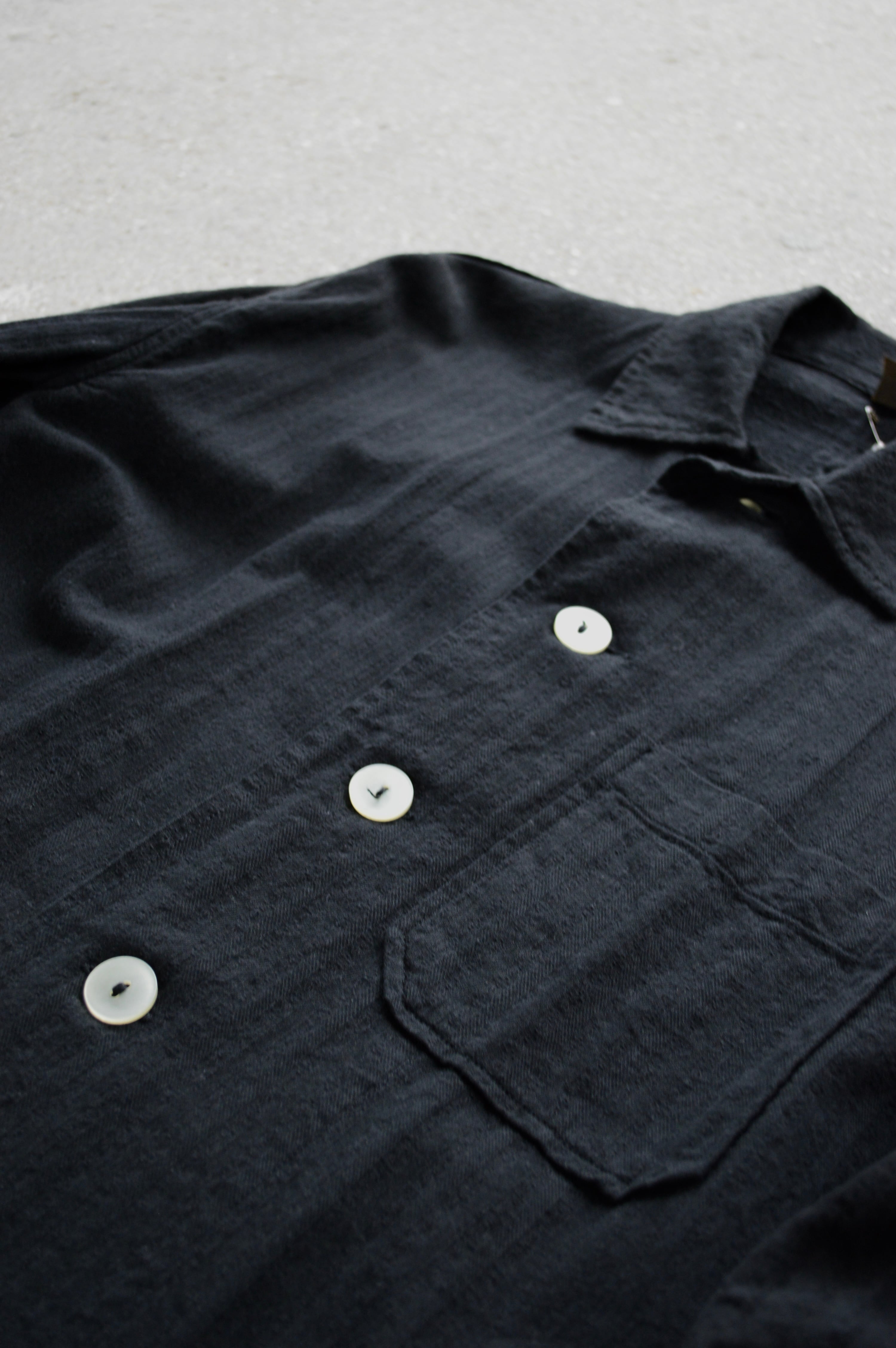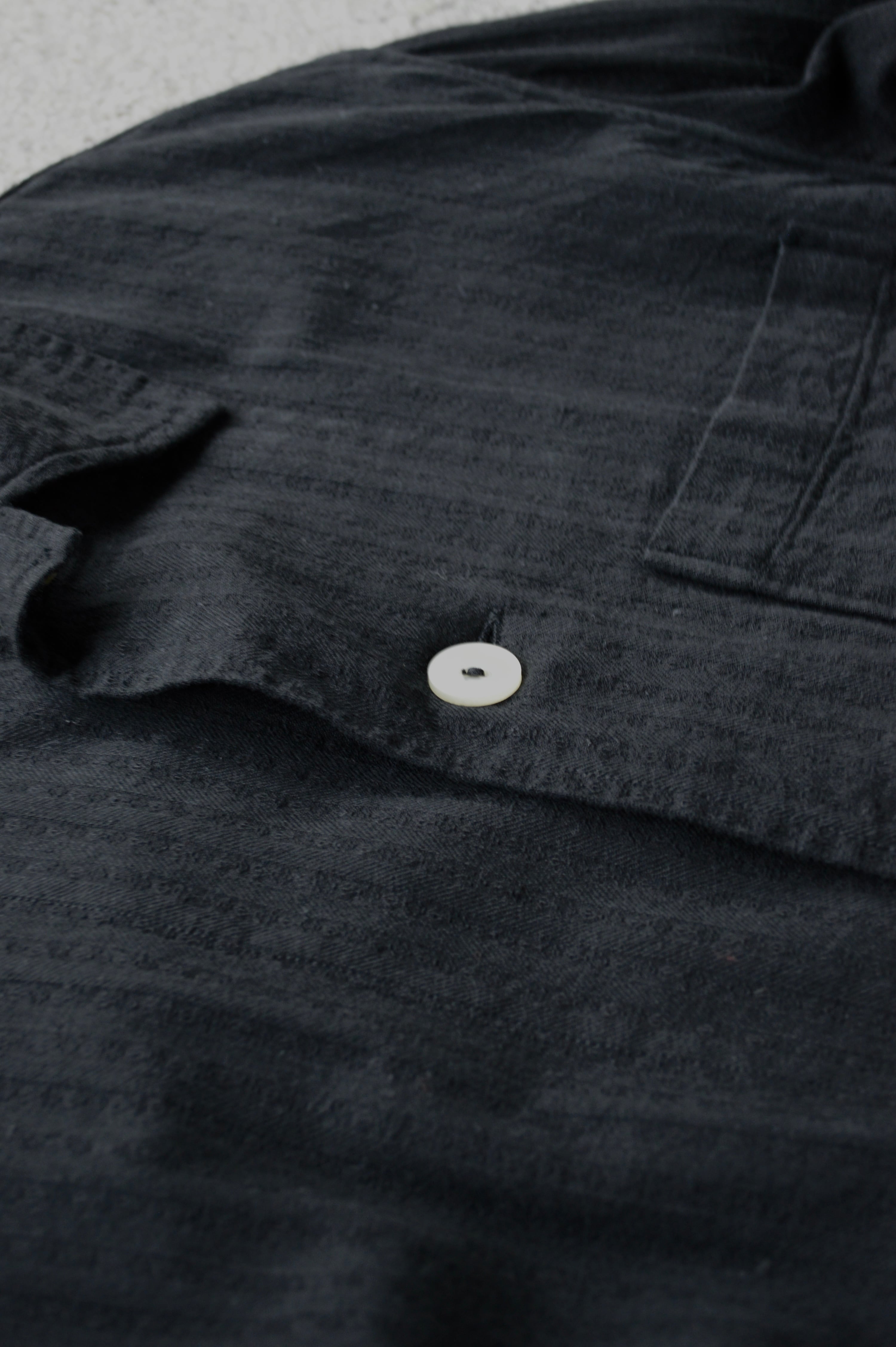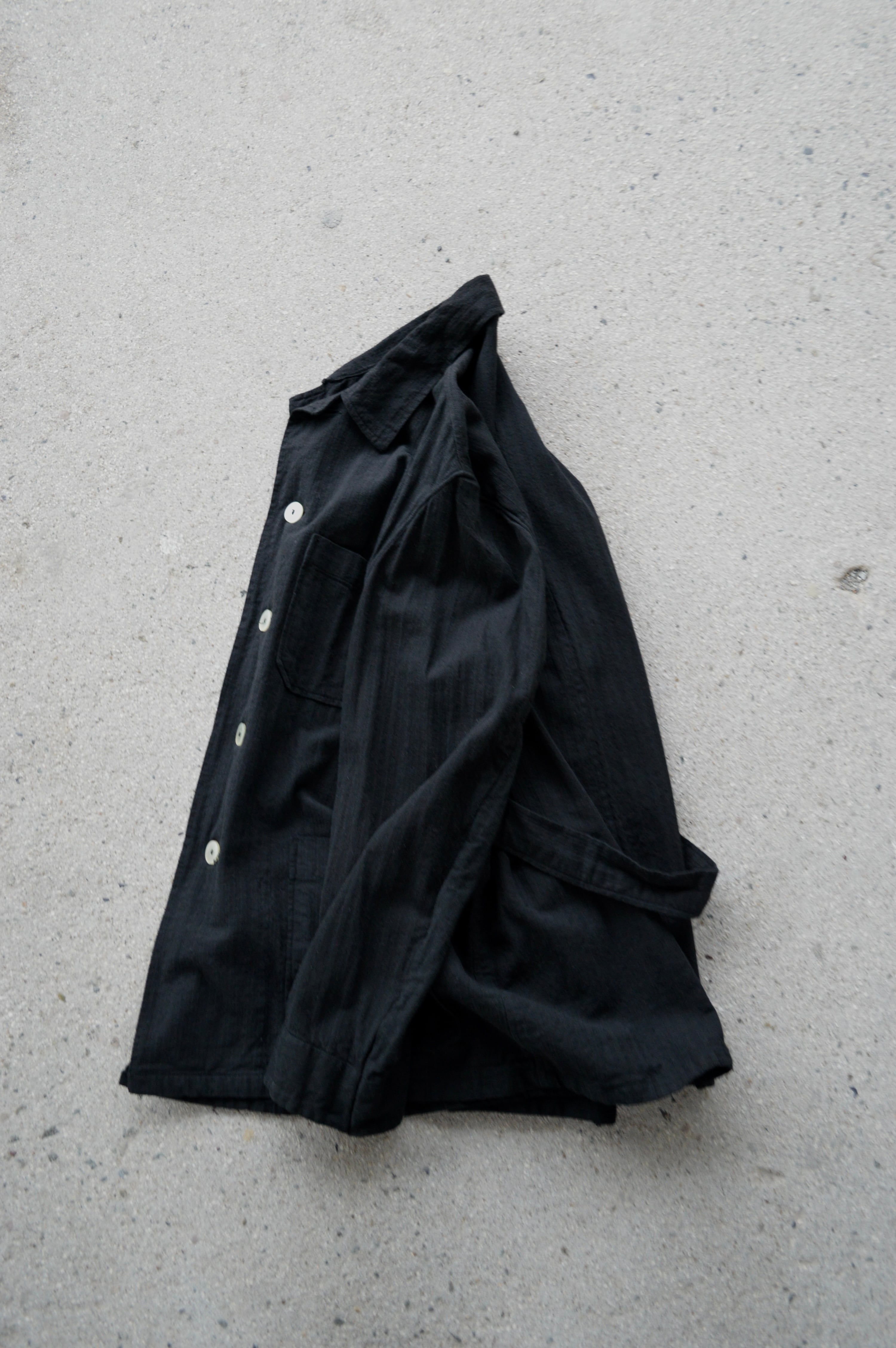 こちらはタフなコットンツイルにサッカー織りが施された素材で黒染めとして仕上げられることにより、自然体な毛羽立ちがが立体化的な表情に仕上がったスリーピングシャツ。前開きの大きめボタンが取り付けられ、軽いシャツジャケットとして活用いただける一着。