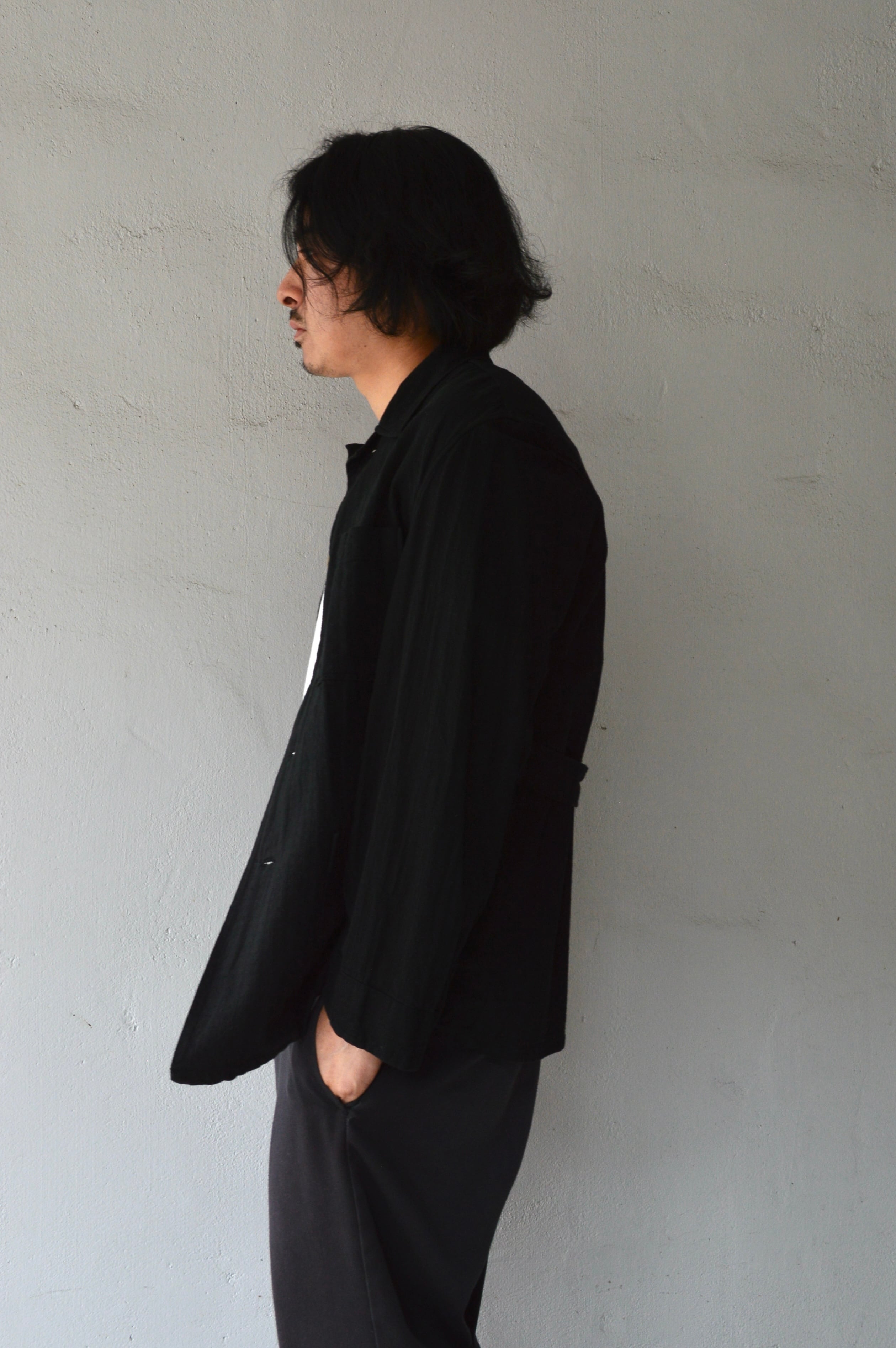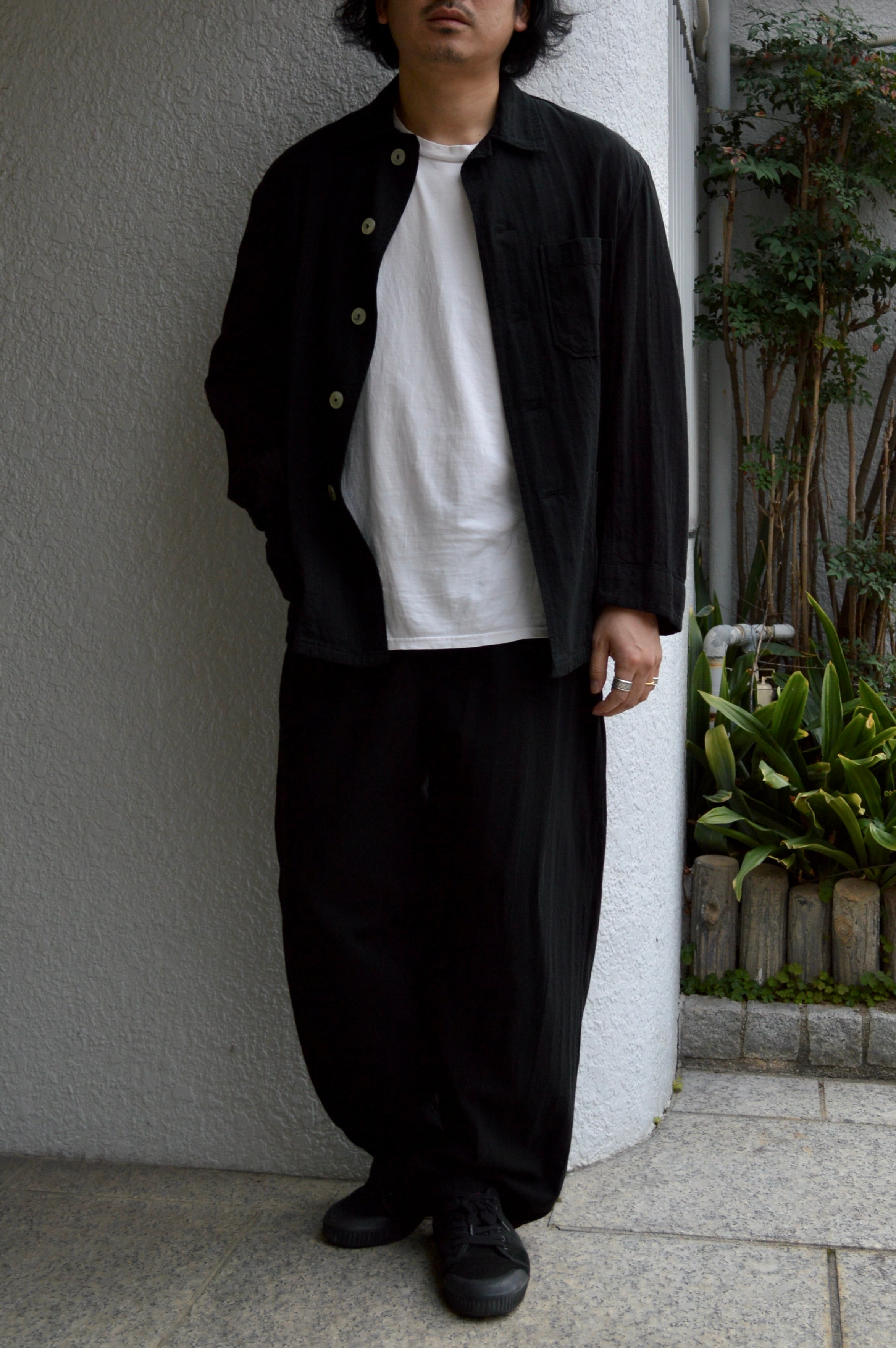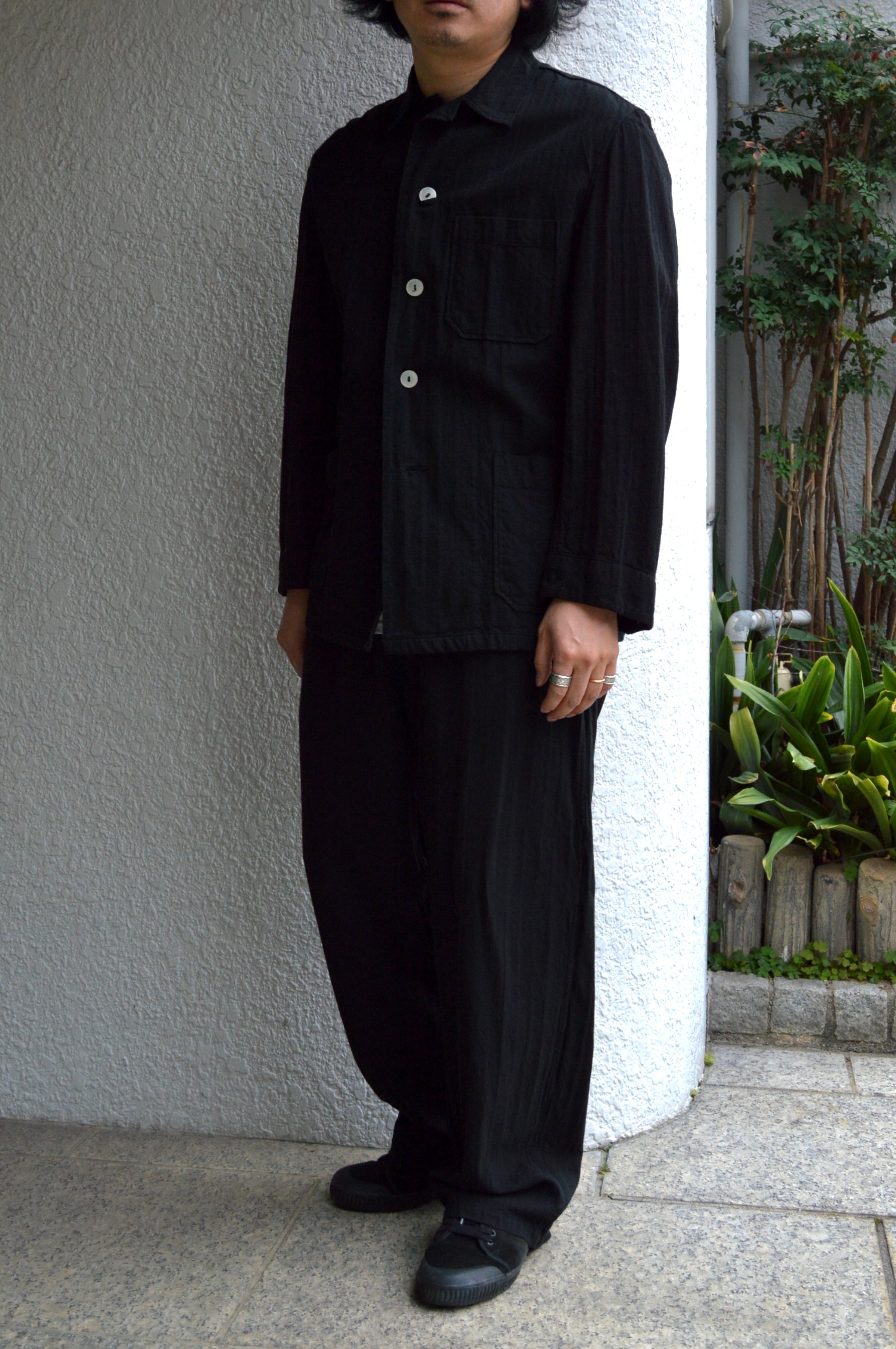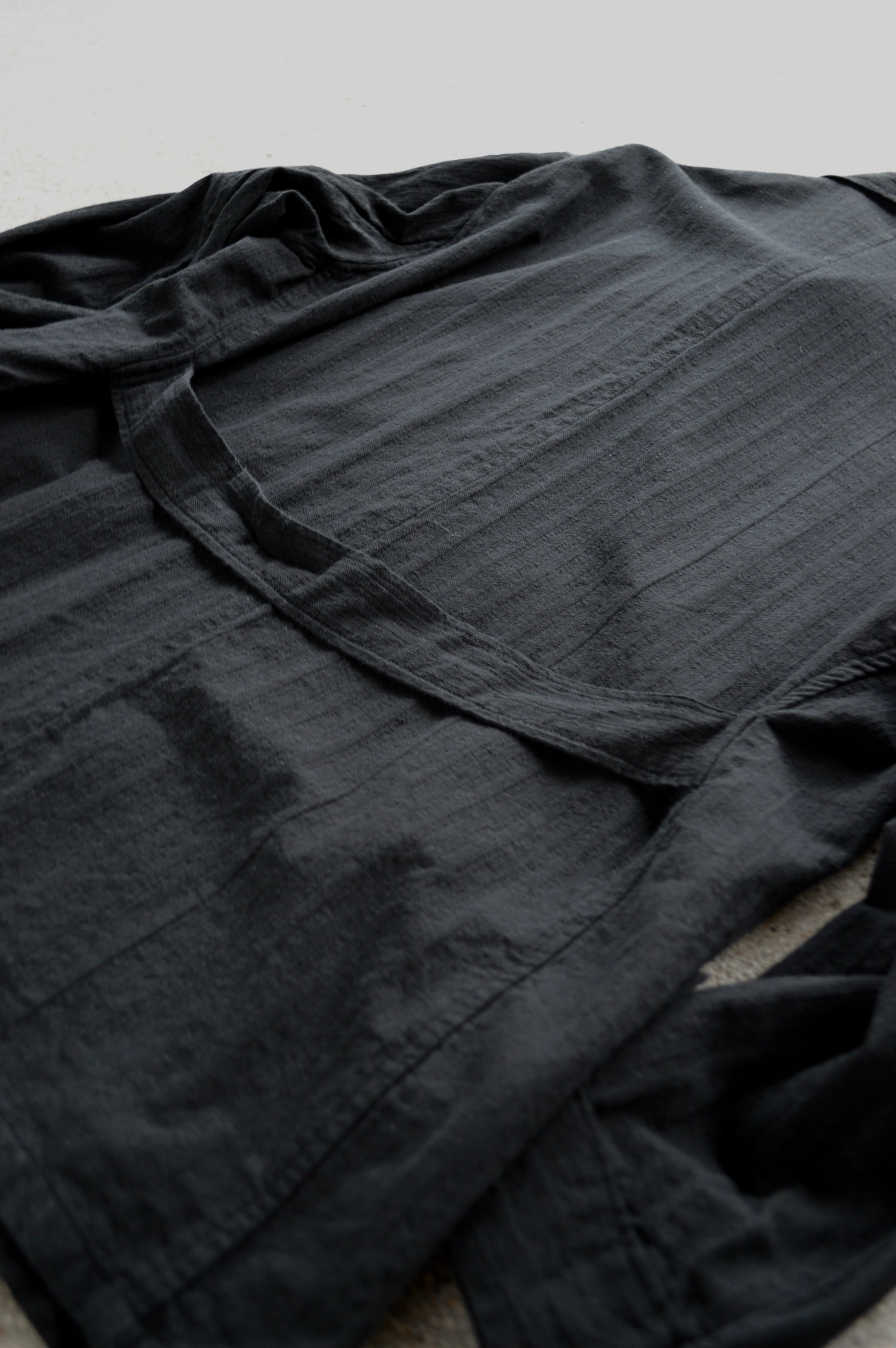 こちらはタフなコットンツイルにサッカー織りが施された素材で黒染めとして仕上げられることにより、自然体な毛羽立ちがが立体化的な表情に仕上がったスリーピングシャツ。前開きの大きめボタンが取り付けられ、軽いシャツジャケットとして活用いただける一着。