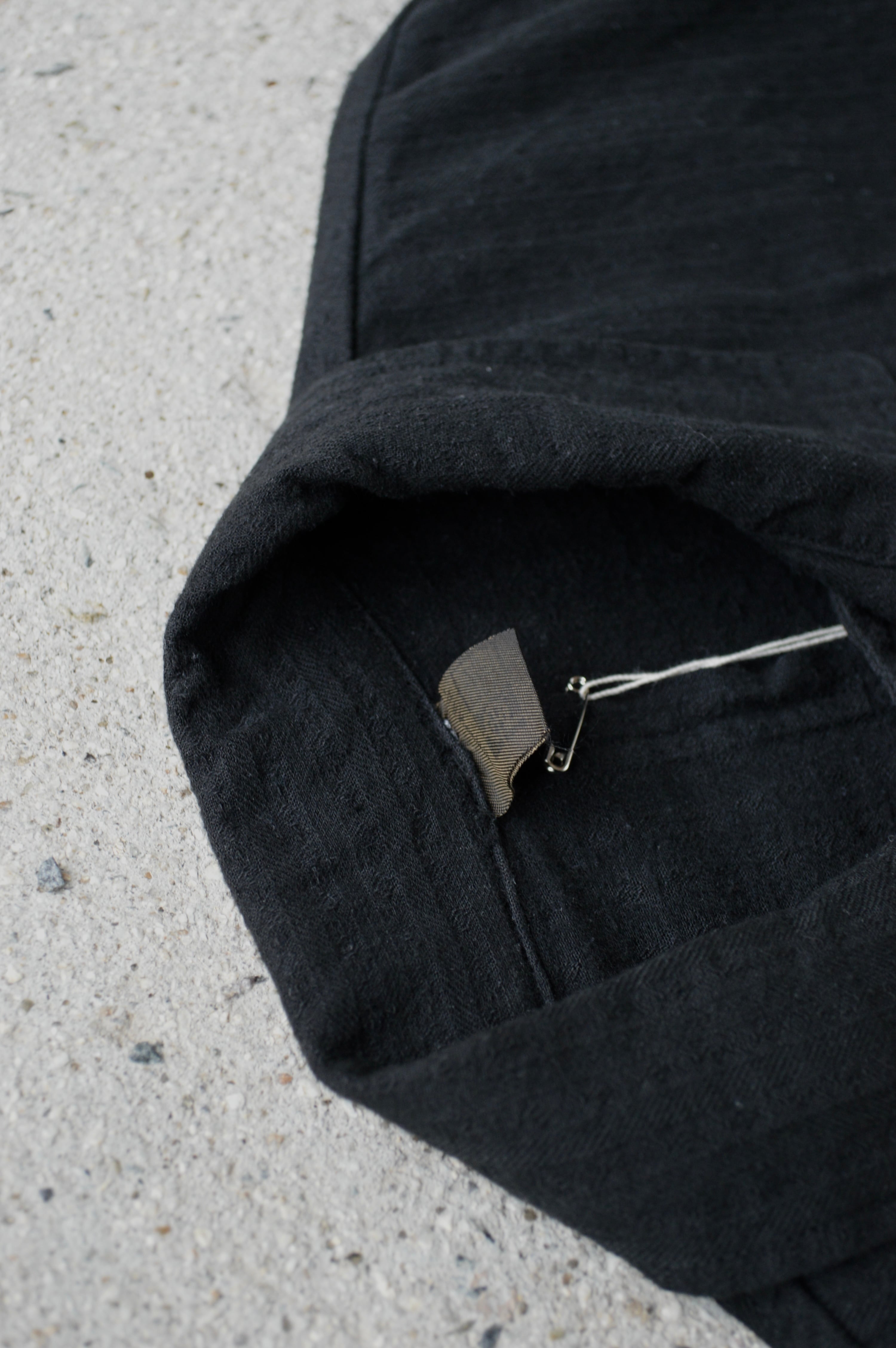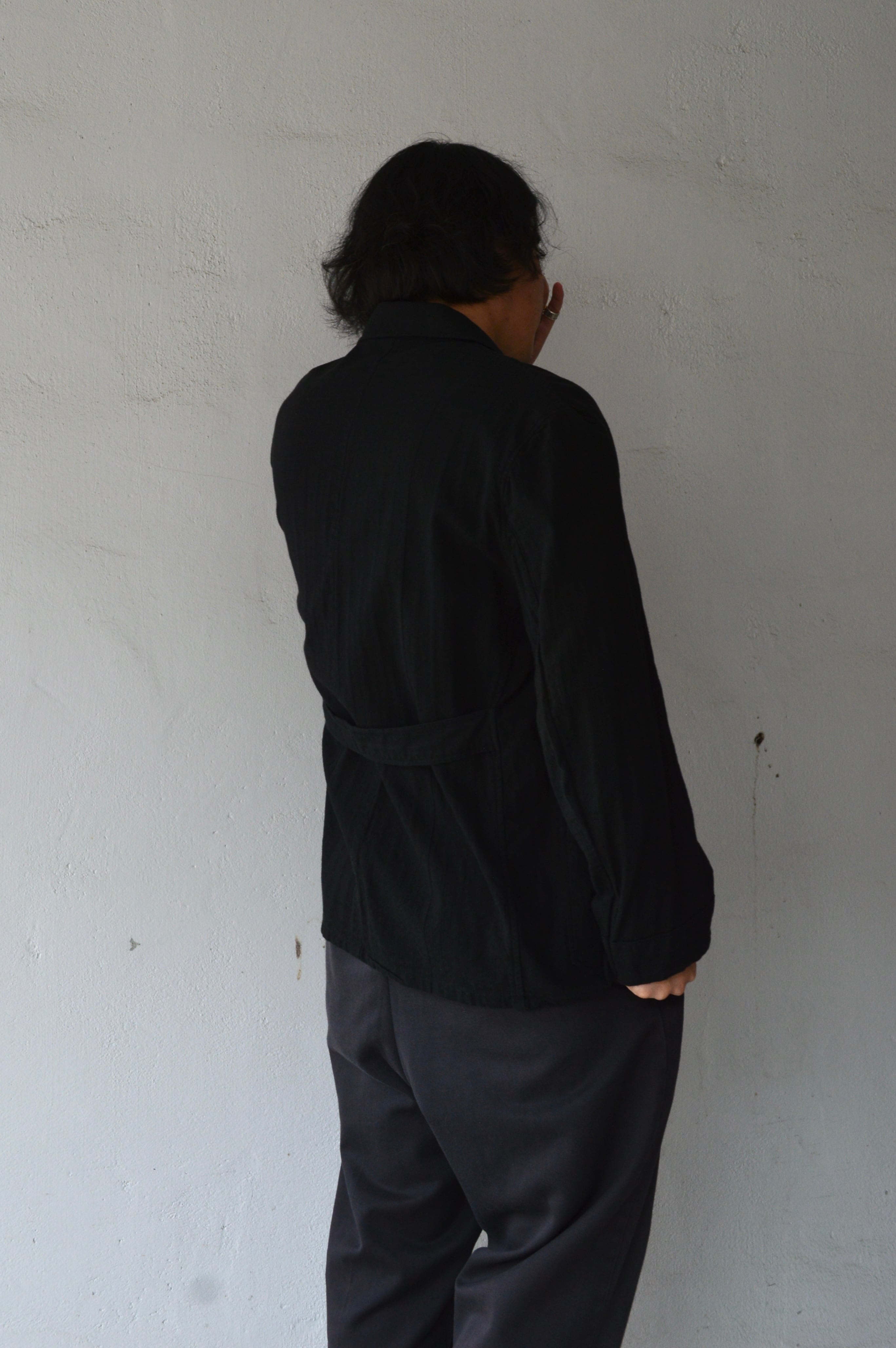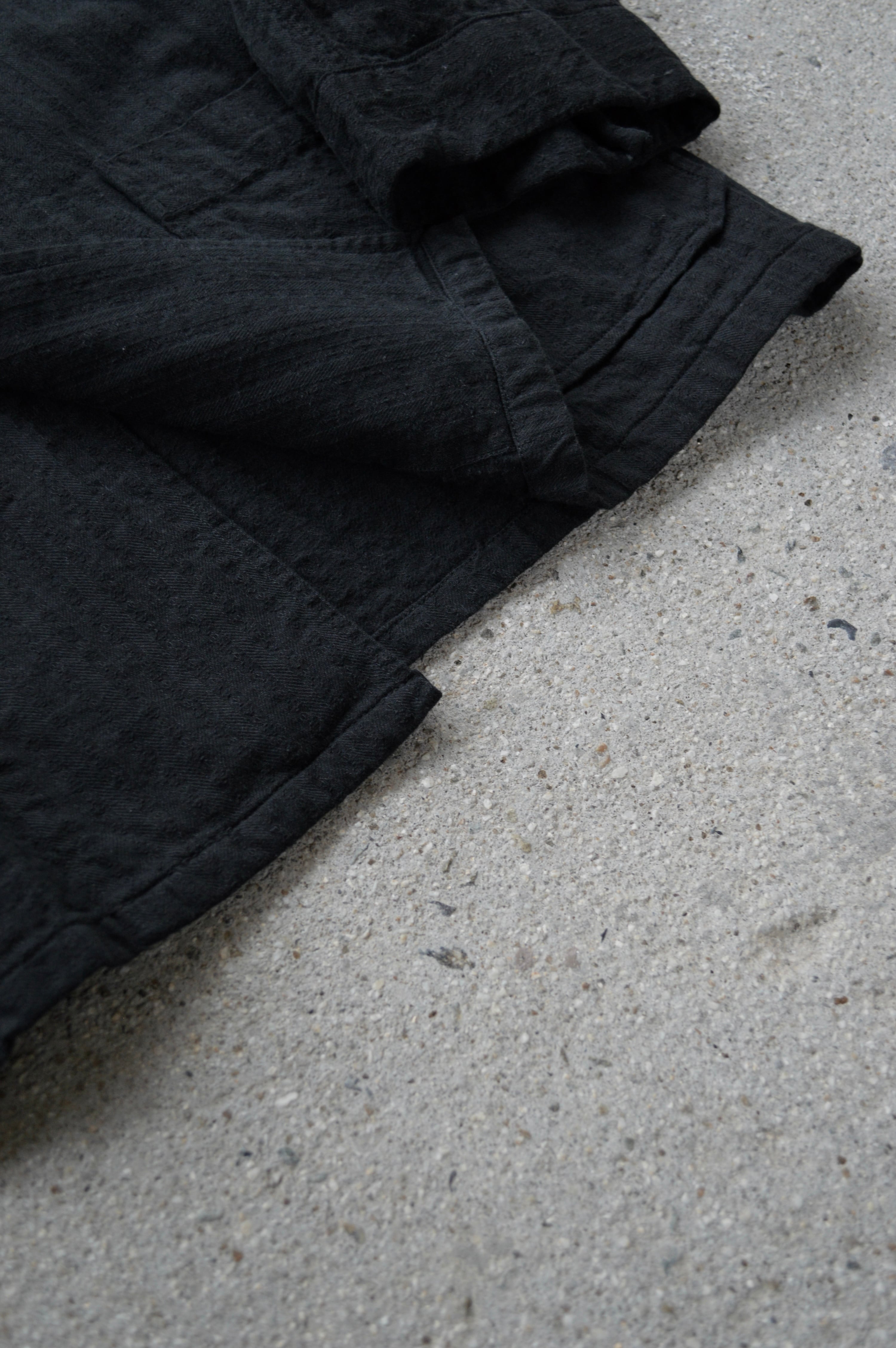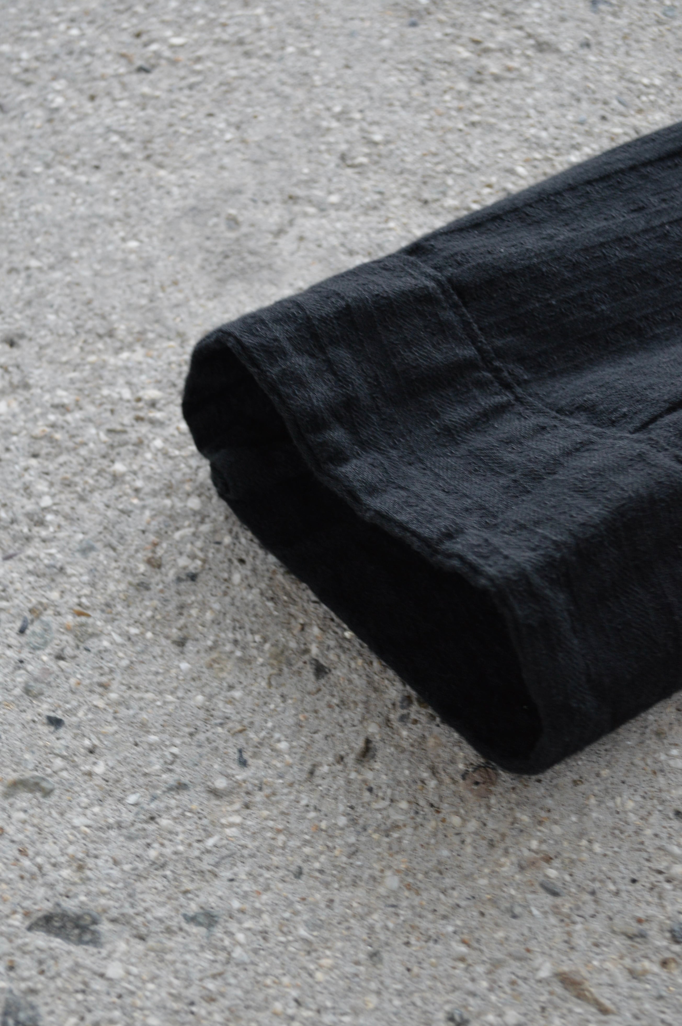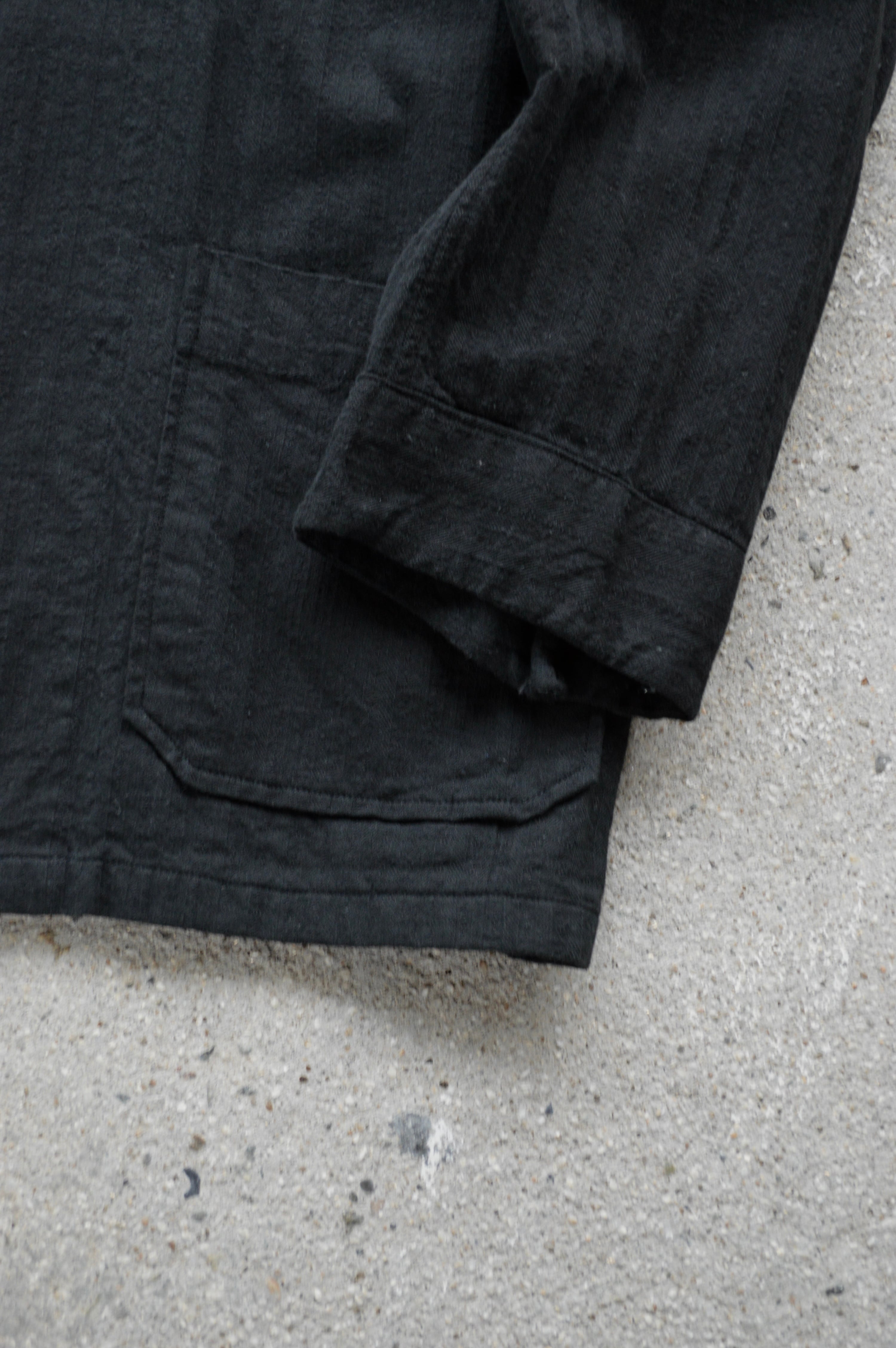 こちらはタフなコットンツイルにサッカー織りが施された素材で黒染めとして仕上げられることにより、自然体な毛羽立ちがが立体化的な表情に仕上がったスリーピングシャツ。前開きの大きめボタンが取り付けられ、軽いシャツジャケットとして活用いただける一着。