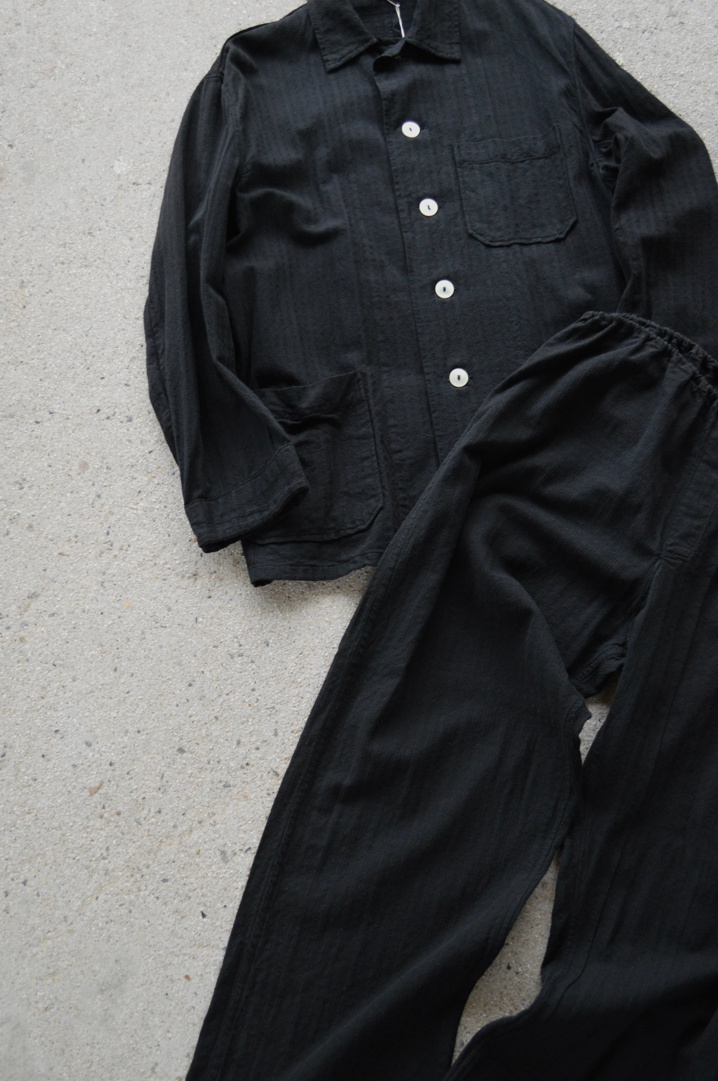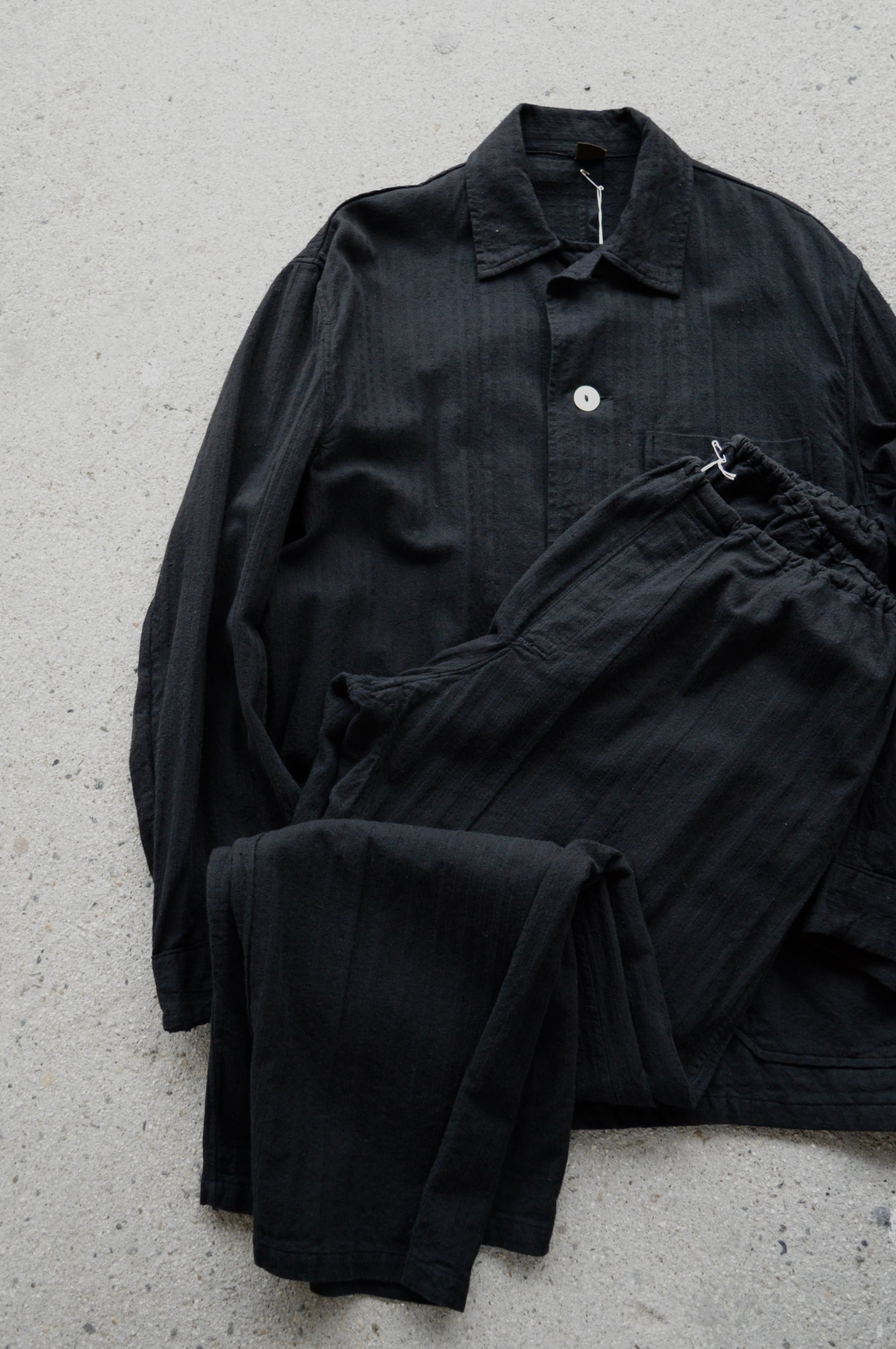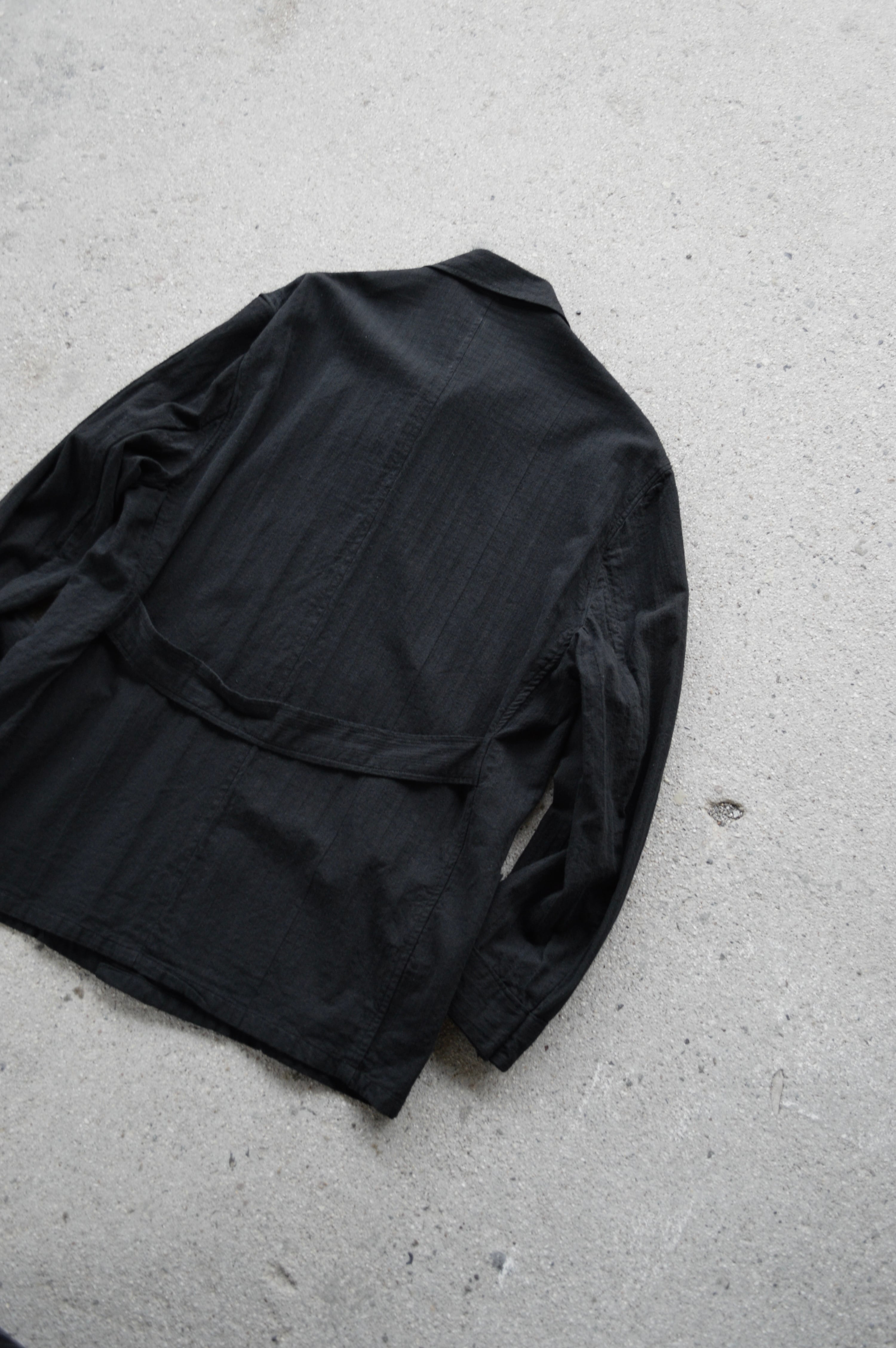 推定ポーランドのスリーピングシャツとして採用されていたストライプ調のコットンストライプクロスモデルを黒染めした製品となります。