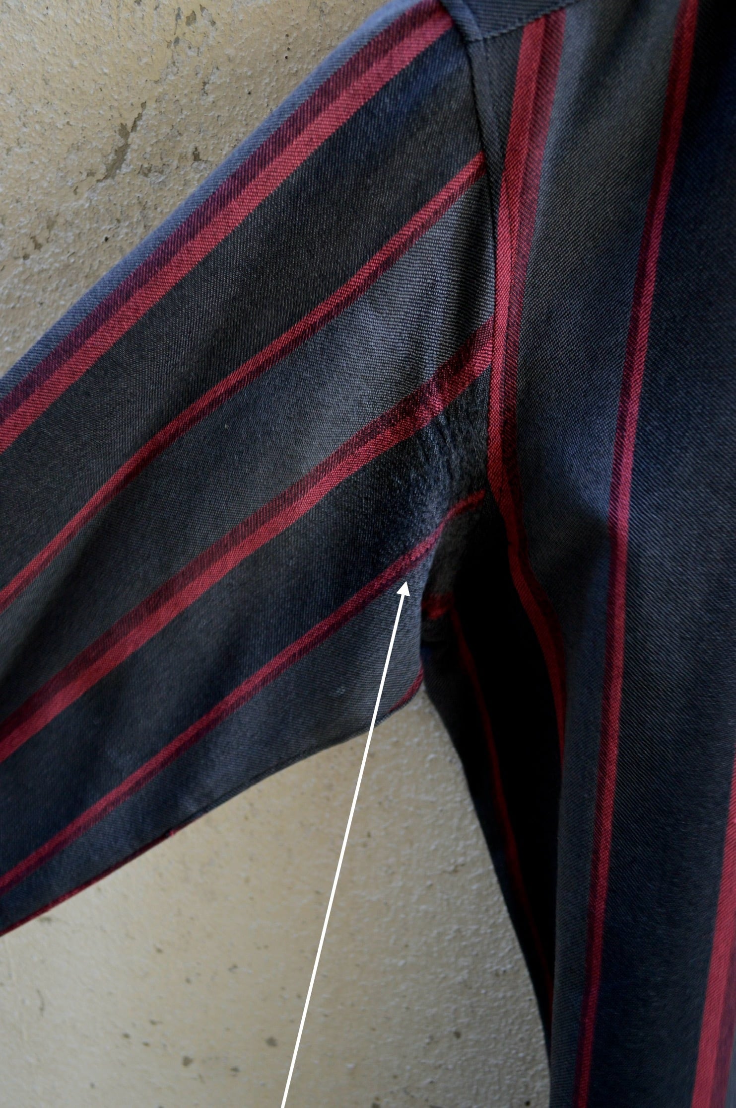 ブラックベースにチャコールとレッドの配色でランダムな太ピッチストライプが目を惹く一着。