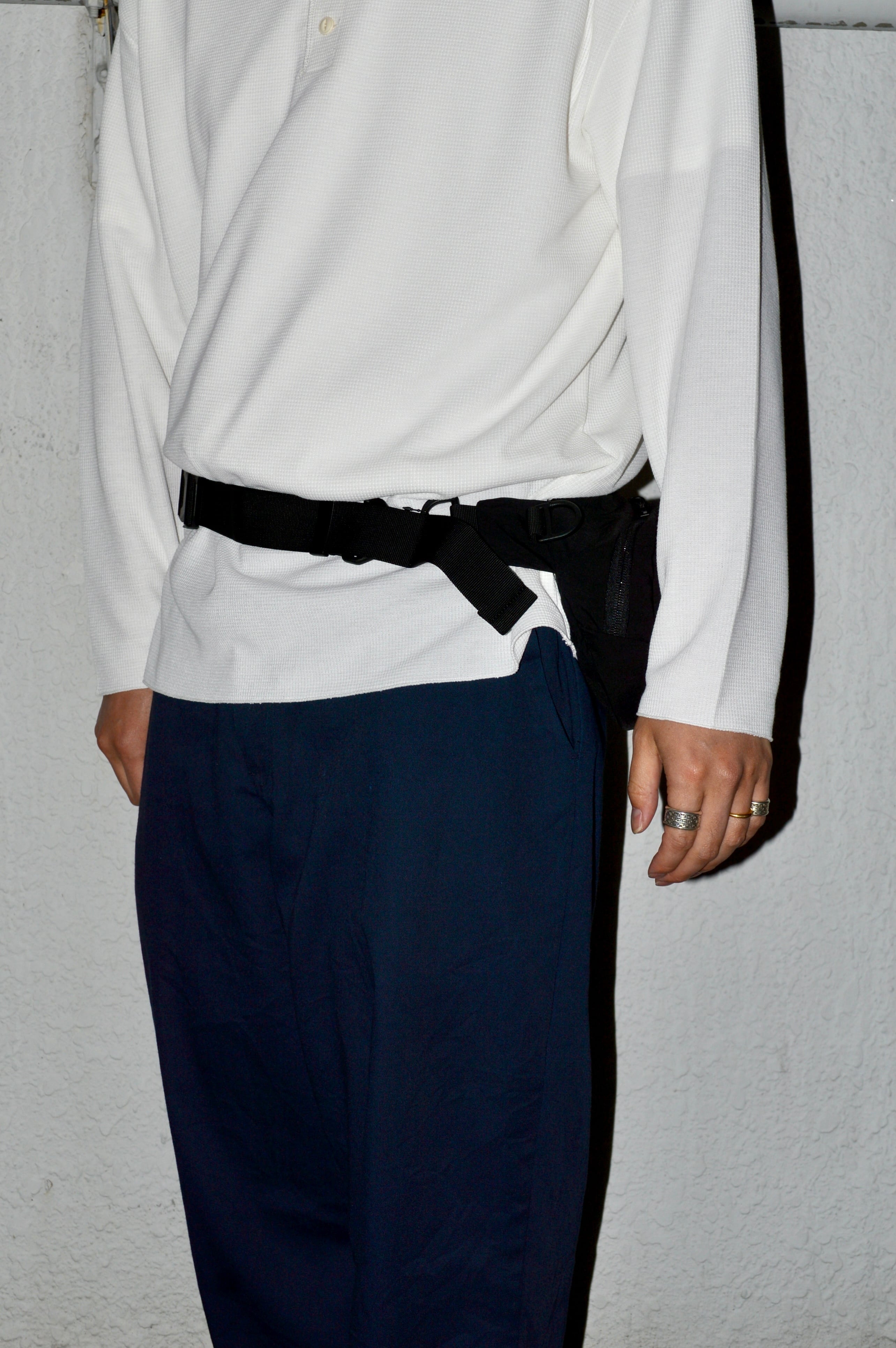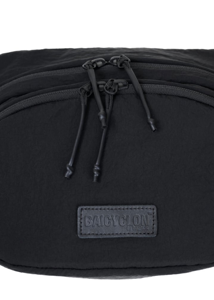 一番の特徴はBAICYCLONで人気ファブリックとなる、CORDURA NYLON OXFORD HEAVY WASHER素材を全面に使い、他デザインでも表面に採用されているAIR TIGHTNESSコーティングナイロンを浸水防止として二重構造になった贅沢な仕様。また、一般的なボディーショルダー使用からウエストボディーバッグの2WAY仕様を実現したデザイン。