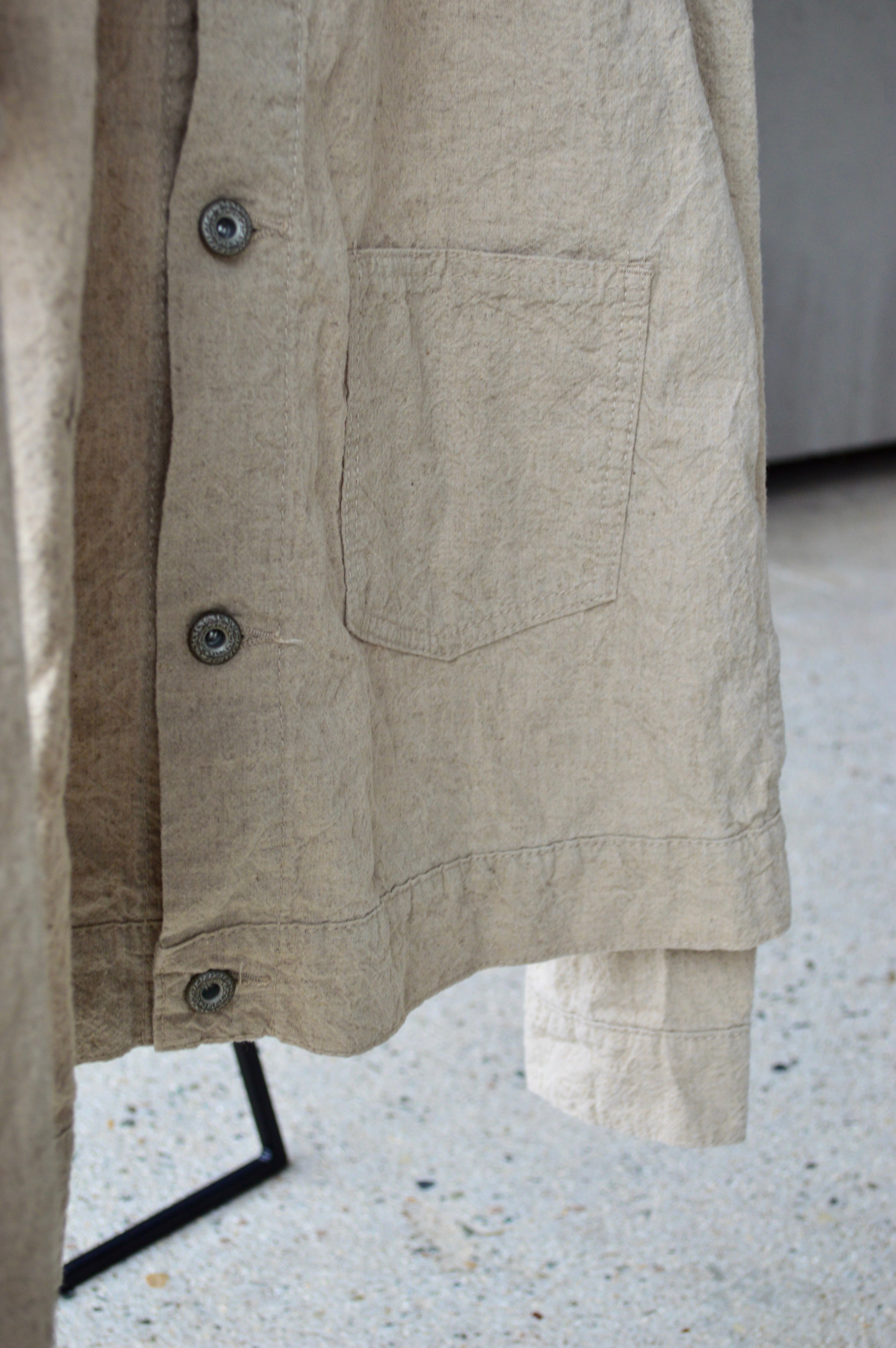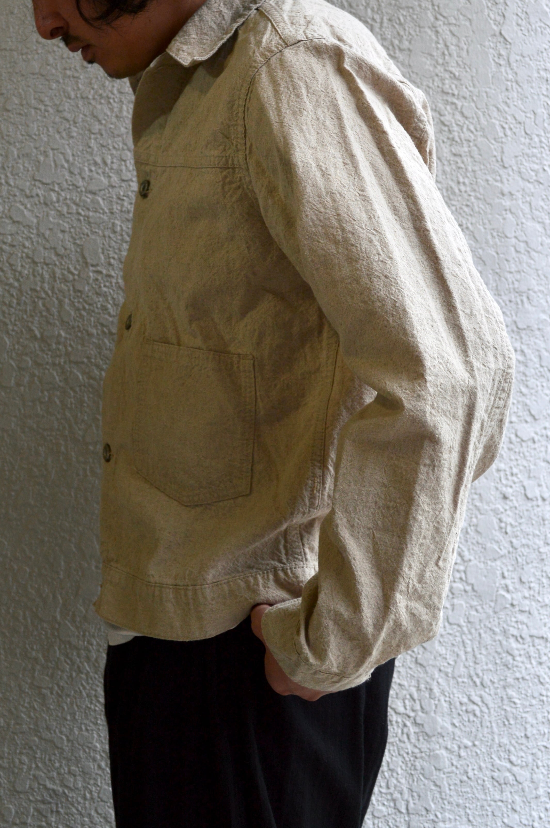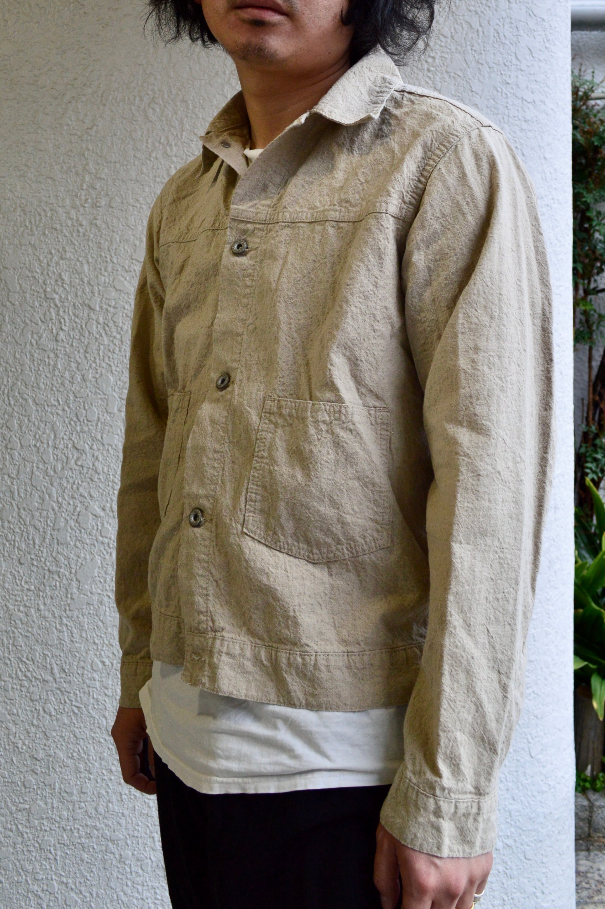 コットンリネンで織られ、天日乾燥仕上げの加工が施された独特な生地の夏用ライトトラッカージャケットです。
