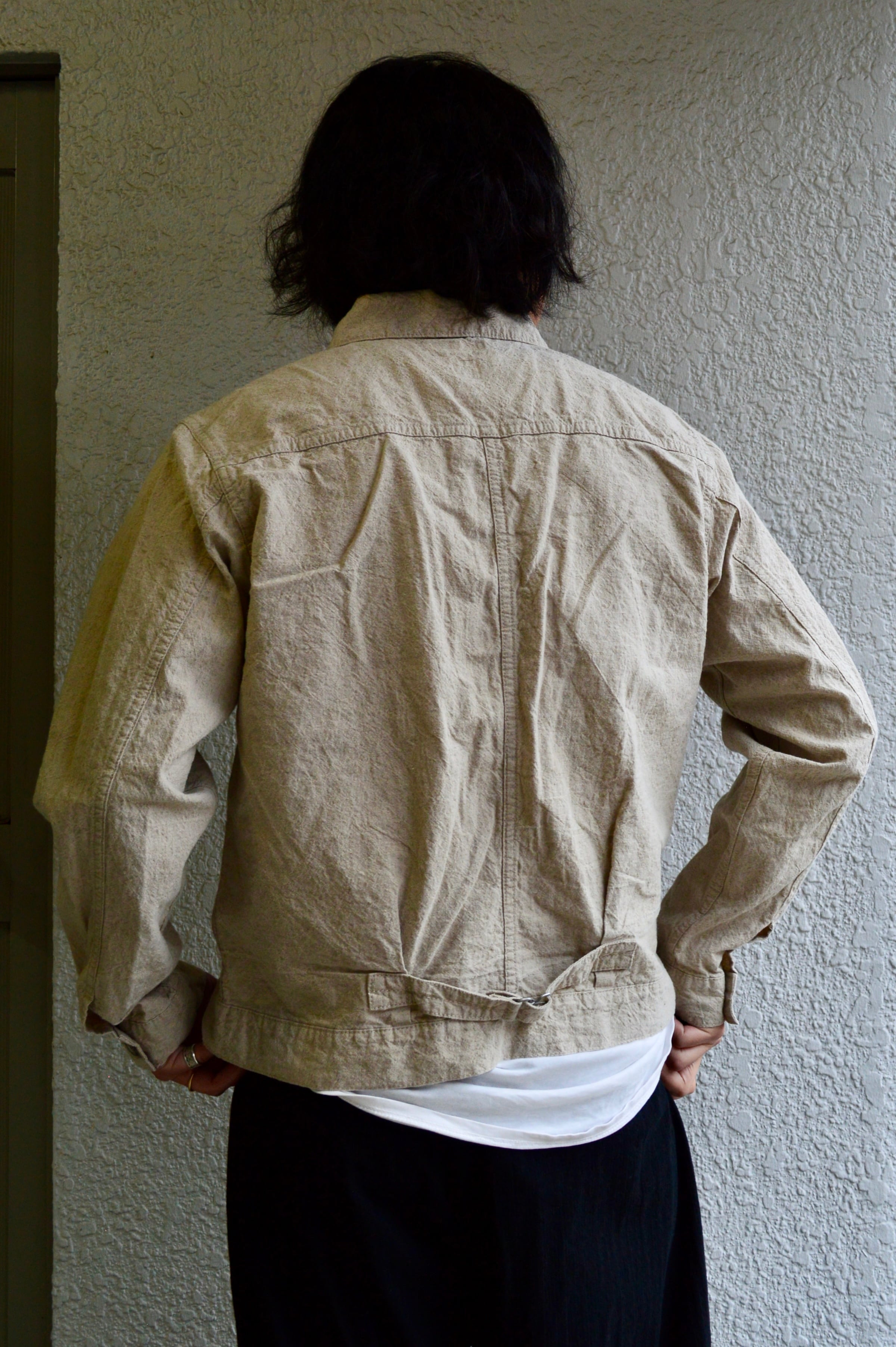 製品後、天日乾燥仕上げによる自然なシワ感が、ジャケットの雰囲気をより一層引き立てられた質感。
