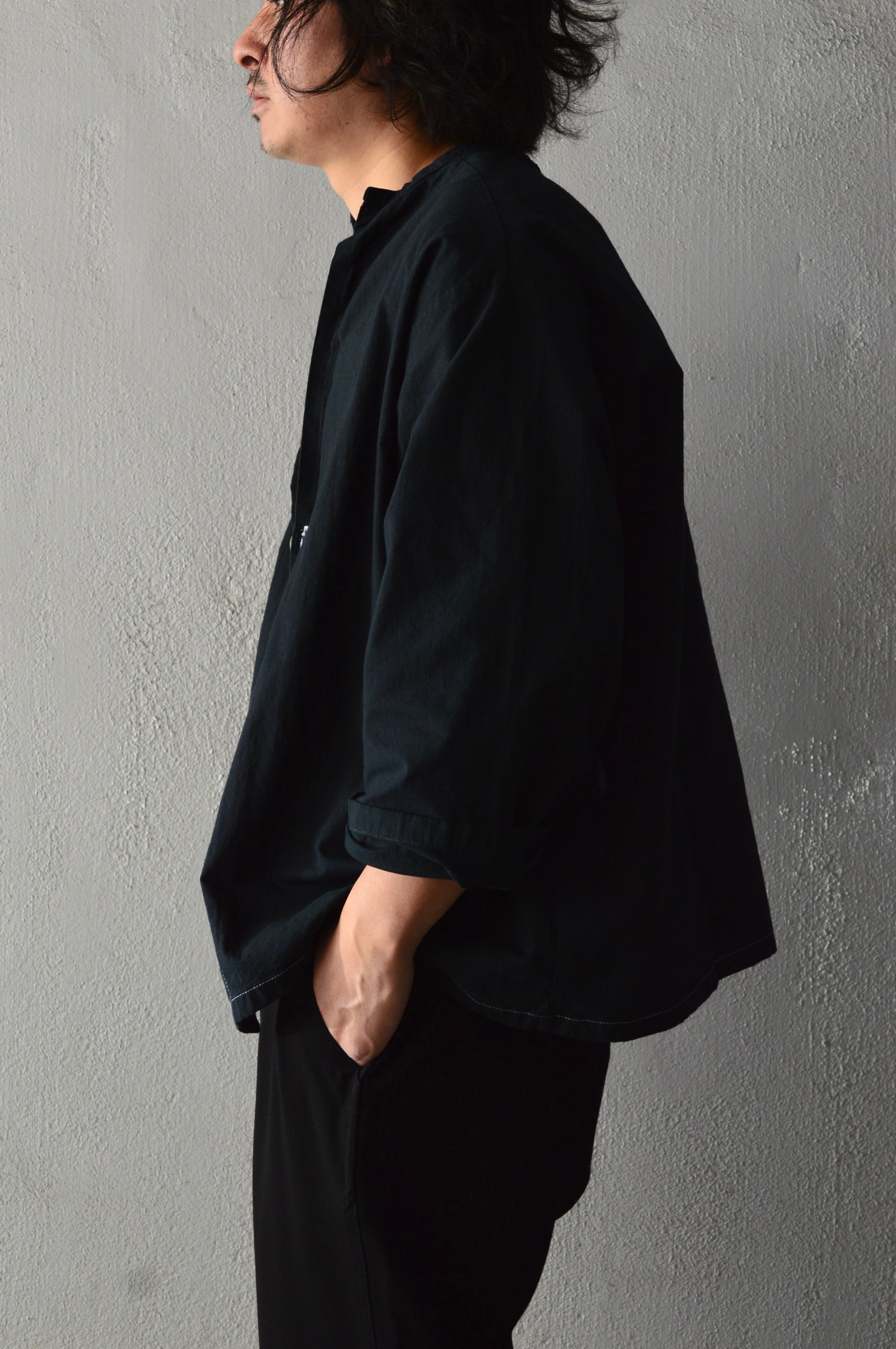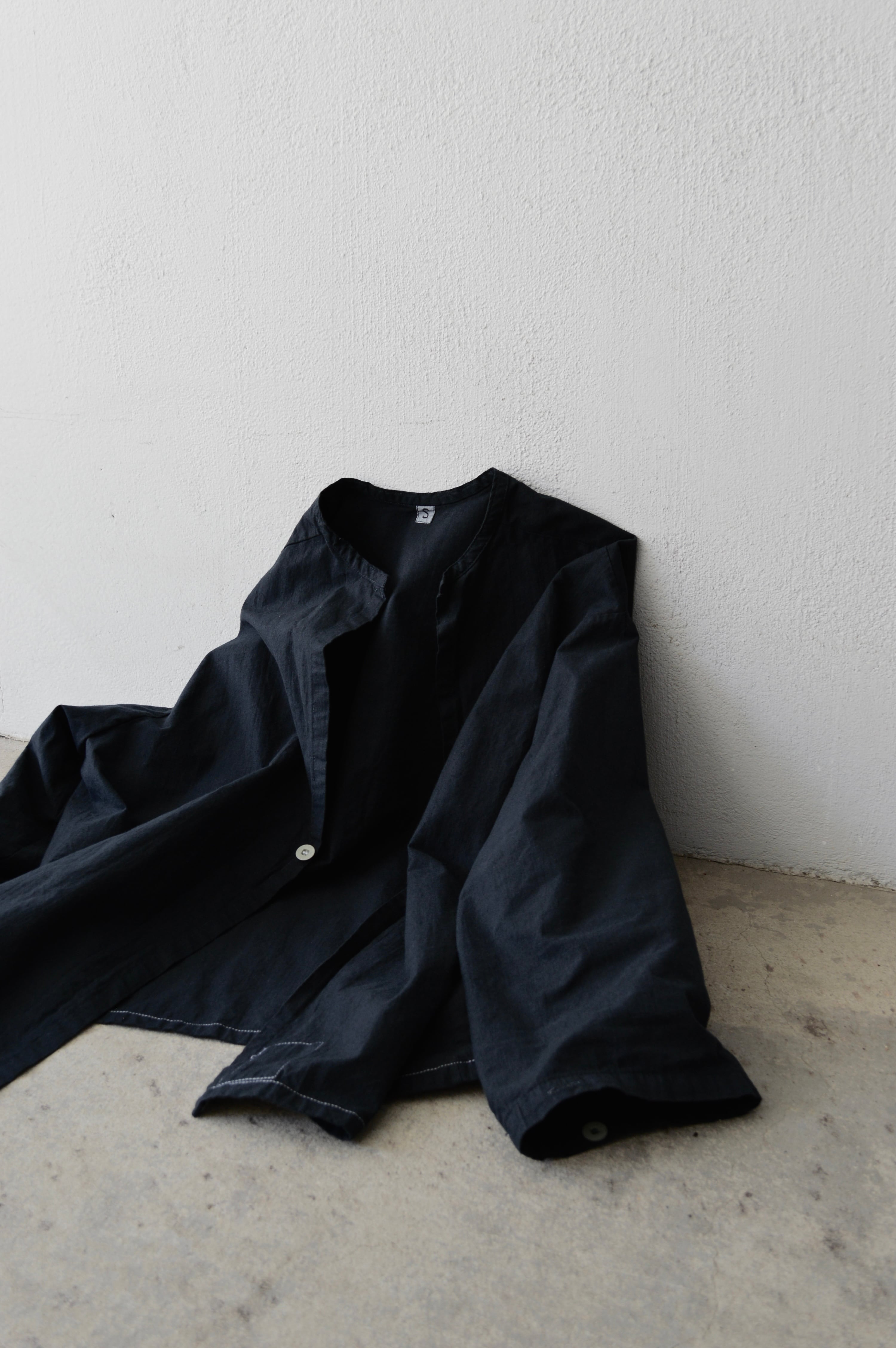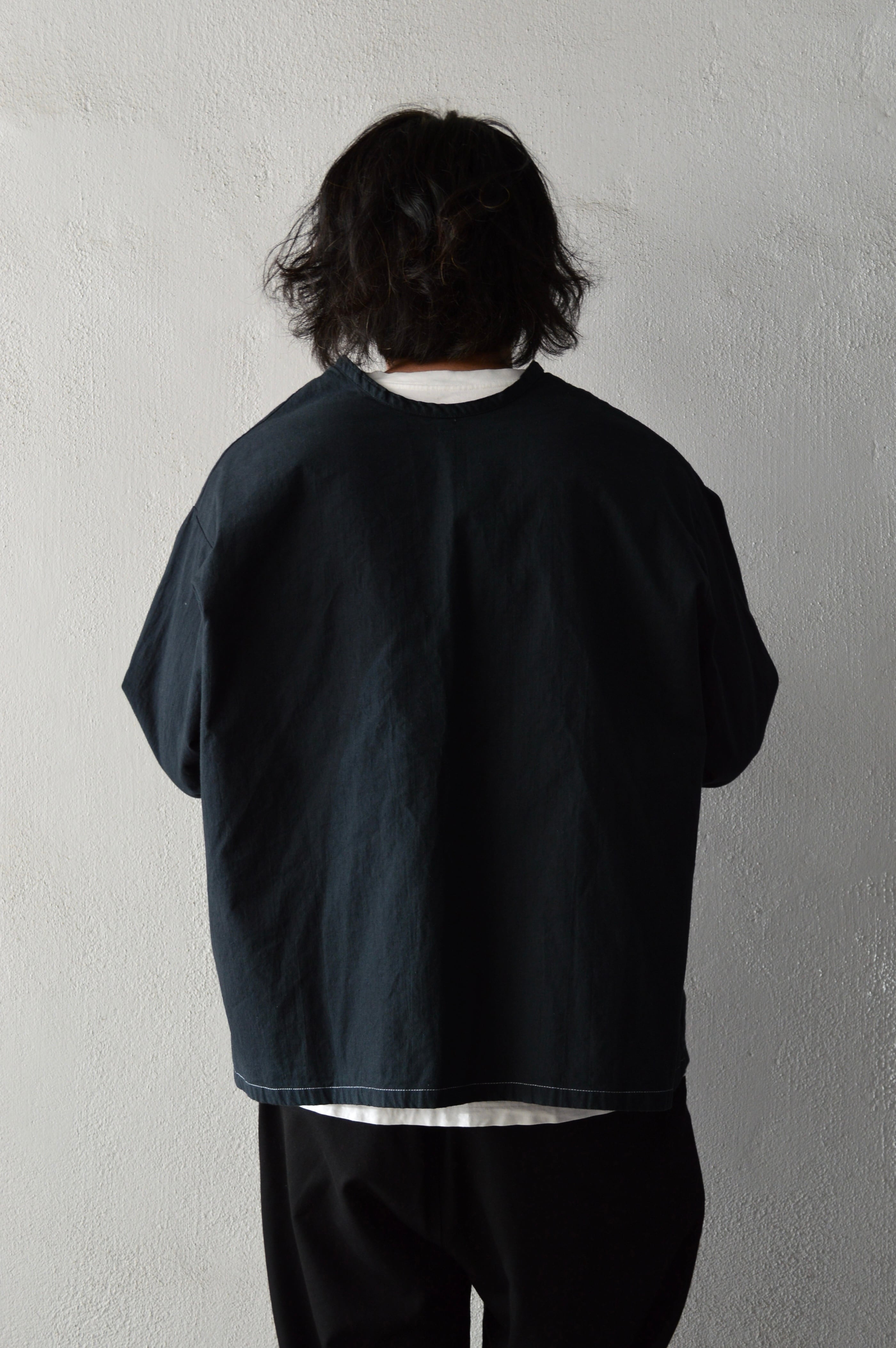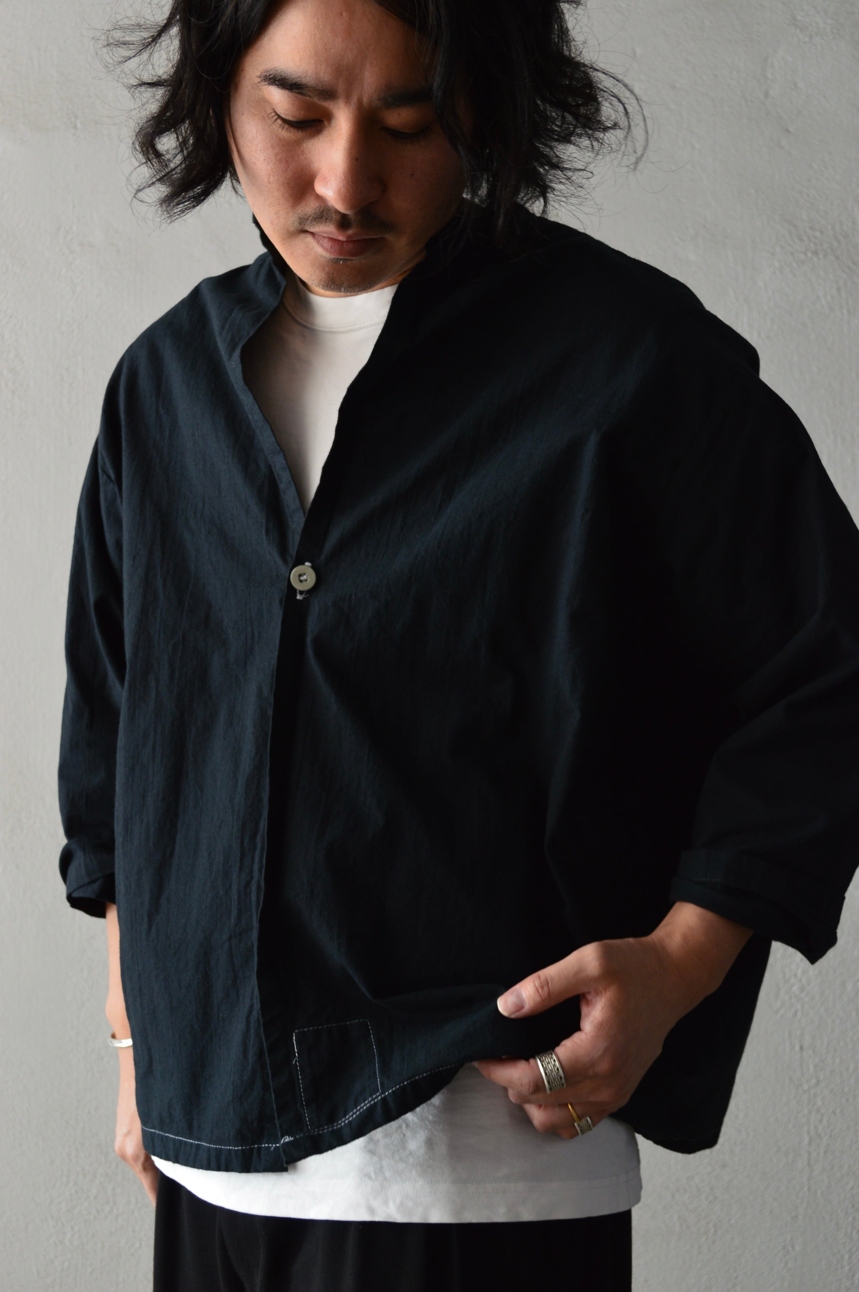 フロントはワンボタンを施した気楽なシャツとなり、袖丈は9部丈のルーズな抜け感あるアームホールも特徴。