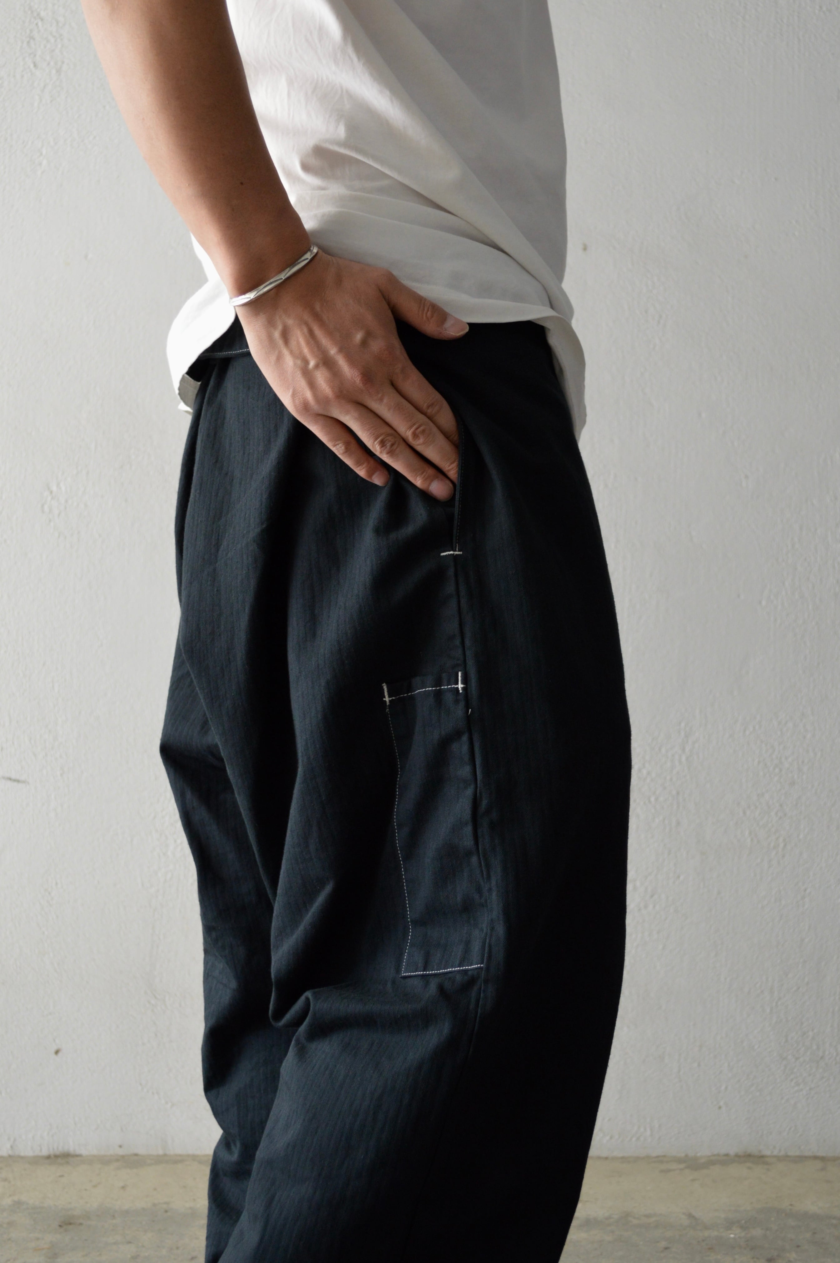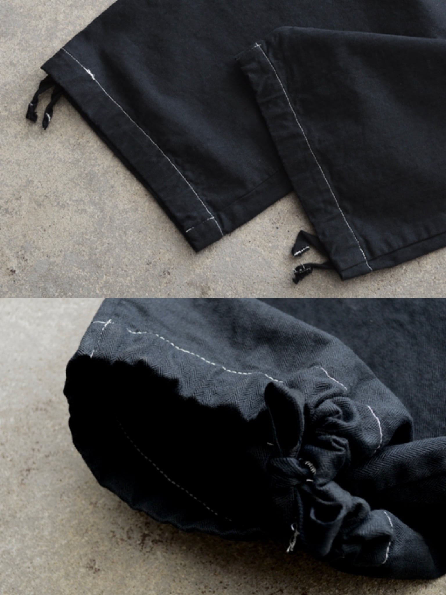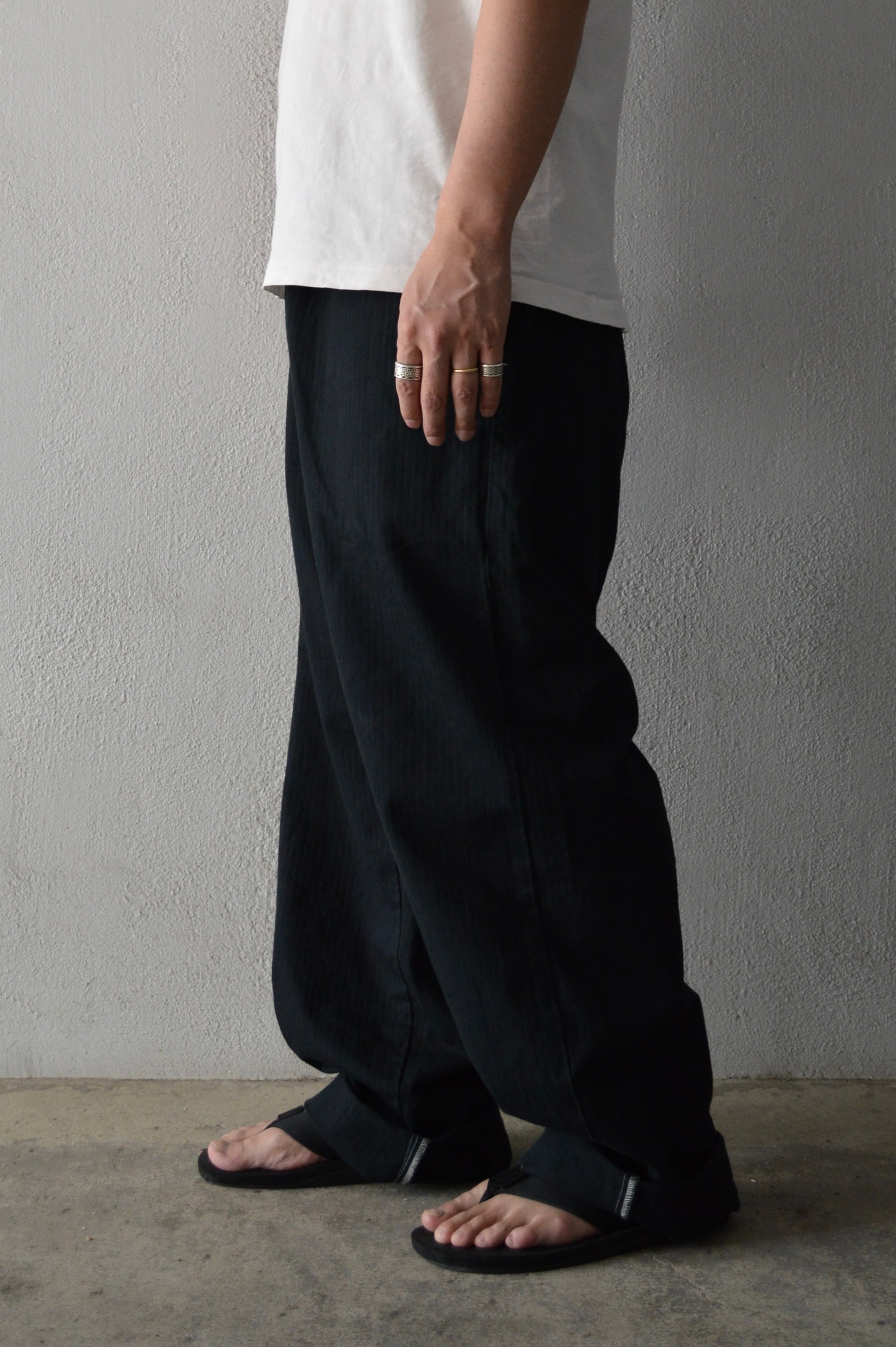 非常に大きなウエストつくりでワンサイズものになり、背面ベルトを絞ると、腰回りから裾に向かって袴パンツのような極太ワイドなシルエットが特徴。
